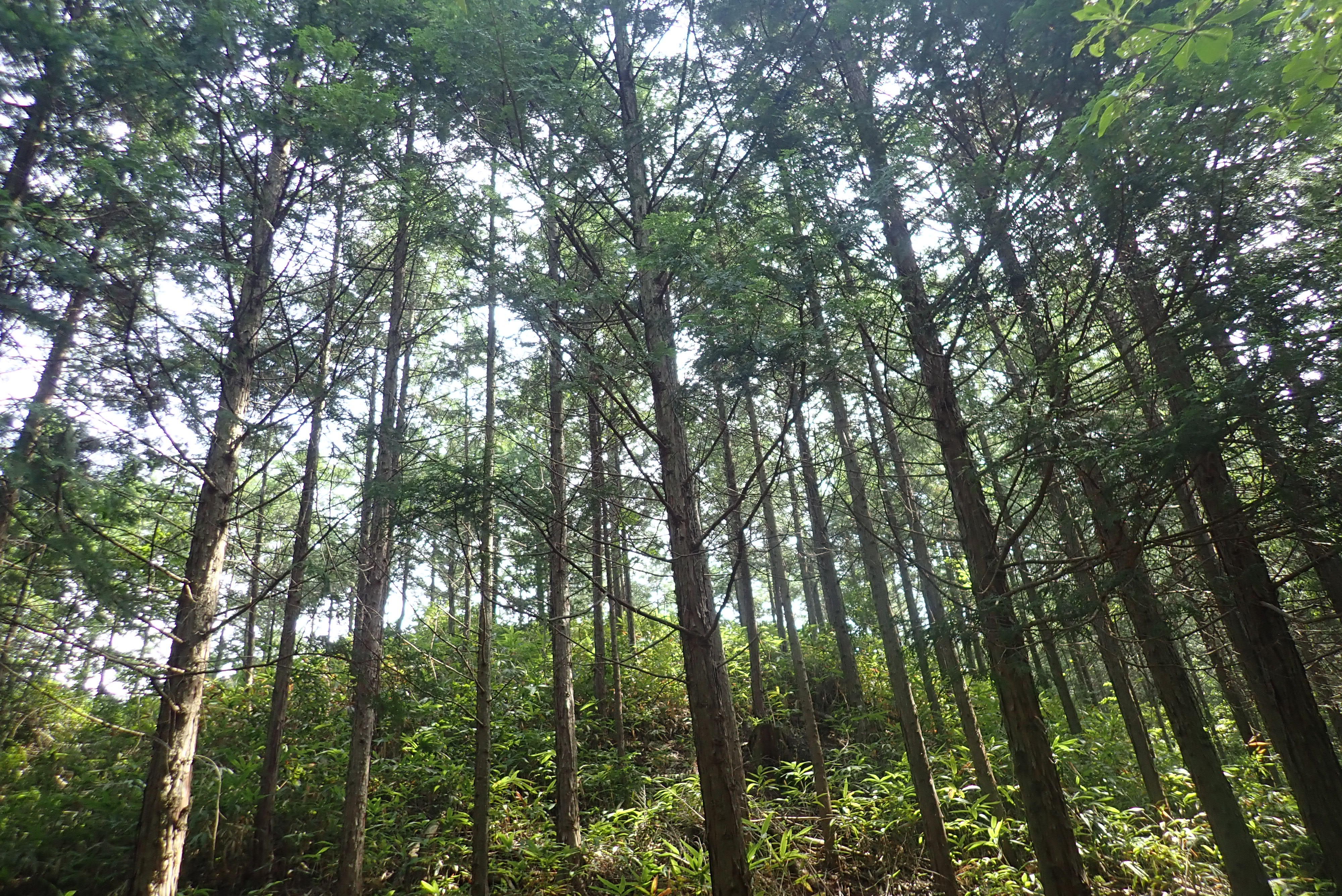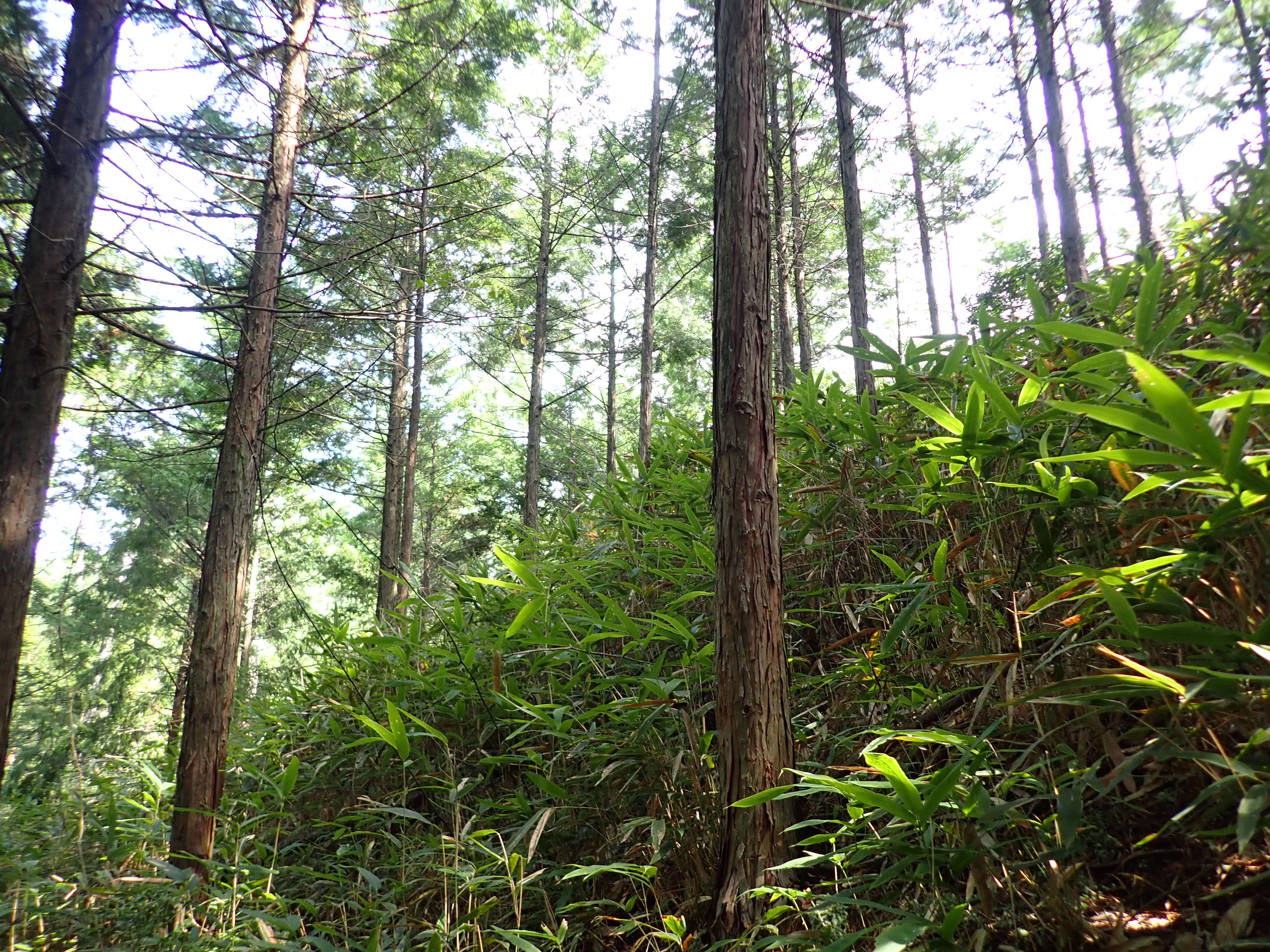 【2022年現地調査】 ・植栽したヒノキは順調に成長 ・尾根部にアカマツ、斜面にヒノキが自然発生木しているほか、下層にはササの中にヒサカキ、ソヨゴ、サルトリイバラなどで覆われている |