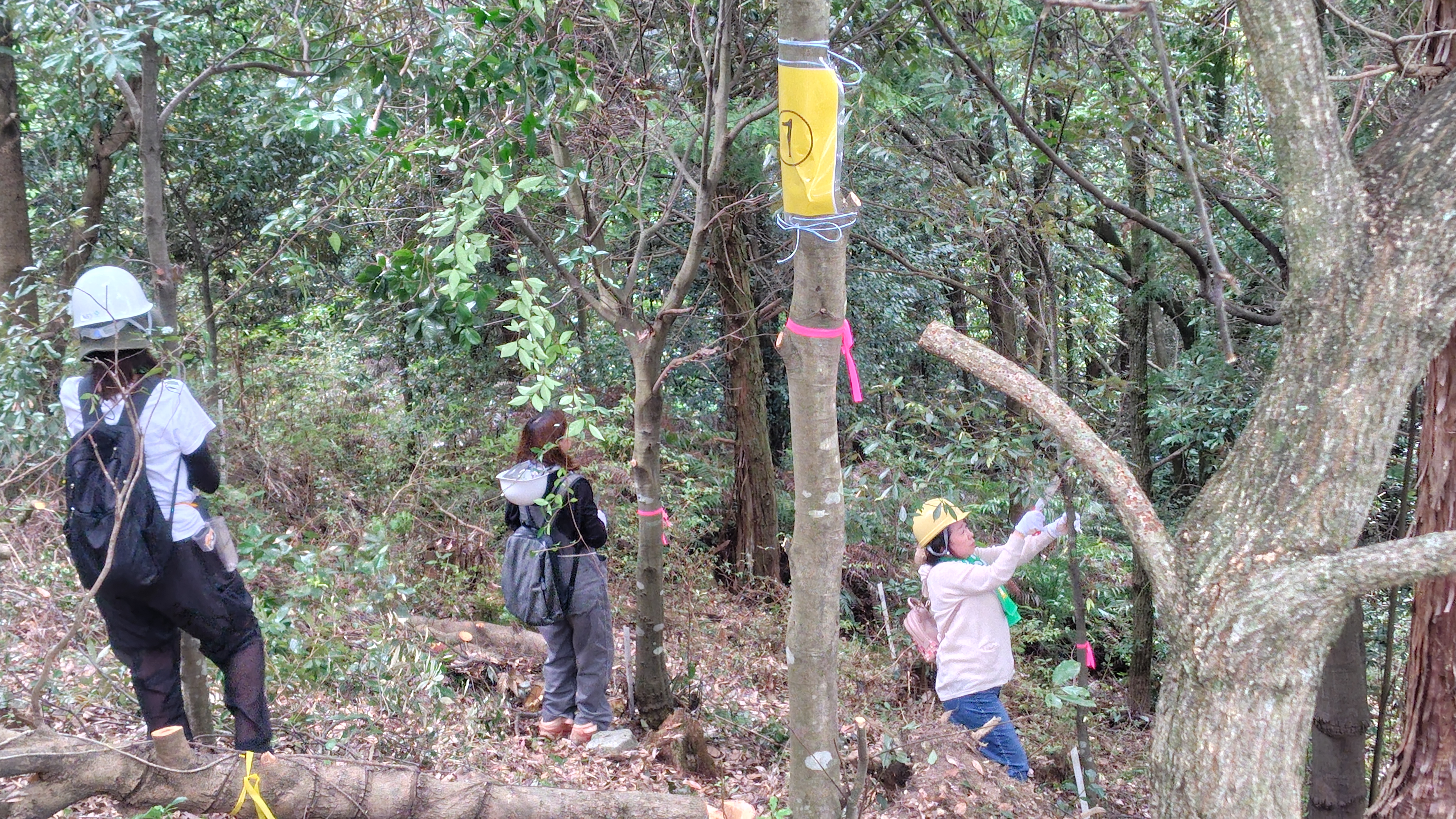 備考 | 【2024現地調査】 ・市道に沿って長く伸びる森で、春には地元の皆さまのお花見の場所にもなっている ・植栽したヤマザクラ、クヌギ、イチイガシは適度な密度で順調に成長 ・クス、タブ、シロダモ、ハゼ、ヤブツバキなどが自然発生 |