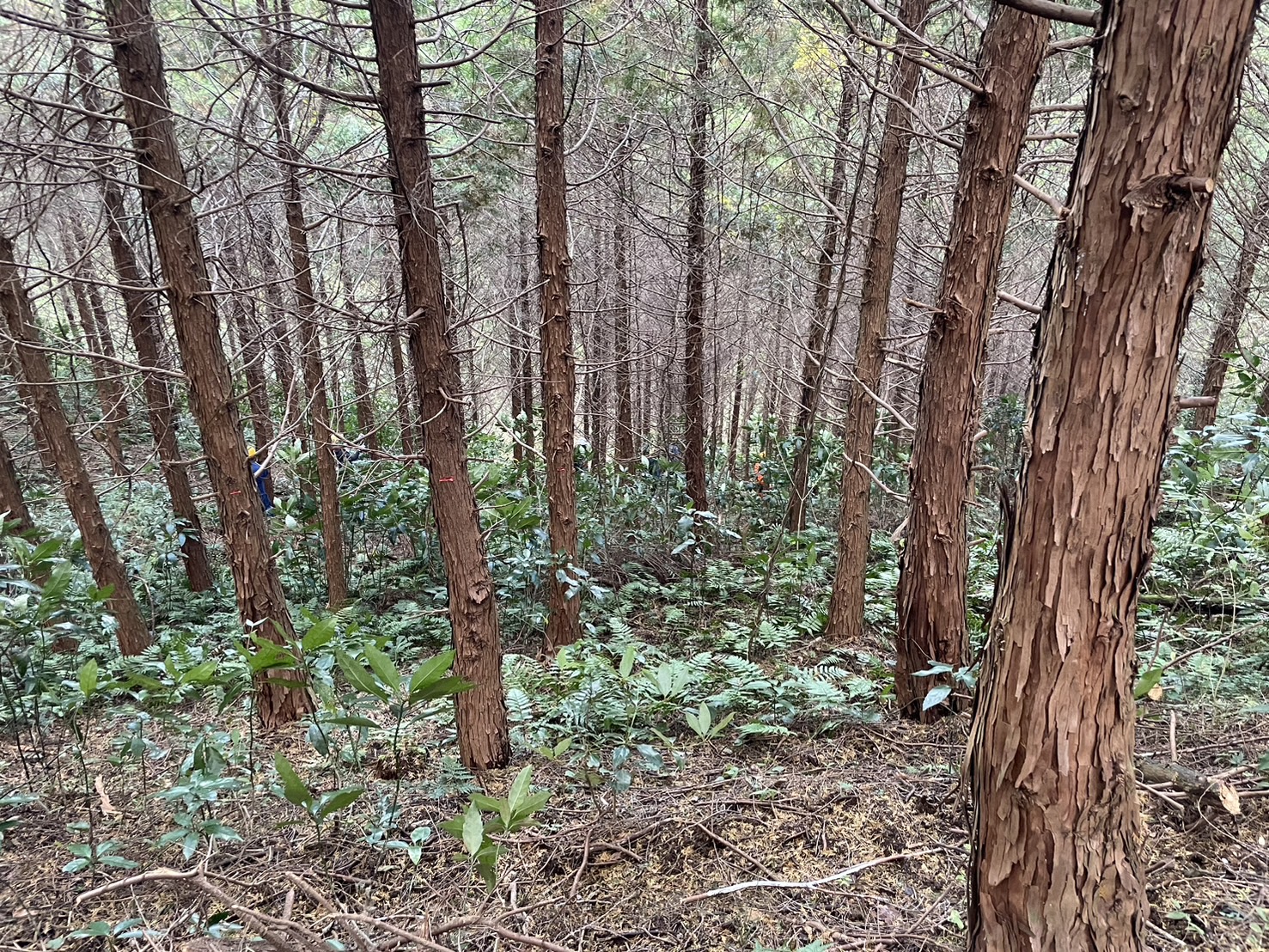 備考 | 【2023現地調査】 ・尾根部の平坦部にヒノキ、斜面の上部にコナラ、下部にイチイガシを植栽した森 ・植栽木の残存率が高く順調に成長している。 ・ヒノキ区域では林床の植生が乏しいが、コナラ、イチイガシ区域ではスダジイ、シラカシ、サカキなどの自然発生木が多い。 |