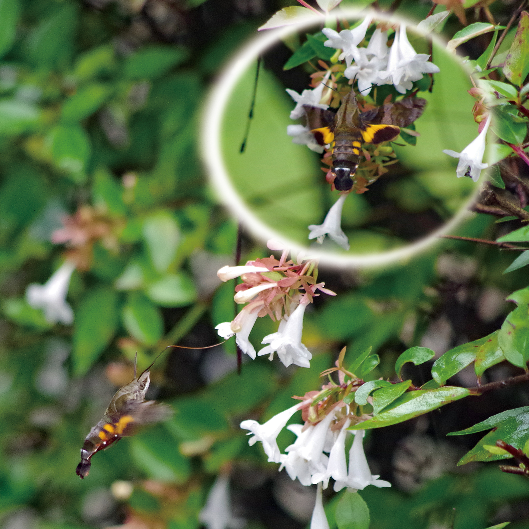 ハチドリのように空中で静止して長い口吻で蜜を吸う姿を知っている人の中には、ファンも多いかと思います。スズメガの仲間で昼に活動します。腹の先端(しっぽ?)は独特な形をしていて、毛のたばになっています。ぱっと見ると鳥の尾羽のよう。