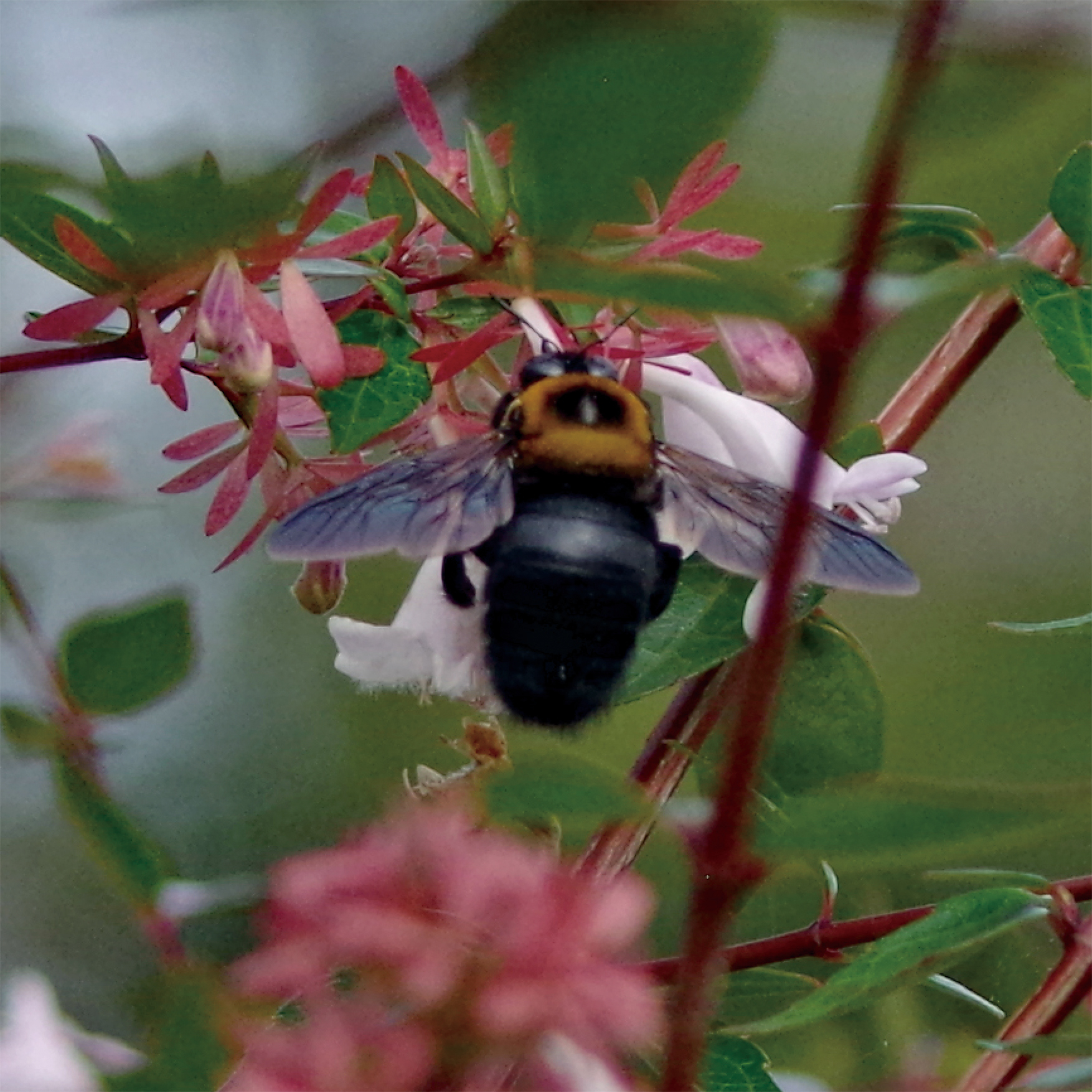 大きくて、ブーーーンと恐ろし気な音を立てて飛んでいる真っ黒いハチ・・・それだけで怖がられることが多いクマバチですが、ハナバチの仲間です。主食は、花粉や花の蜜。ただし、頑丈な顎と太い口吻を持っているため、お行儀よく蜜を吸うだけではなく、盗蜜も常習犯!