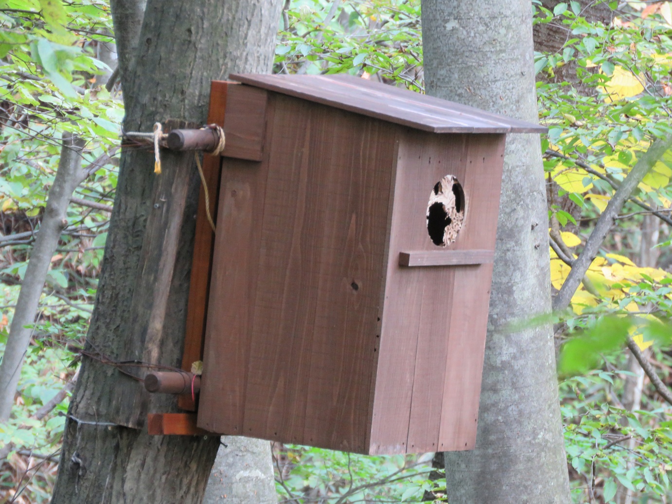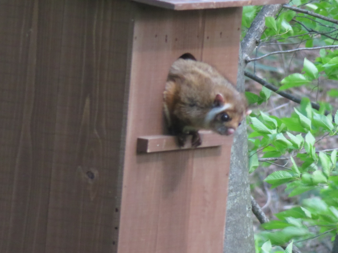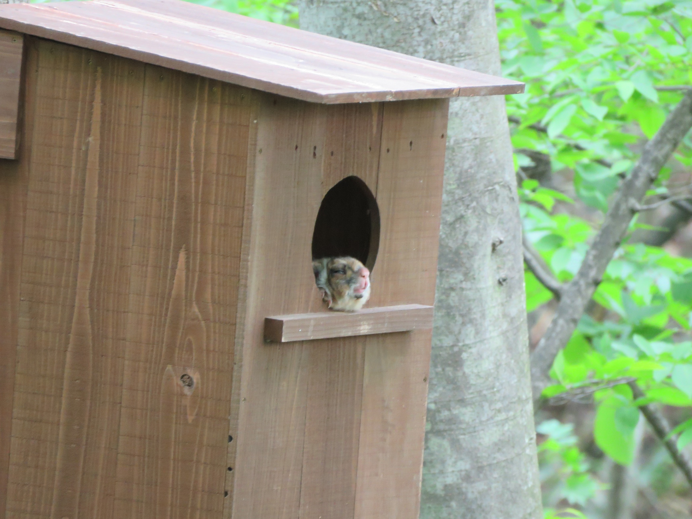 野鳥の森にかけたフクロウの巣箱に入っていたのは、「ムササビ」でした。今年新しく架け替えたばかりのフクロウの巣箱、まさに「新築物件」を真っ先にご利用いただきました。