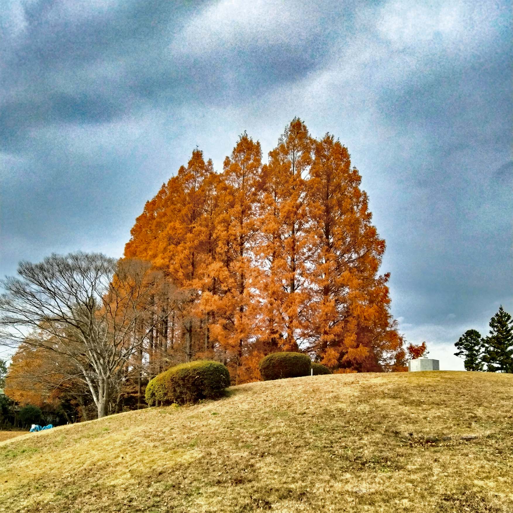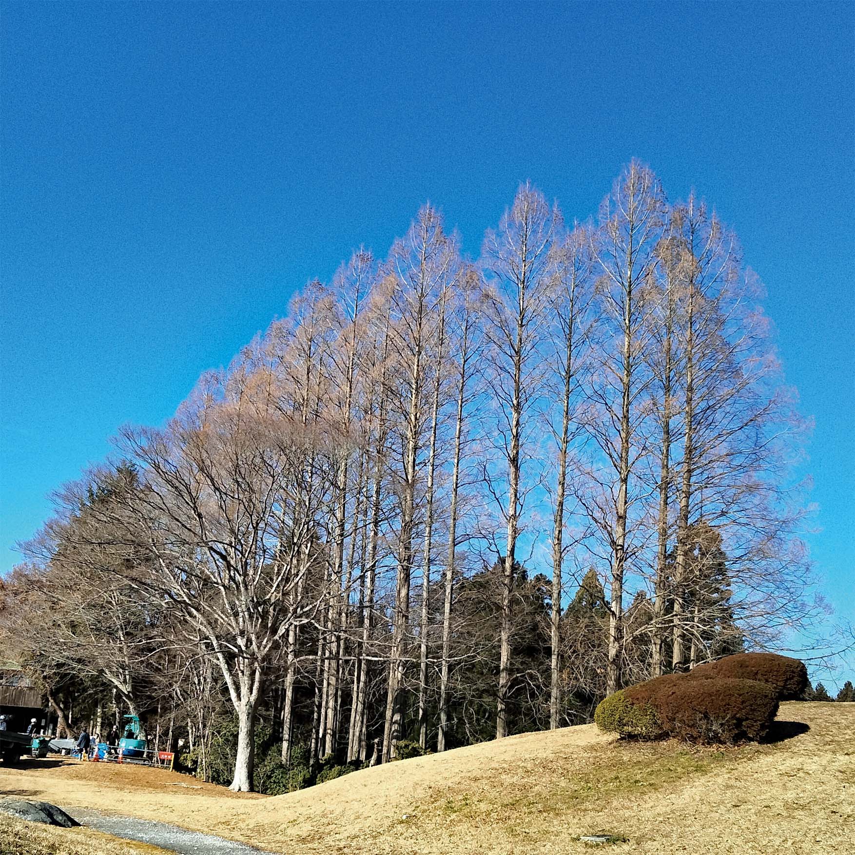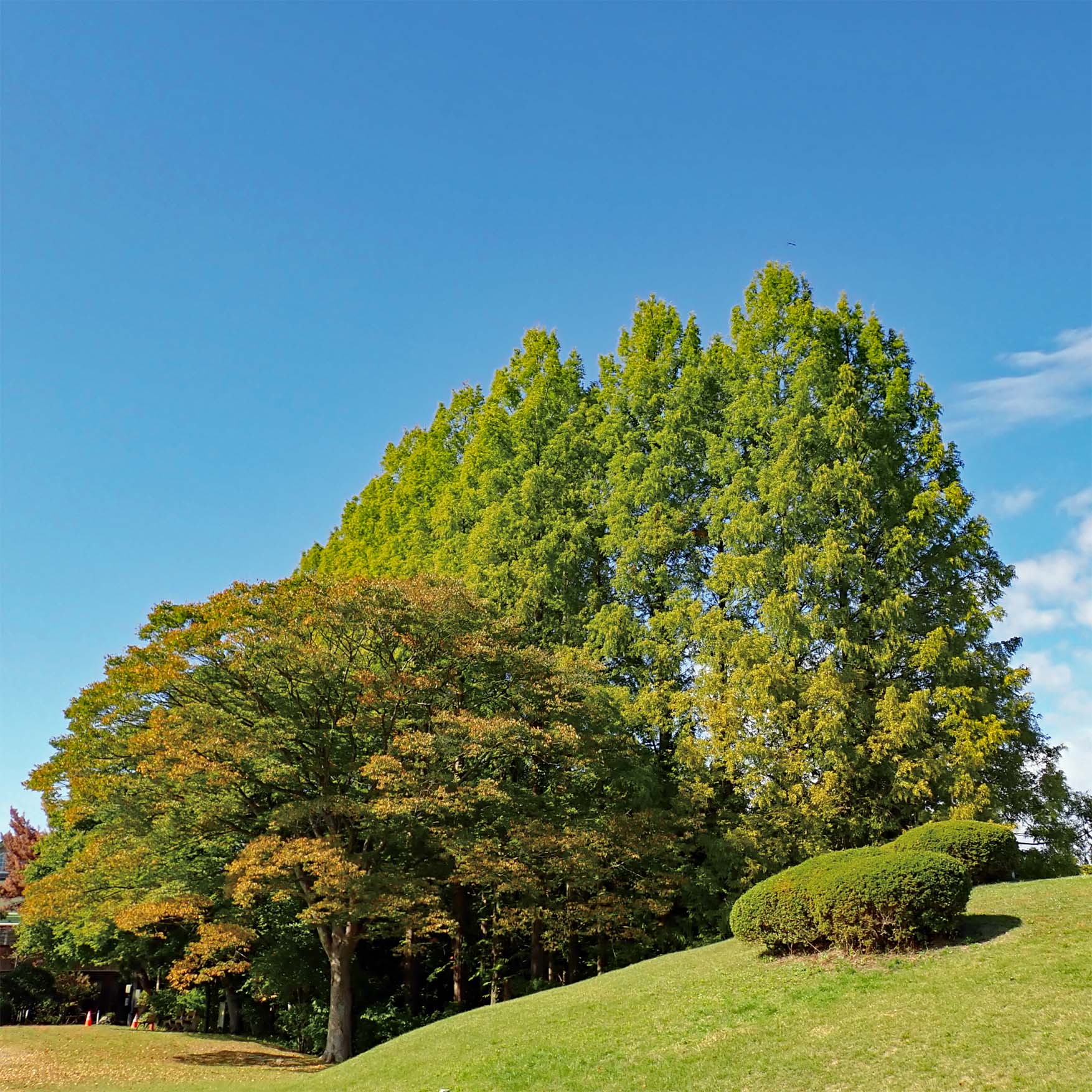 宮城県県民の森の芝生広場を見守るように数本のメタセコイアが植栽されています。