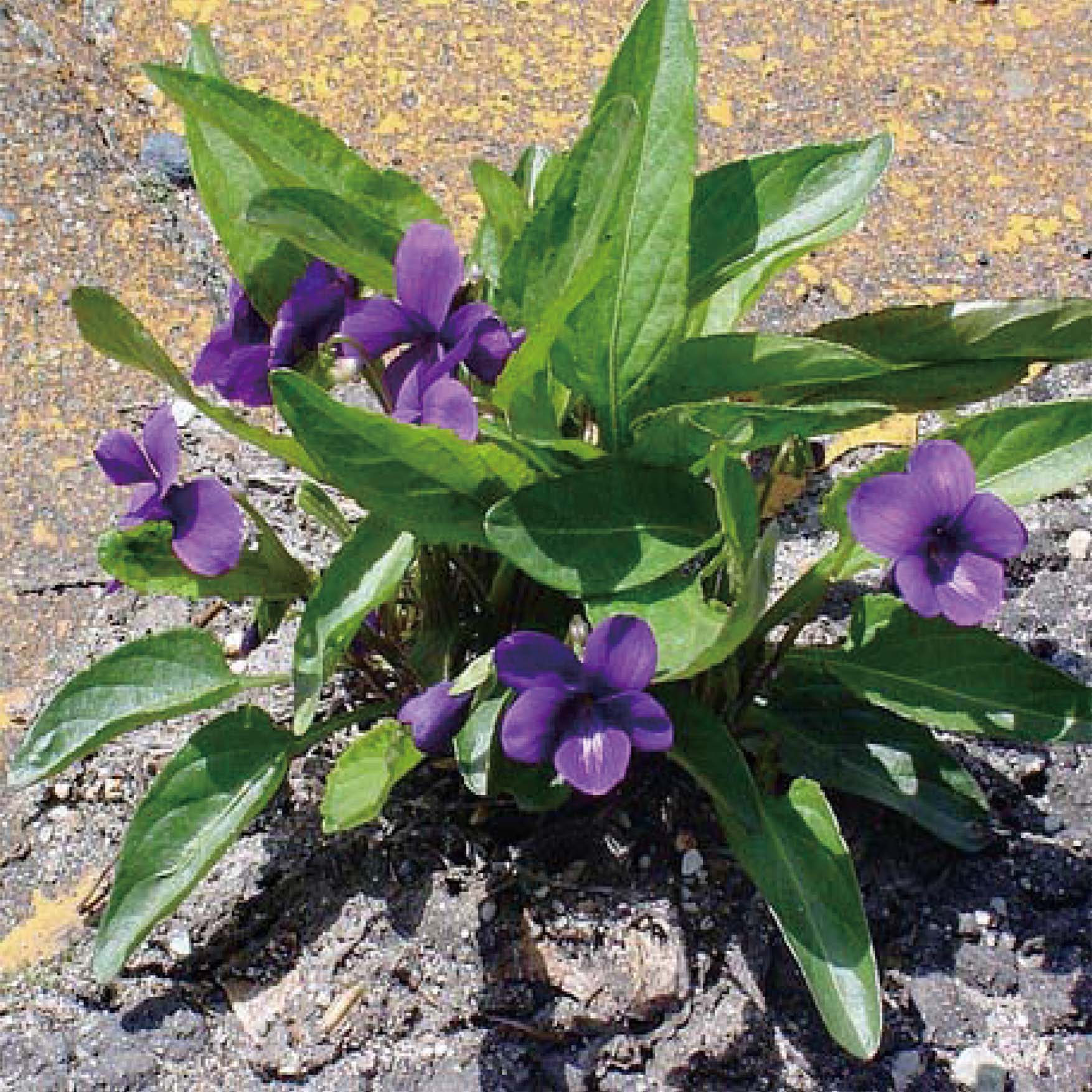 とてもよく見かけるスミレ。ハート形の葉。茎を立ち上げて、たくさんの花をつけます。