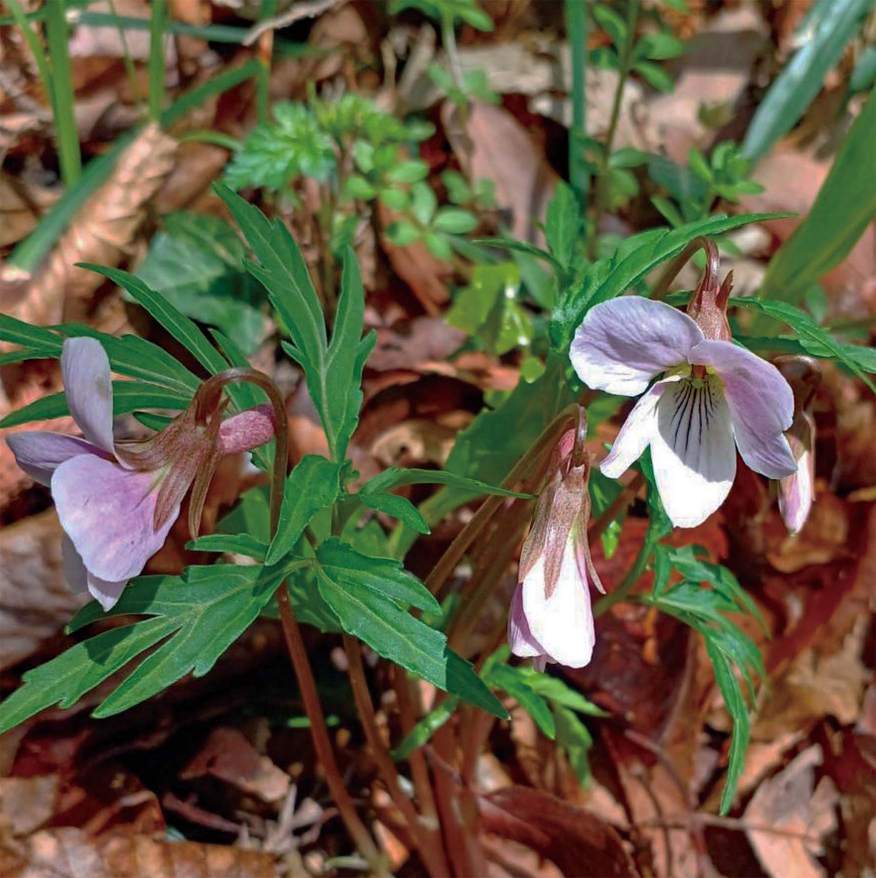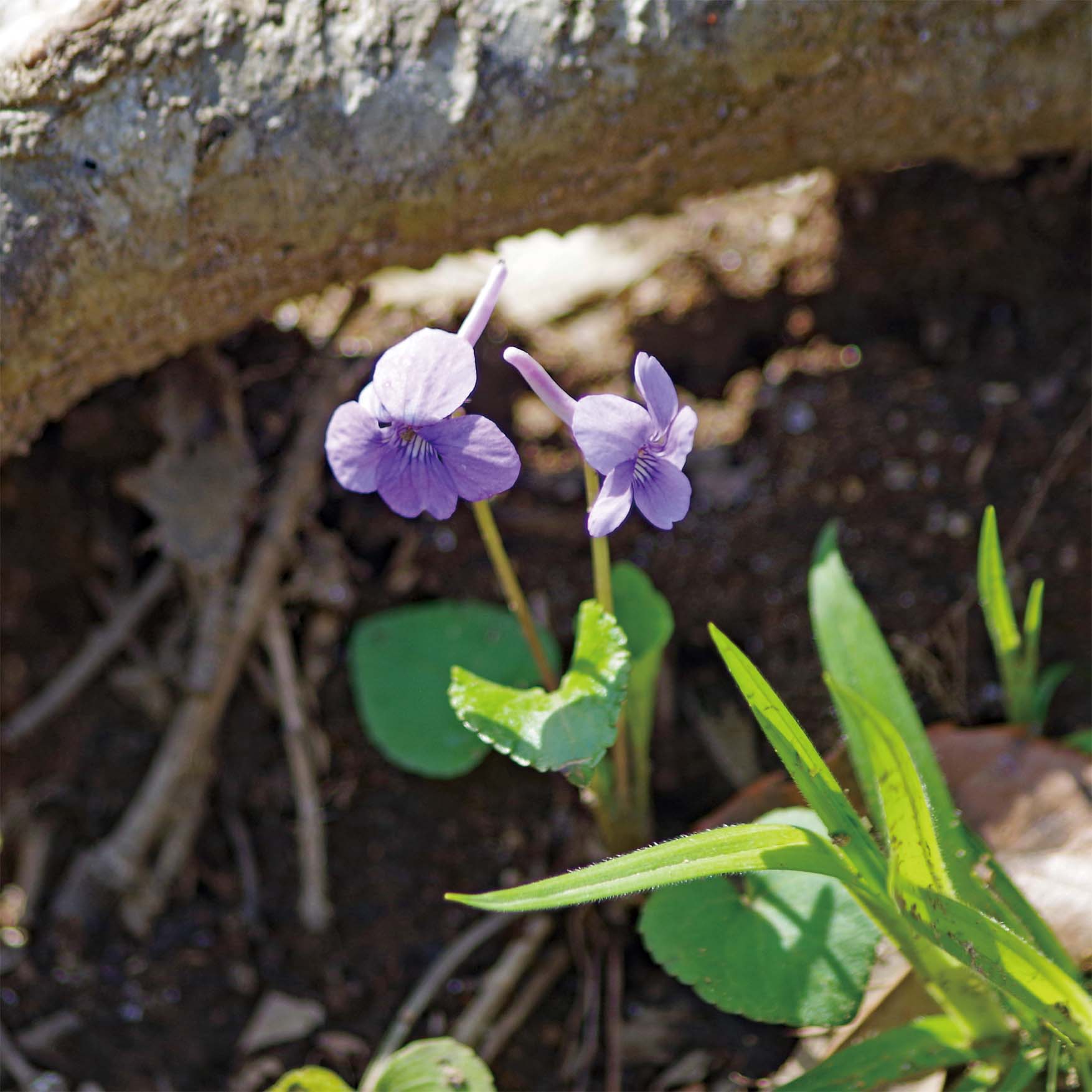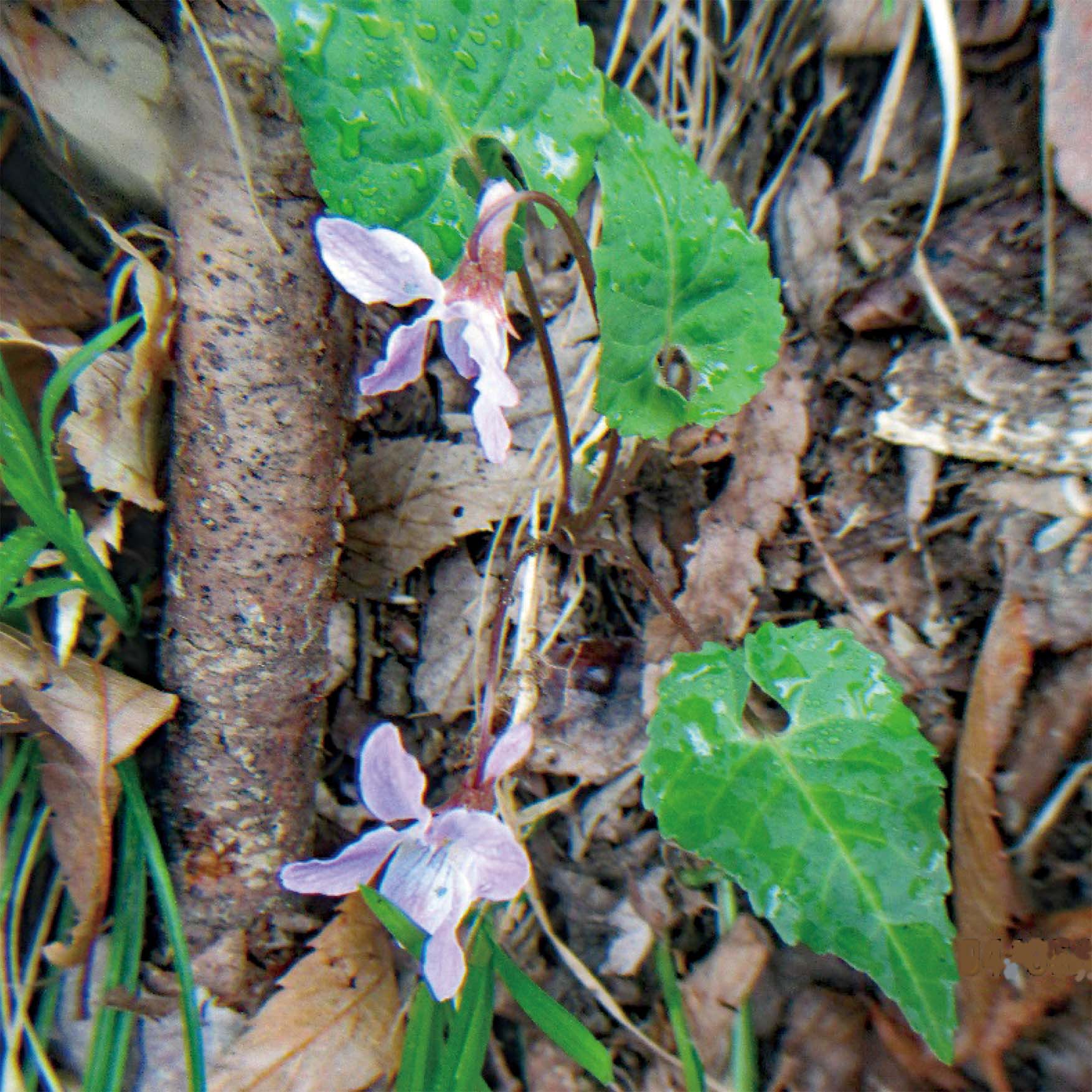 スミレらしからぬ三列に裂けたキクの様な葉を持っています。短めの茎に、ふんわりとかわいらしい花をつけて、人の目を引きます。とても良い香りがするのですが、地面に近い所に咲いているので、匂いをかぐのは難しいかも・・・