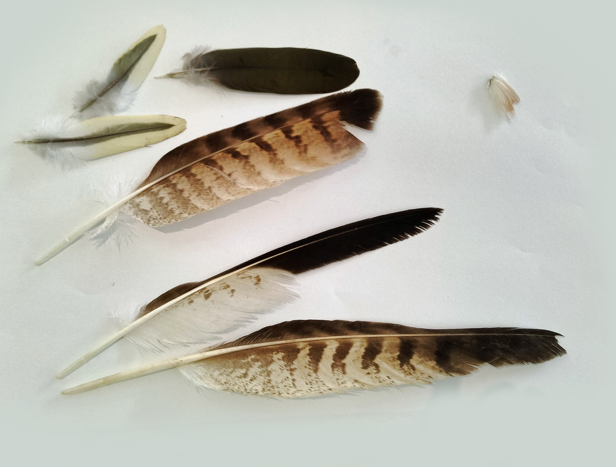季節を問わず、落ちているのが鳥の羽根。こんな大物を拾うと、どっきりします。猛禽類のフクロウやノスリ、そして、その猛禽たちに食べられちゃったアオバトやドバトの羽根です。