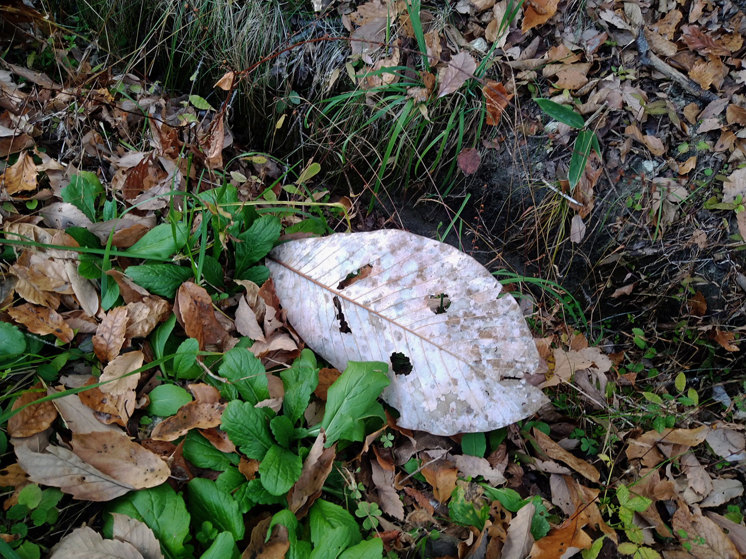 いわずと知れた朴葉焼きのホオノキの落ち葉。大きくて、白っぽくて、遠くから見るとごみが落ちていると、何度騙されたことか・・・www