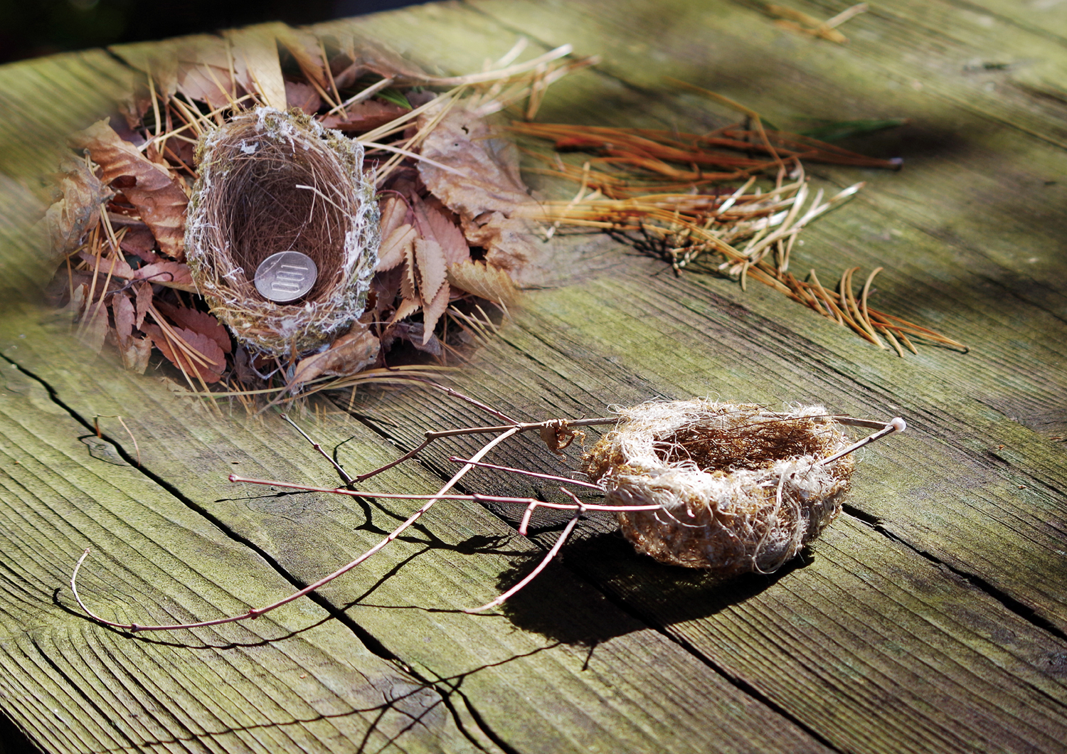 秋に強い風が吹いた後には、ときどき、こんなものが落ちています。メジロの巣です。二股の木の枝に上手にひっかけています。木の葉が落ちると、樹上にメジロ団地が現れたりしてびっくりします。鳥の巣は巣材もさまざま、県民の森のメジロの巣には遊歩道整備で使われる土嚢袋の繊維が多く使われています。