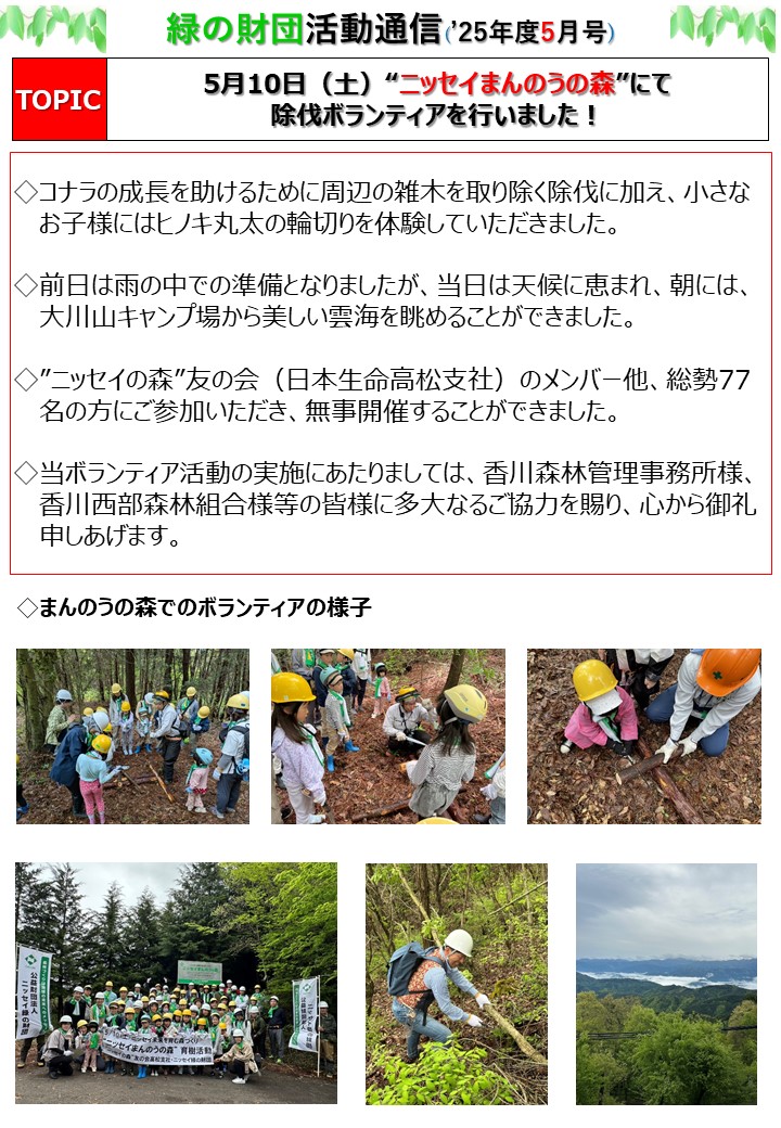 記事公開日 2025/09/30 最終更新日2025/10/21 2025年度 財団活動通信5月号を発行しました 活動トピックス Tweet 2025年度 財団活動通信5月号を発行しました ニッセイ緑の財団の活動(森林づくり、イベント開催、樹木名プレート・学校の木のしおりの寄贈等)をまとめた「財団活動通信」を発行いたしました! 次の画像 前の画像 2025年5月号はこちら財団活動通信一覧 Tweet