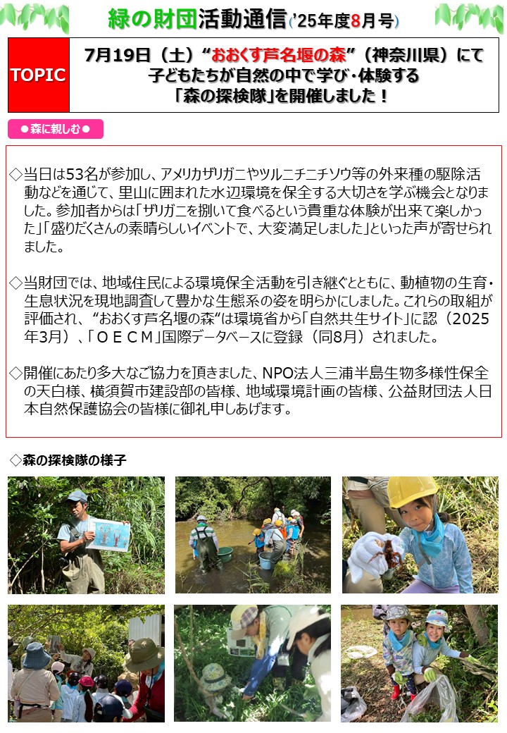 記事公開日 2025/09/30 最終更新日2025/10/21 2025年度 財団活動通信8月号を発行しました 活動トピックス Tweet 2025年度 財団活動通信8月号を発行しました ニッセイ緑の財団の活動(森林づくり、イベント開催、樹木名プレート・学校の木のしおりの寄贈等)をまとめた「財団活動通信」を発行いたしました! 次の画像 前の画像 2025年8月号はこちら財団活動通信一覧 Tweet