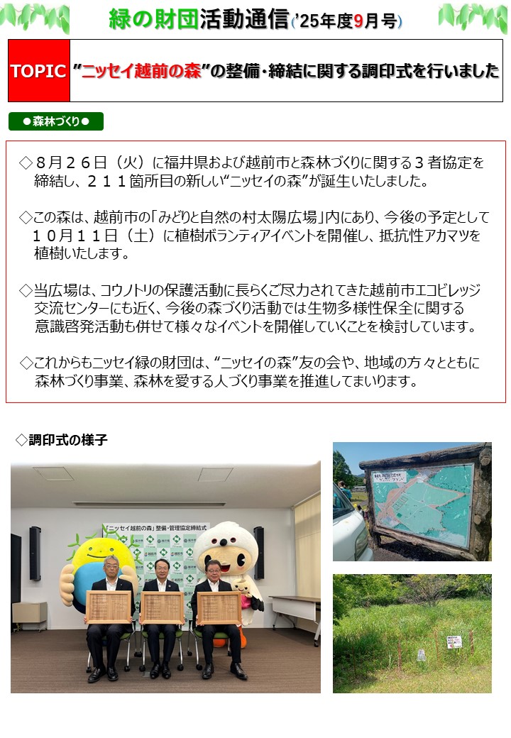 記事公開日 2025/10/02 2025年度 財団活動通信9月号を発行しました 活動トピックス Tweet 2025年度 財団活動通信9月号を発行しました ニッセイ緑の財団の活動(森林づくり、イベント開催、樹木名プレート・学校の木のしおりの寄贈等)をまとめた「財団活動通信」を発行いたしました! 次の画像 前の画像 2025年9月号はこちら Tweet