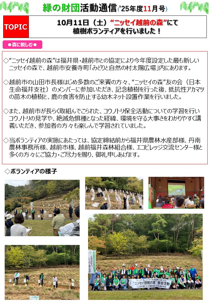 記事公開日 2025/11/21 2025年度 財団活動通信11月号を発行しました 活動トピックス Tweet 2025年度 財団活動通信11月号を発行しました ニッセイ緑の財団の活動(森林づくり、イベント開催、樹木名プレート・学校の木のしおりの寄贈等)をまとめた「財団活動通信」を発行いたしました! 次の画像 前の画像 2025年11月号はこちら Tweet