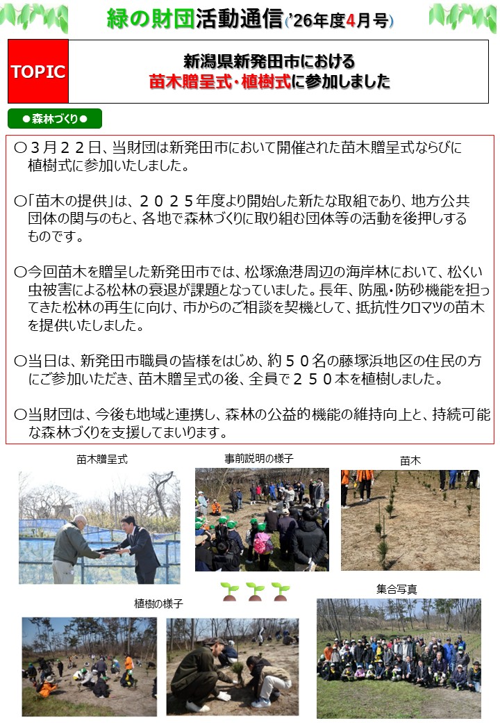 記事公開日 2026/04/27 2026年度 財団活動通信4月号を発行しました 活動トピックス Tweet 2026年度 財団活動通信4月号を発行しました ニッセイ緑の財団の活動(森林づくり、イベント開催、樹木名プレート・学校の木のしおりの寄贈等)をまとめた「財団活動通信」を発行いたしました! 次の画像 前の画像 2026年度4月号はこちら Tweet