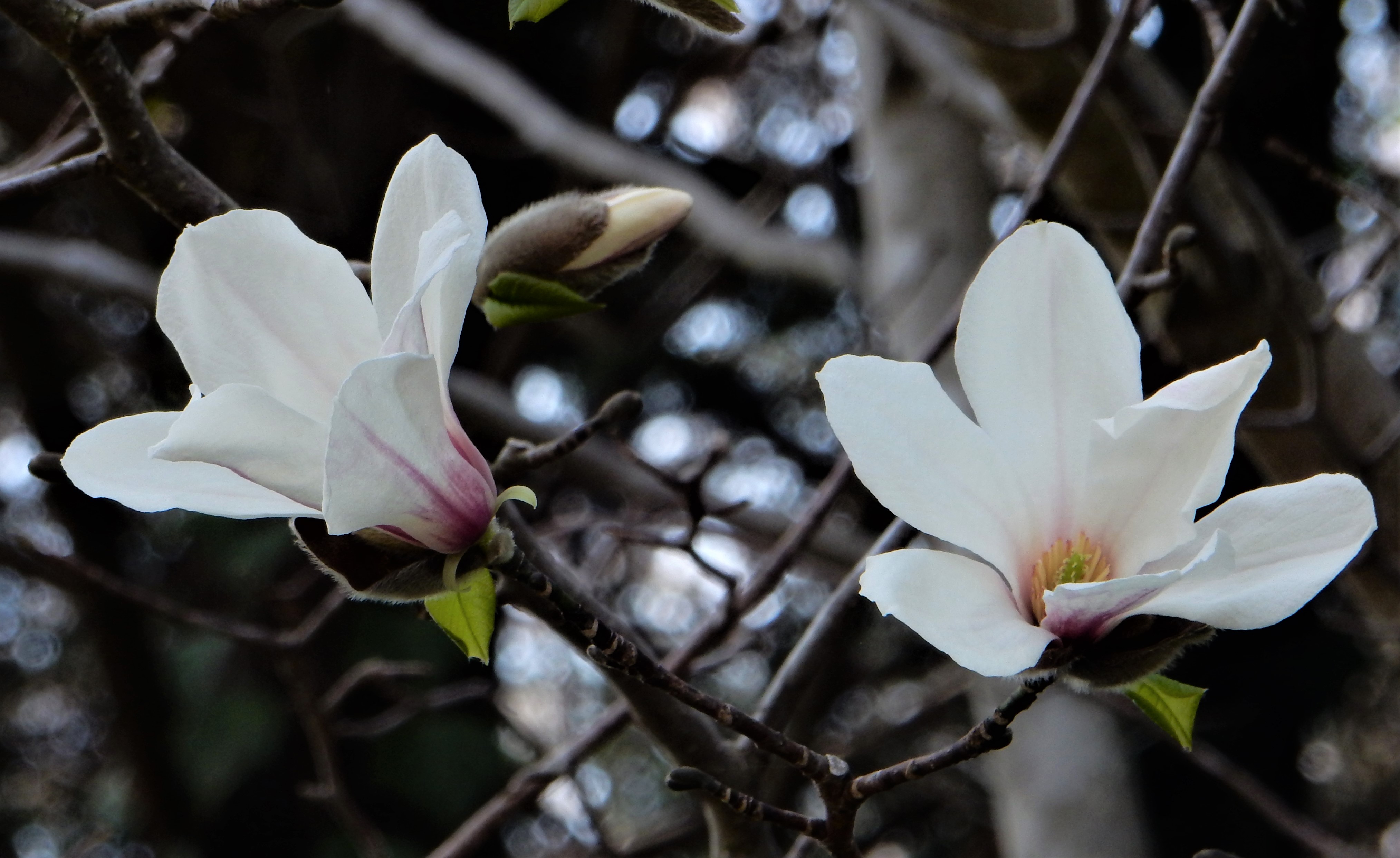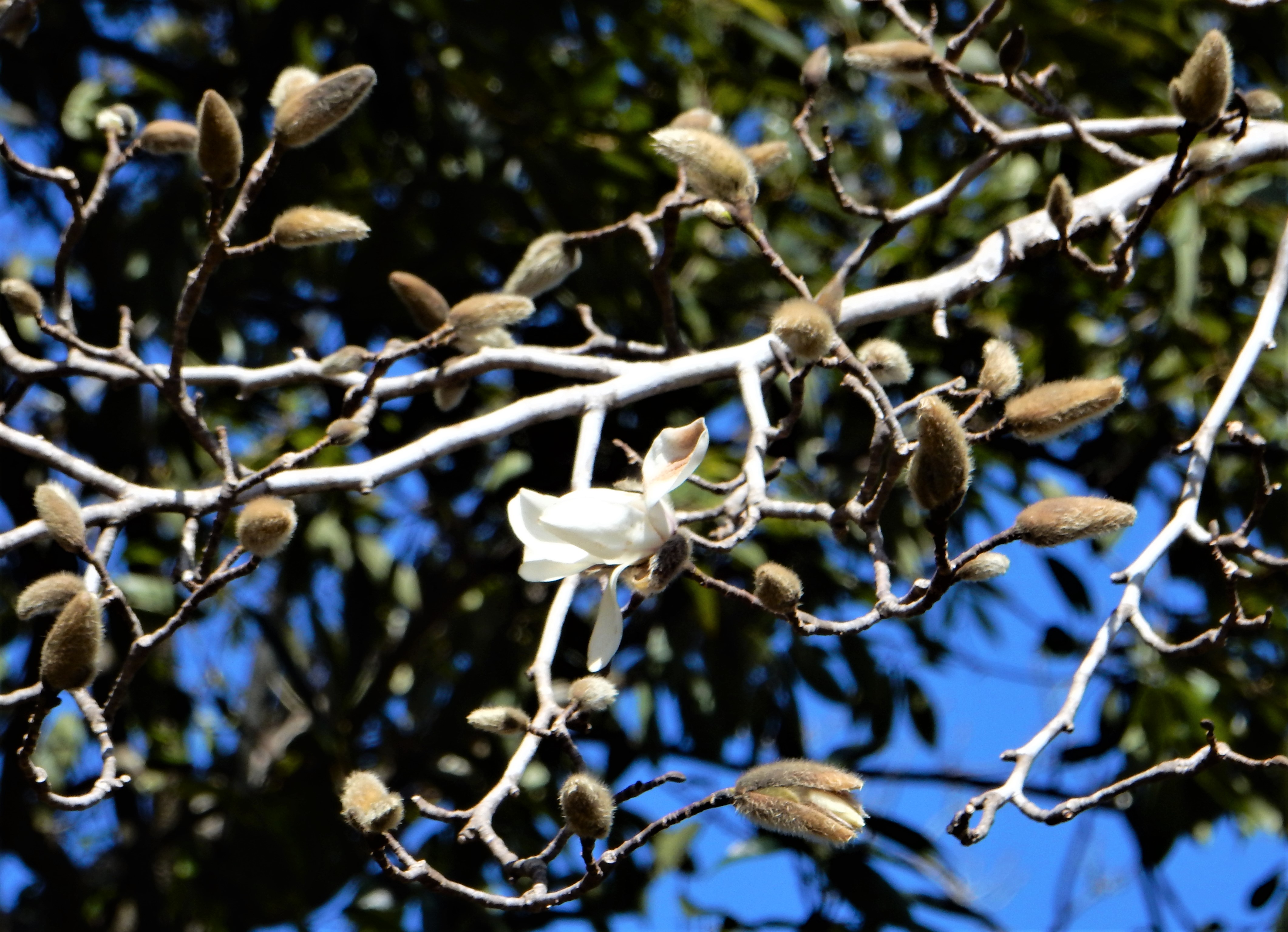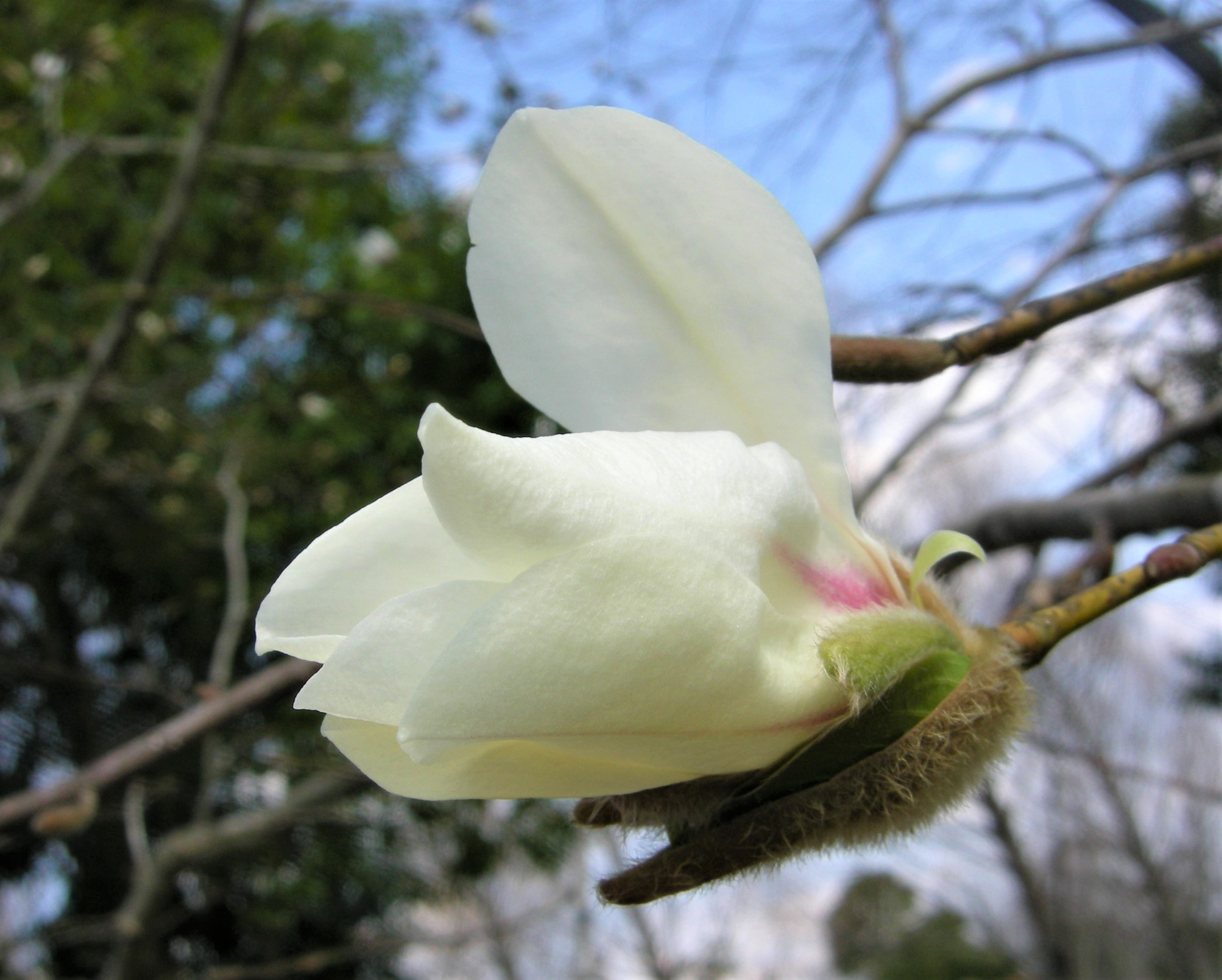 つぼみは長い毛のある皮と薄い皮に覆われています。花の咲く姿は優雅で、厚い毛皮のコートと、薄いスプリングコート、両方を脱いで白い春のワンピースで登場するというような表現をされます。花の基部に若葉が一枚つくのもおしゃれですね。