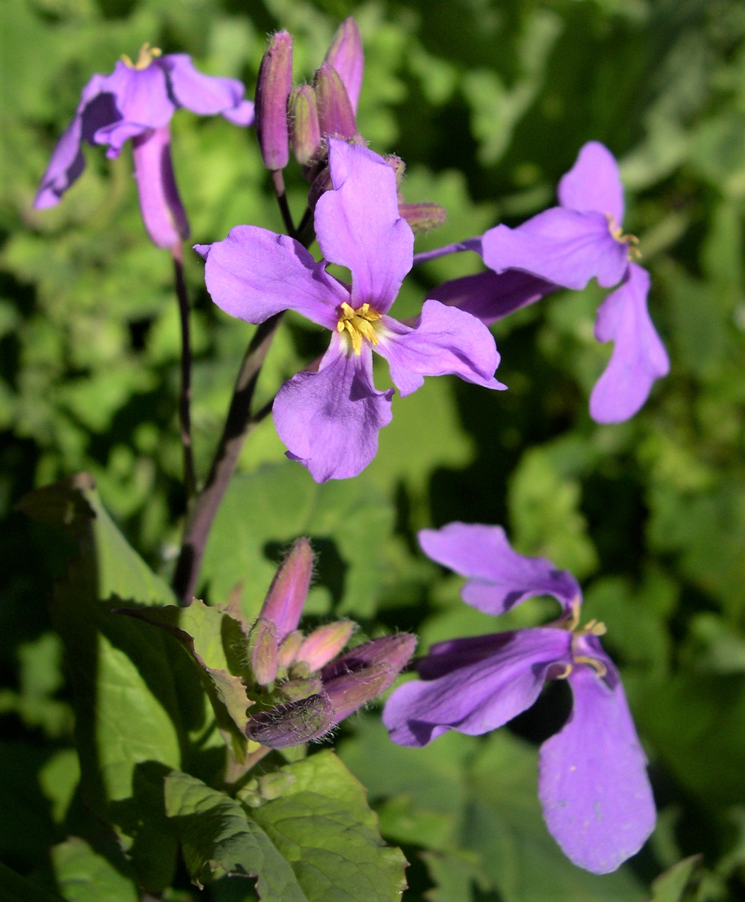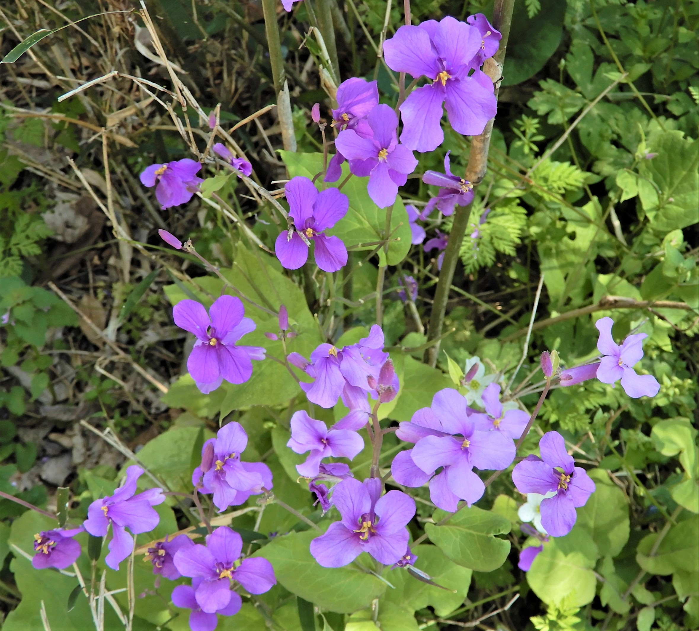 紫色の花は4枚の花弁が十字形について、アブラナ科の特徴を示しています。ダイコンの花に似ていて、大振りで鮮やか花色からハナダイコンと呼ばれるのでしょう。覚えやすいのでしょうか、この名前で呼ばれる方も多いようです。