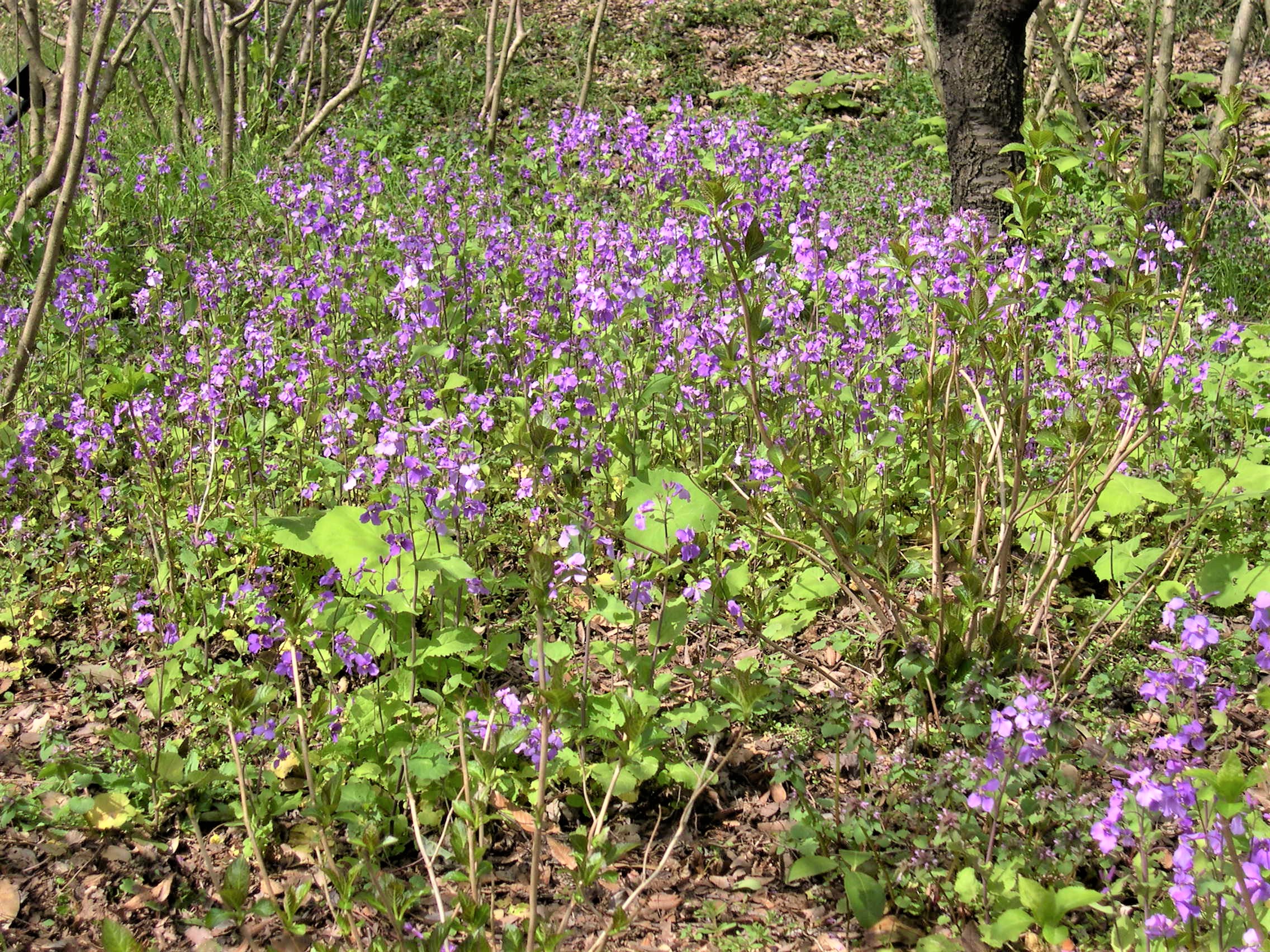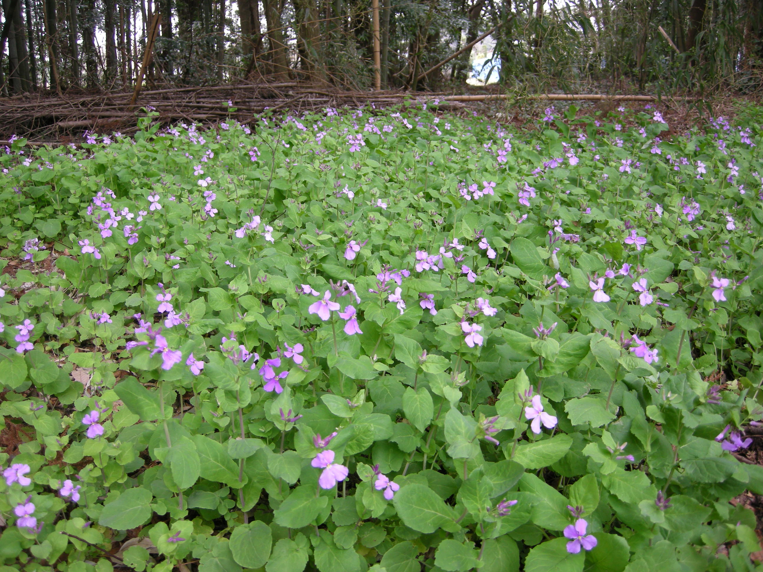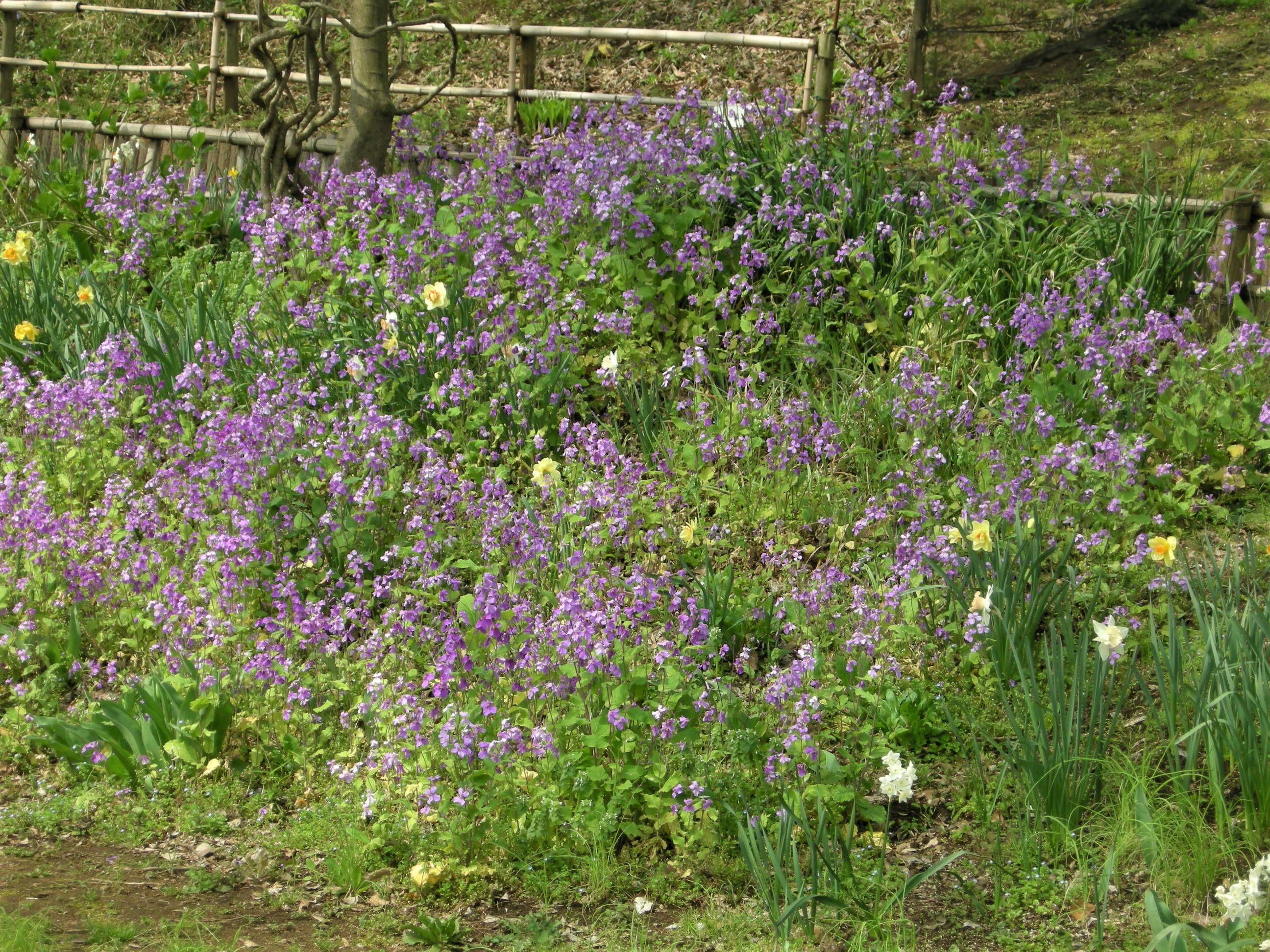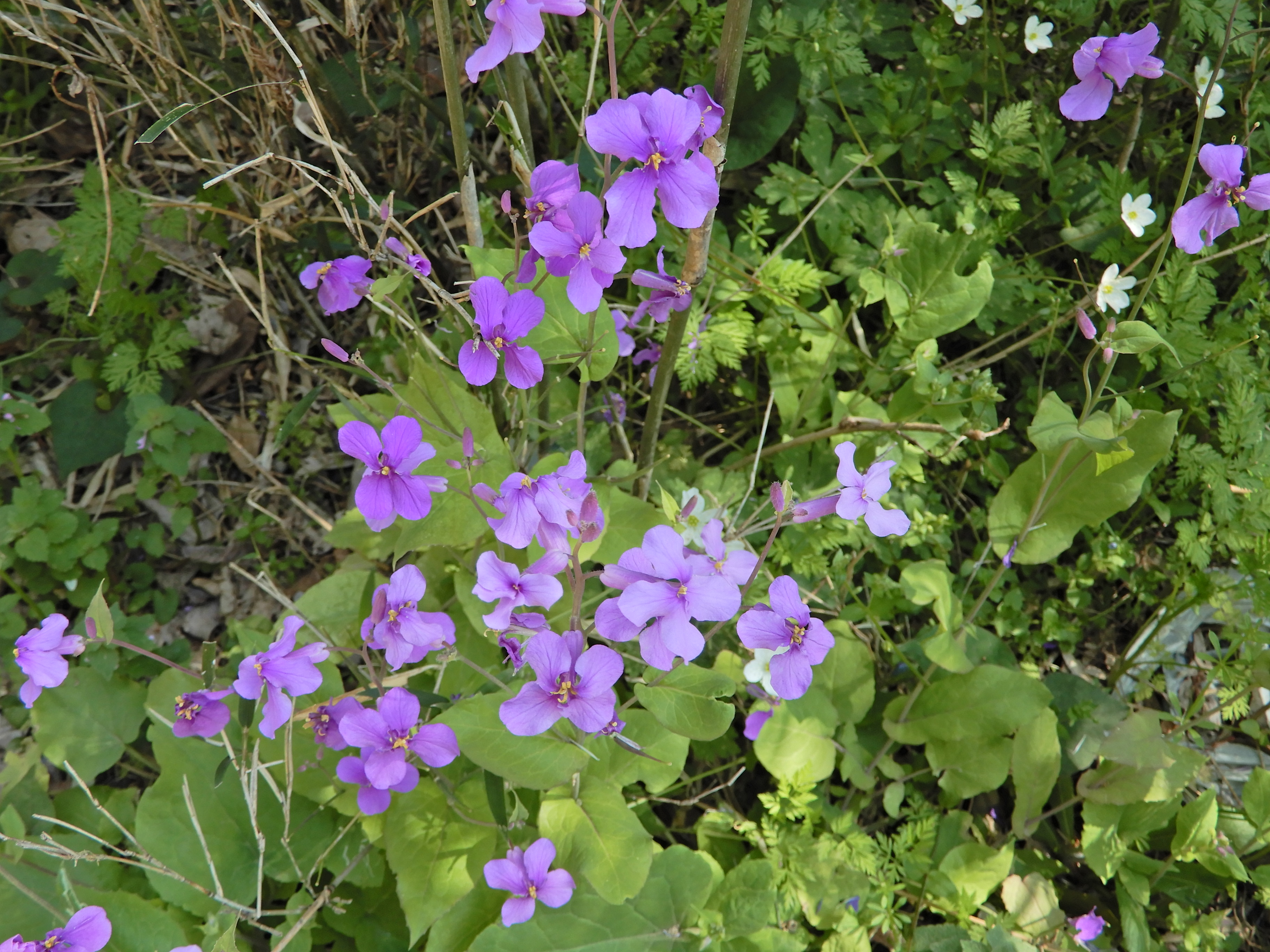 ハナダイコン(花大根)、オオアラセイトウ(大紫羅欄花)、シキンサイ(紫金菜)など、いろいろな名前で呼ばれる植物です。中国原産の植物で、江戸時代に中国名の諸葛菜(しょかつさい)として栽培された記録があります。戦前、中国の紫金山より種子が日本に持ち込まれました。戦後、栽培もされますが、東京を中心に野草化し、あちこちで見かけるようになっています。