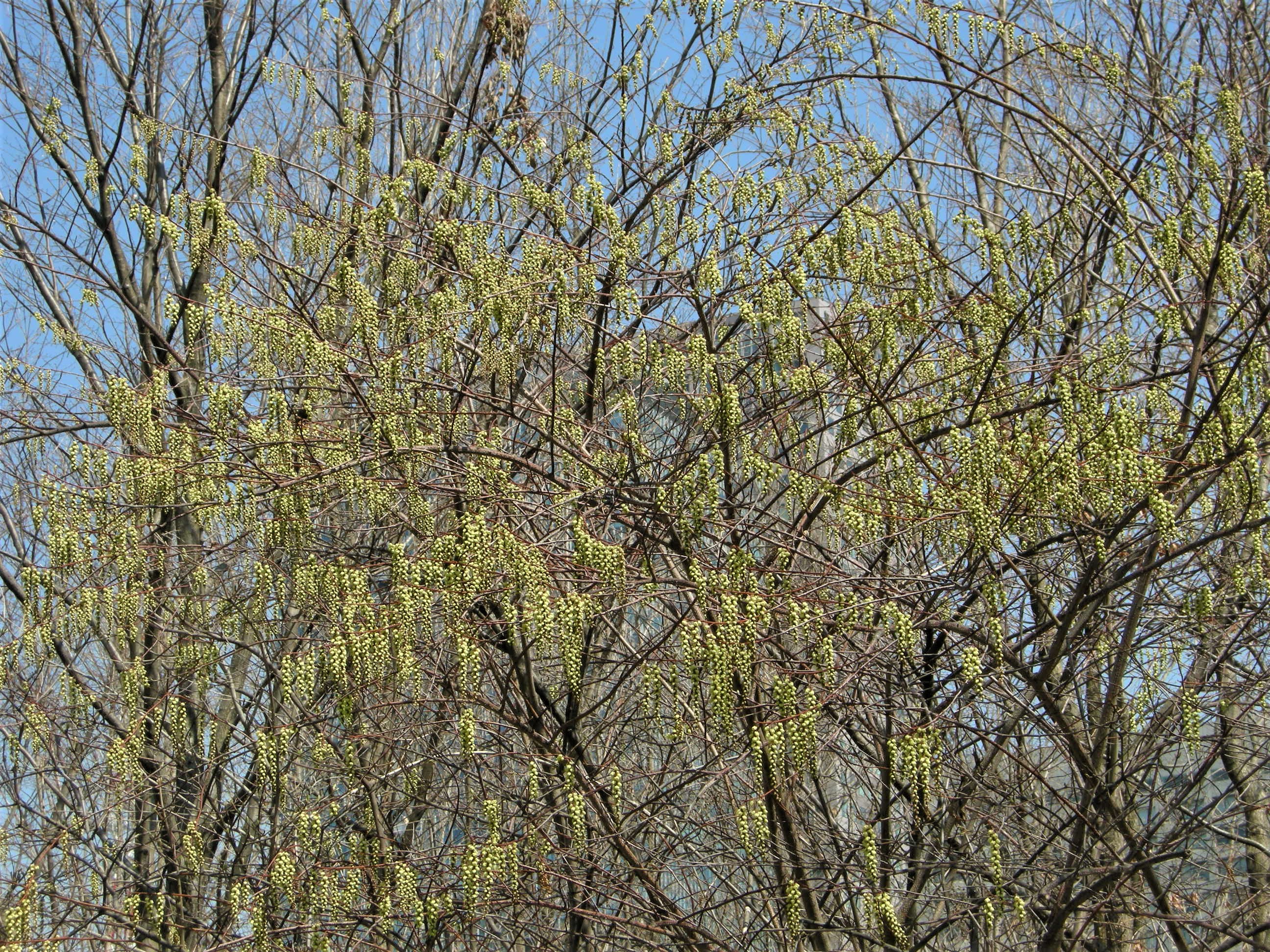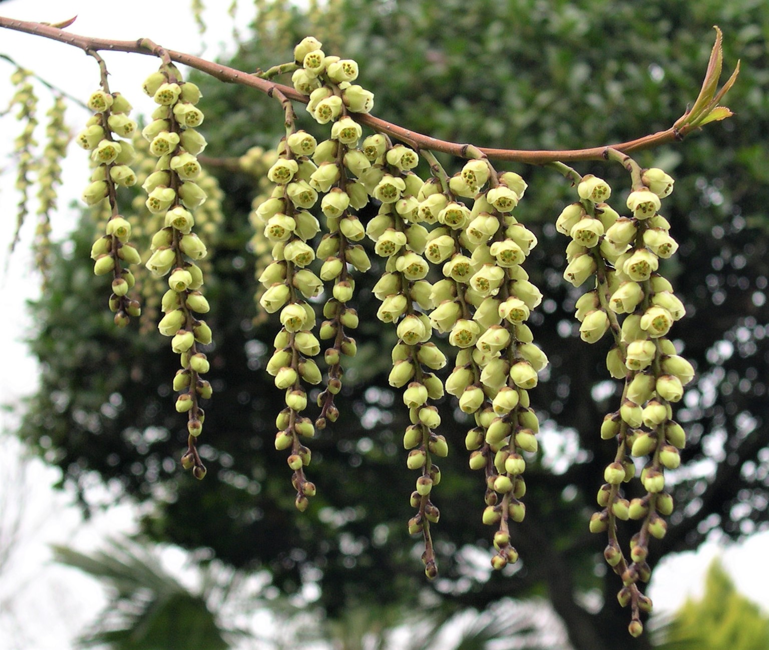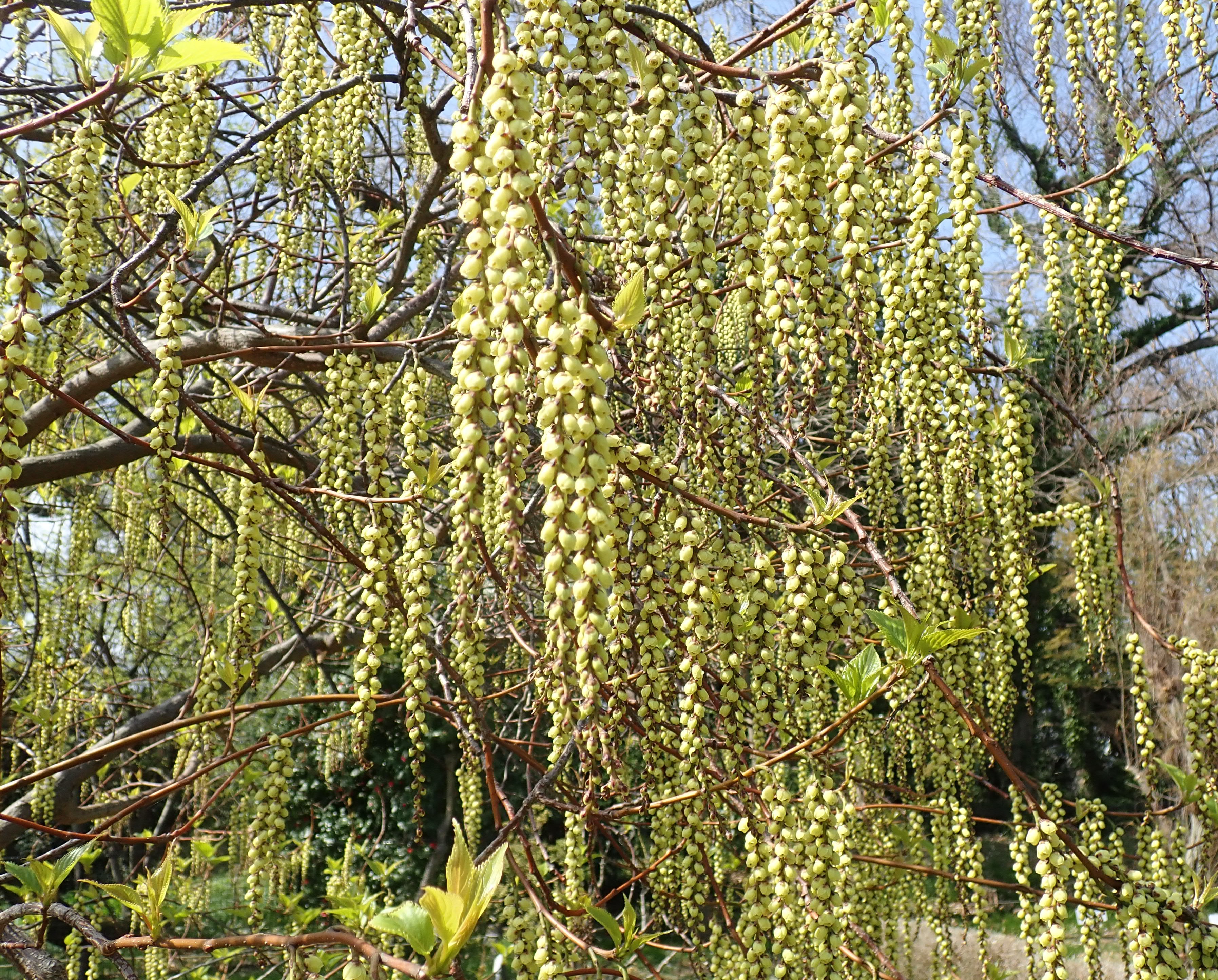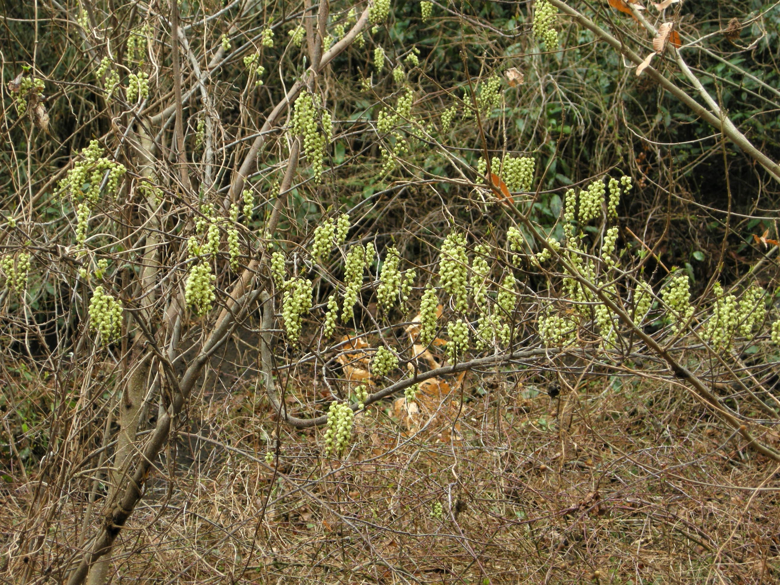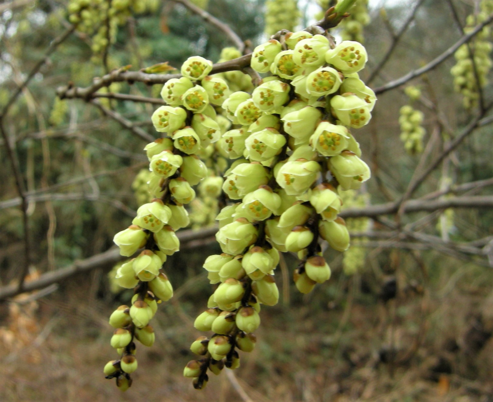 早春の雑木林の林縁で、簾のように花穂が垂れ下がります。思わず足を止めてしまう方も多いのではないでしょうか。垂れ下がる花穂の姿を藤に見立てての名前という説もあります。キブシ、漢字では木五倍子と書きます。