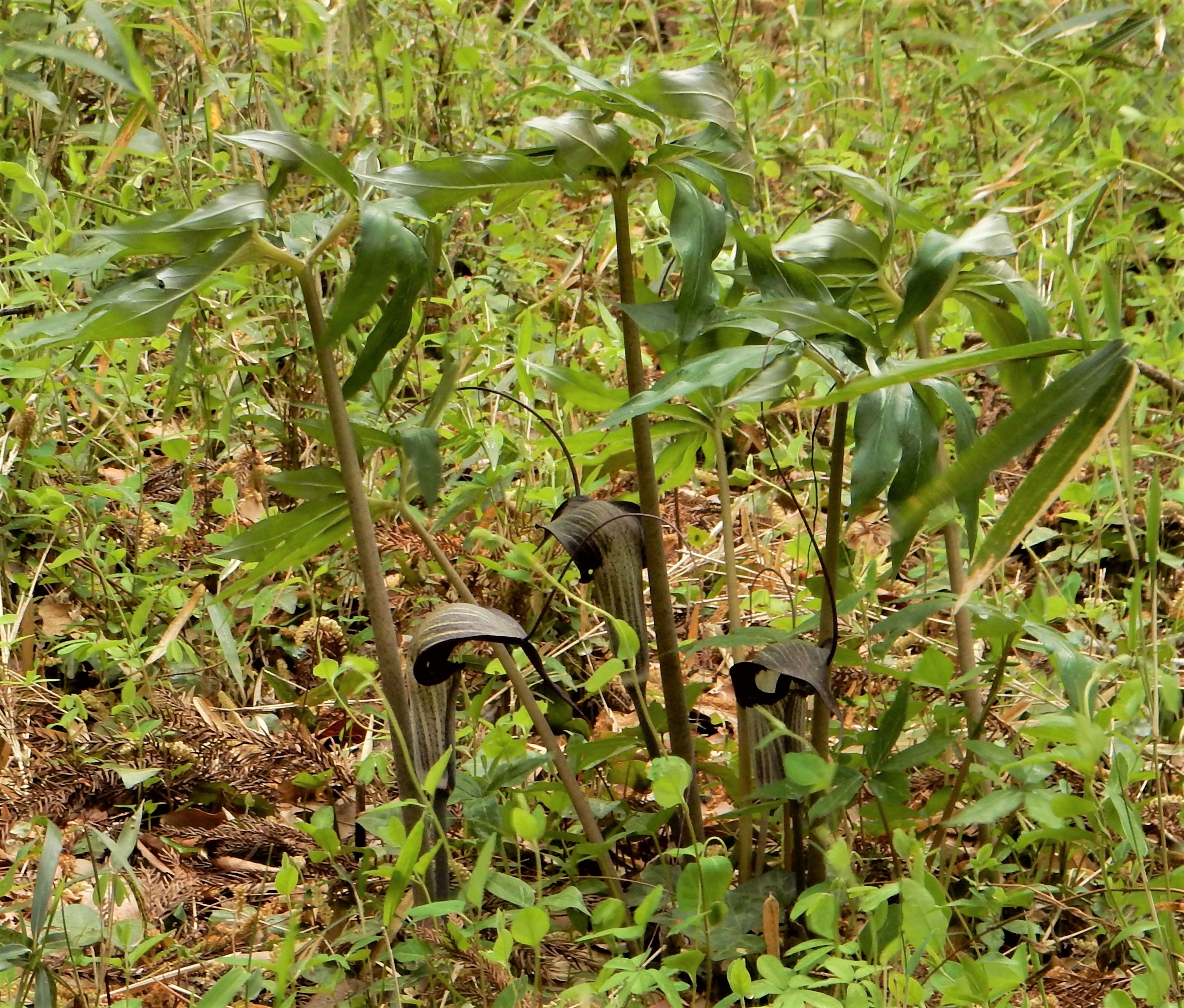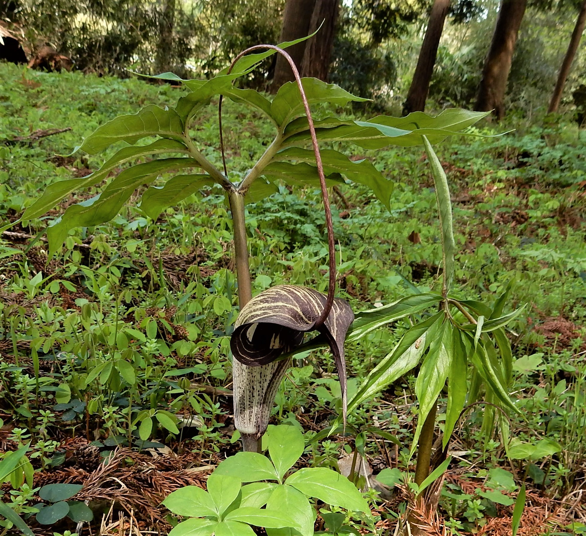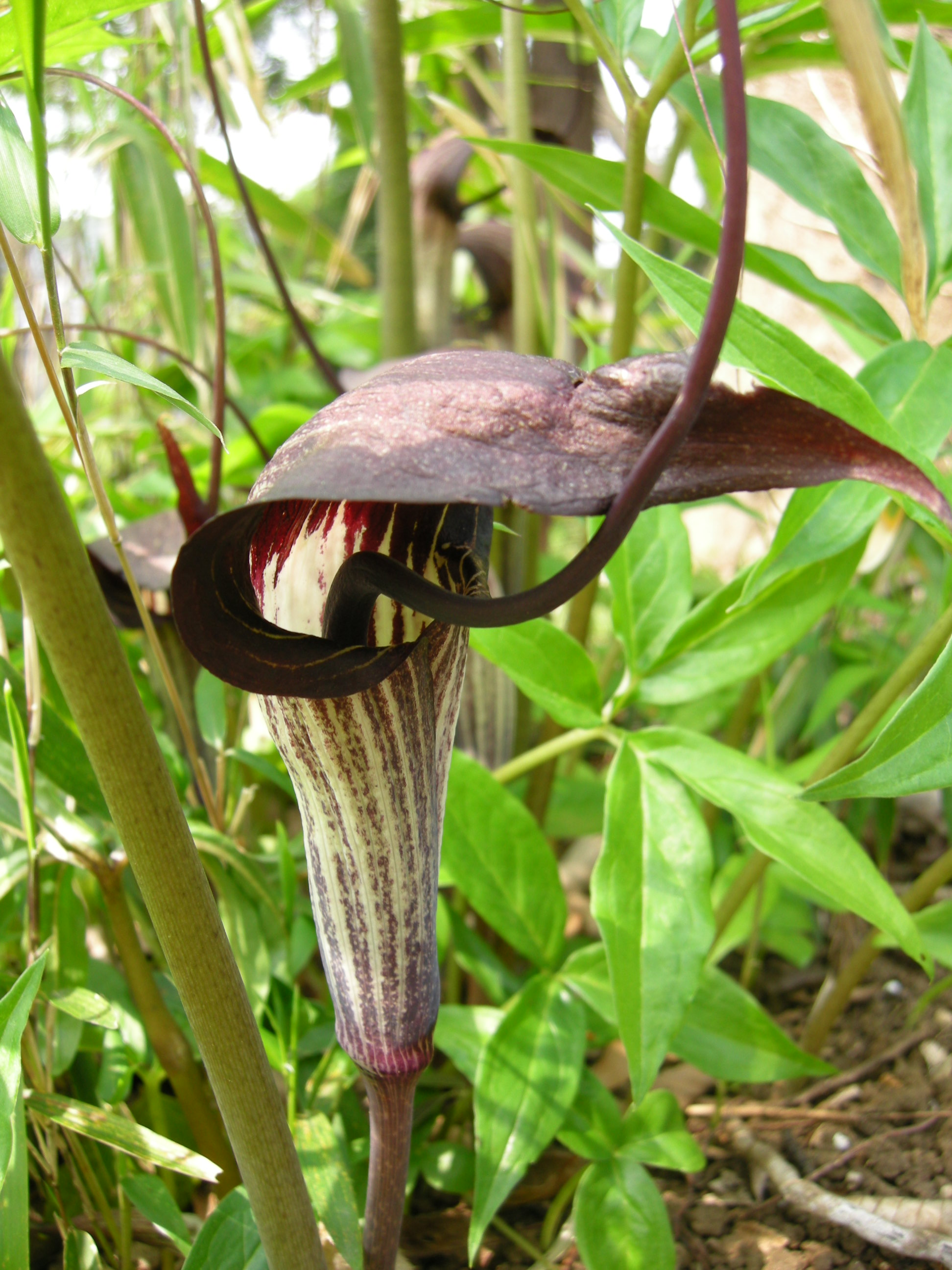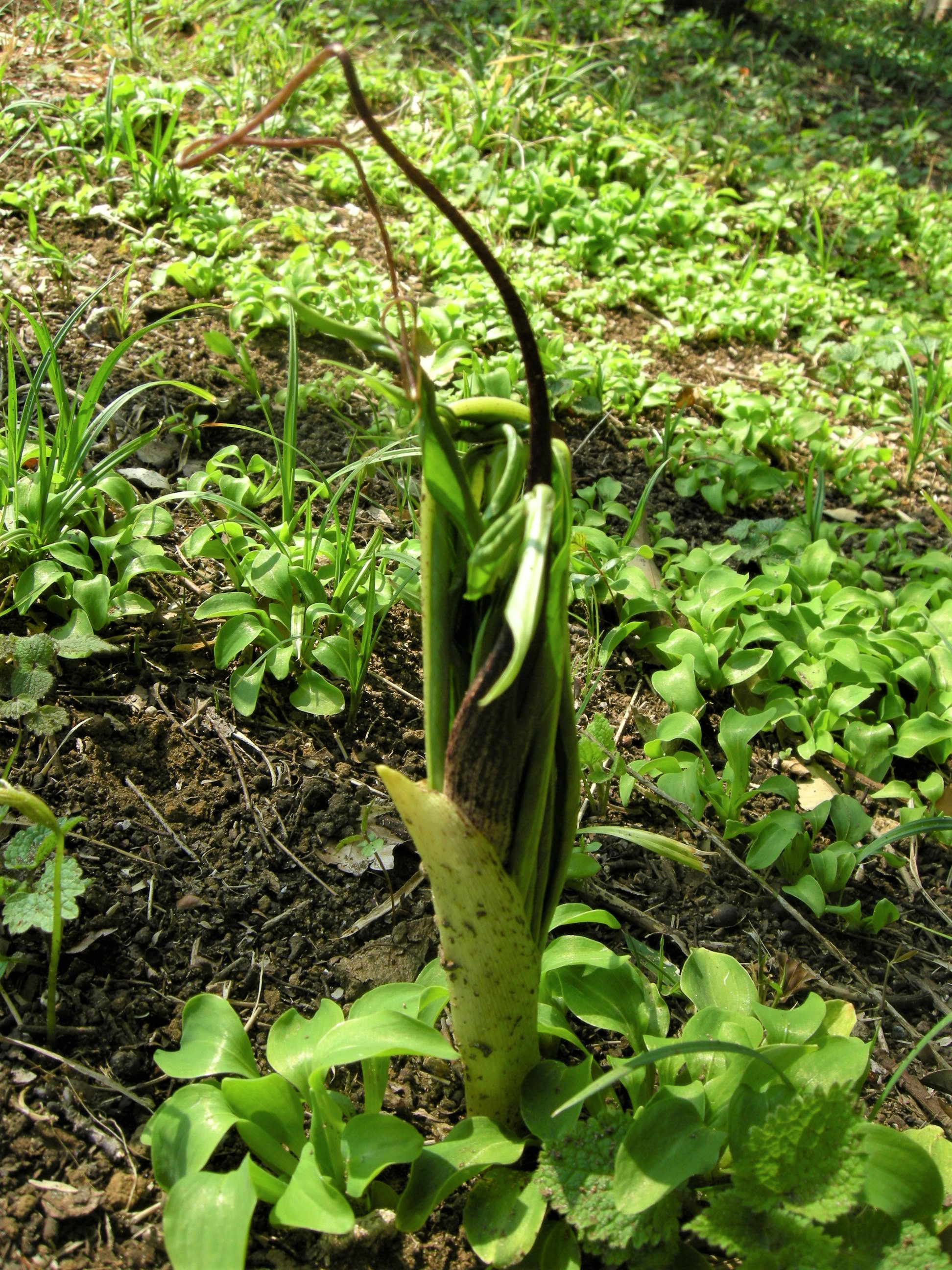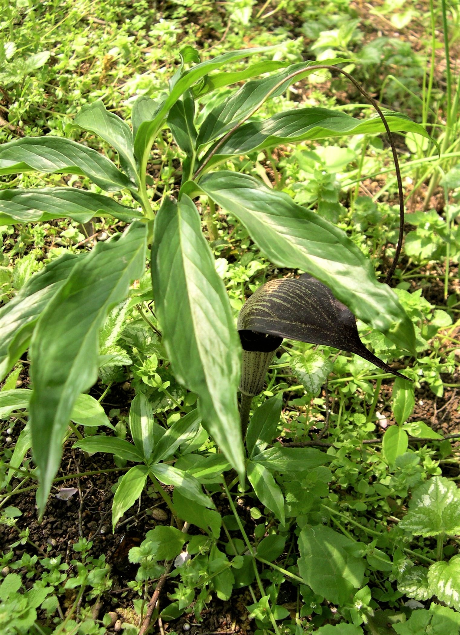 早春の雑木林で葉を広げます。広げた葉の下に長い糸状の付属体を伸ばした花を咲かせます。この姿を浦島太郎の釣り糸に見立てた名前と言われています。この付属体をたどっていくと小さい花を着けた肉穂花序(にくすいかじょ)と呼ばれる花の塊があります。花は仏炎苞(ぶつえんほう)と呼ばれる苞葉に包まれて保護されています。