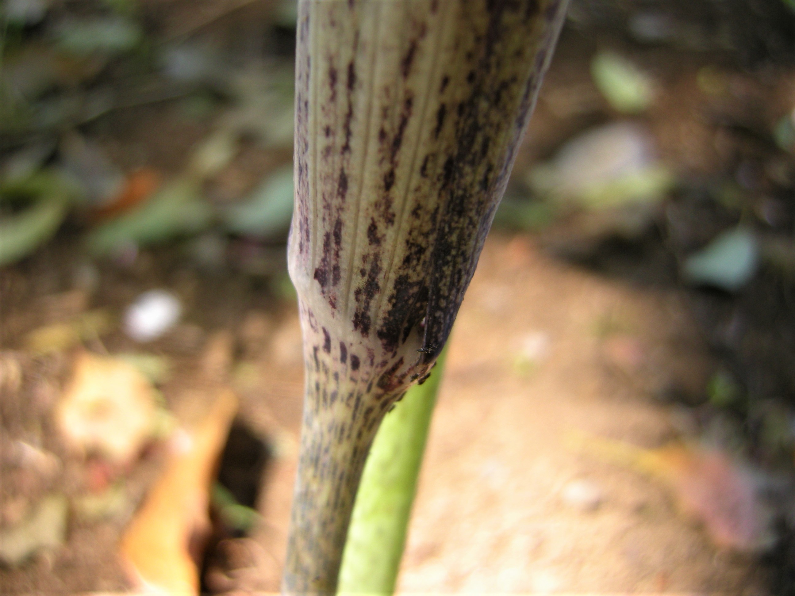 雄株に入った虫は仏炎苞の中で動き回って、体に花粉をつけて雌株に移動して受粉に貢献します。細い筒状の仏炎苞から抜け出すのは困難ですが、雄株は前の合わせ目に小さな隙間があり、抜け出せるようになっています。雌株は虫が簡単には出られないように、合わせ目の隙間はありません。花粉をもらえば、それを運んできてくれた虫のことはどうでも良い? 中で息絶えている虫も見られます。子孫を残すための方策なのでしょう。生育環境によっては小さな子株に分裂して花を着けなくなることもあります。