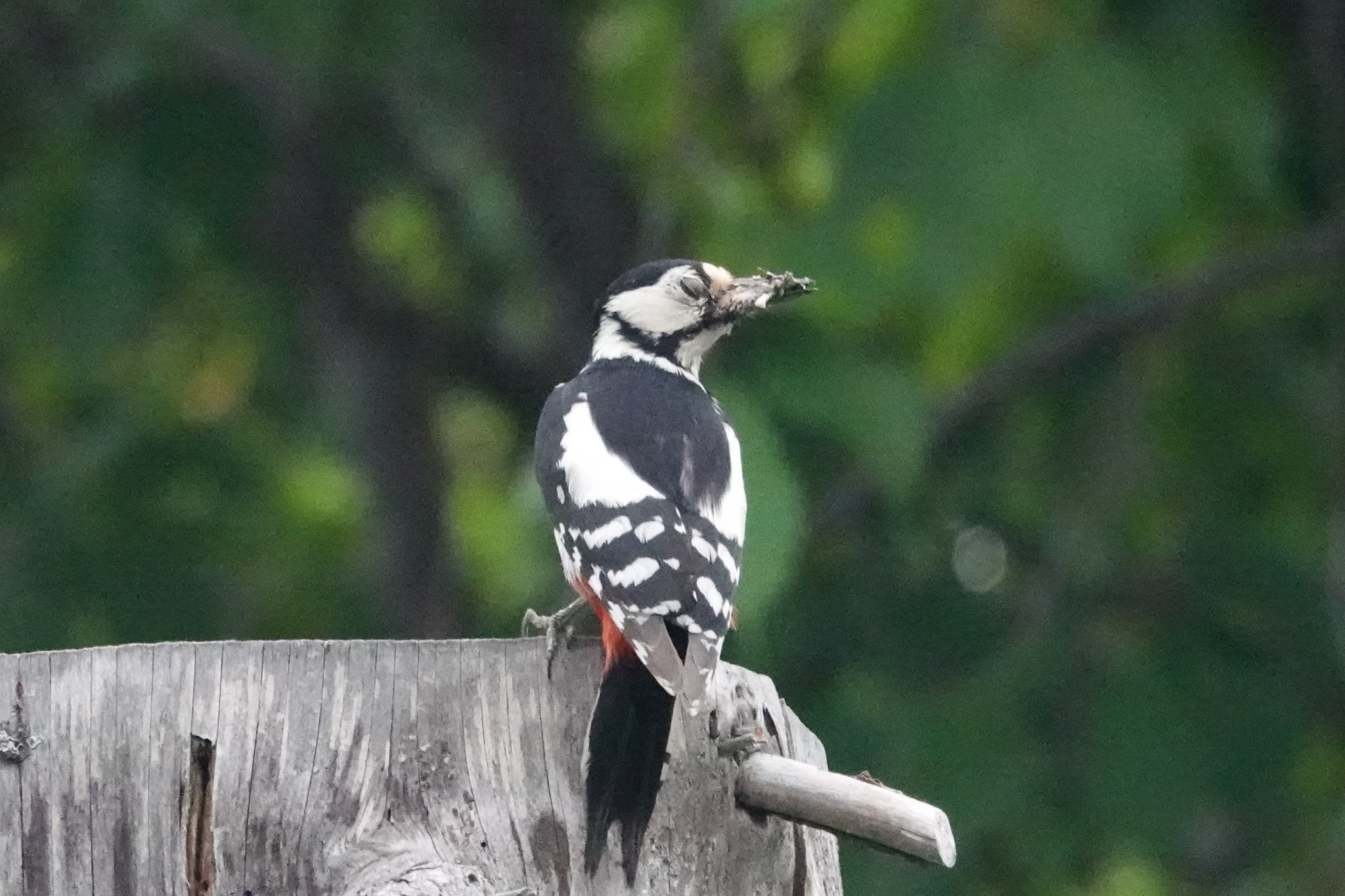 キツツキが突く木は枯れた木や弱った木が多く、これは枯れ木などには幹の中にエサとなる虫が潜んでいることが多いためです。穴をあけるとクチバシの何倍も有る非常に長い舌を差し込んで中にいる虫を絡め取ります。舌の先はカギ状のギザギザが付いていたり粘液を出したりして虫を捕まえ易くなっています。