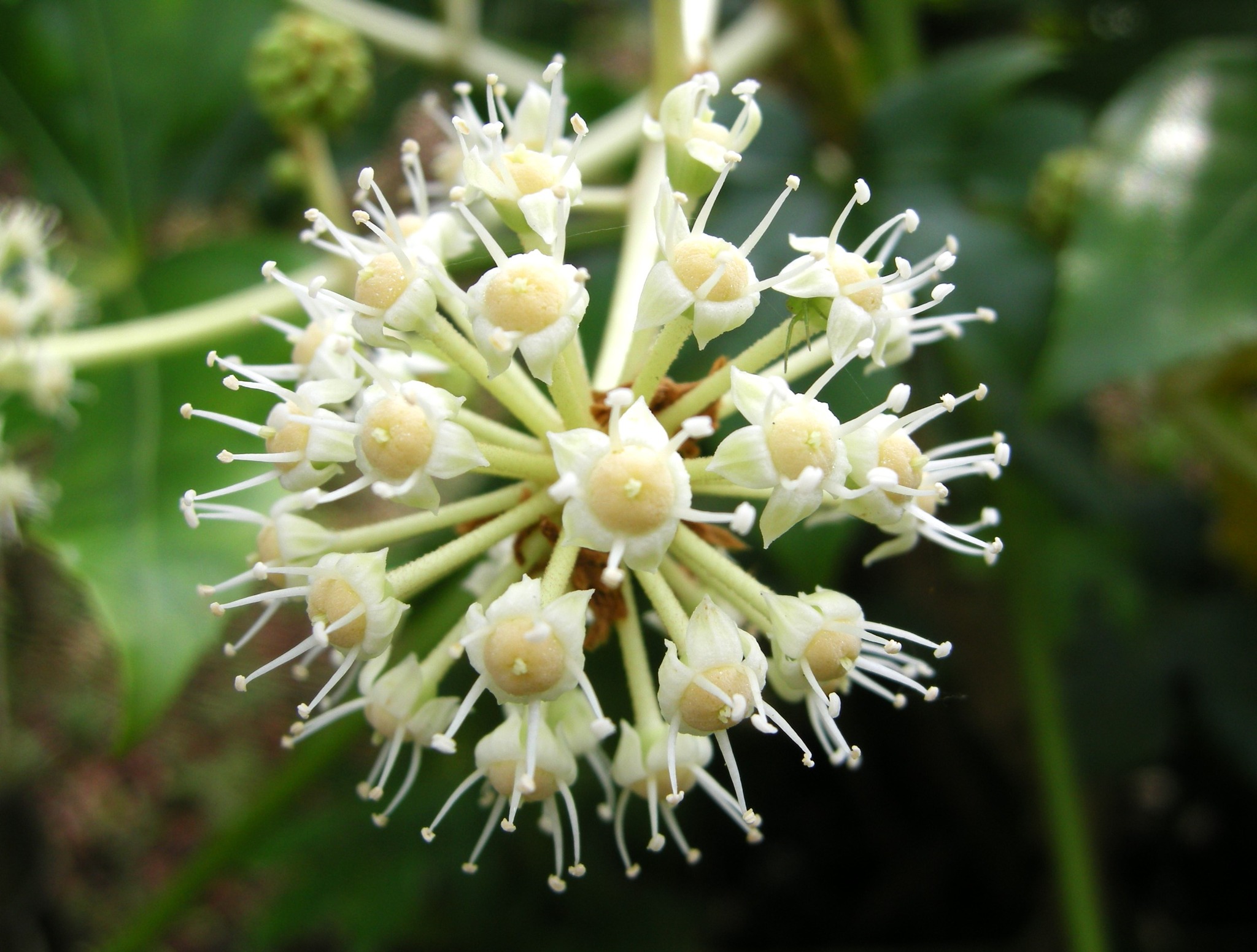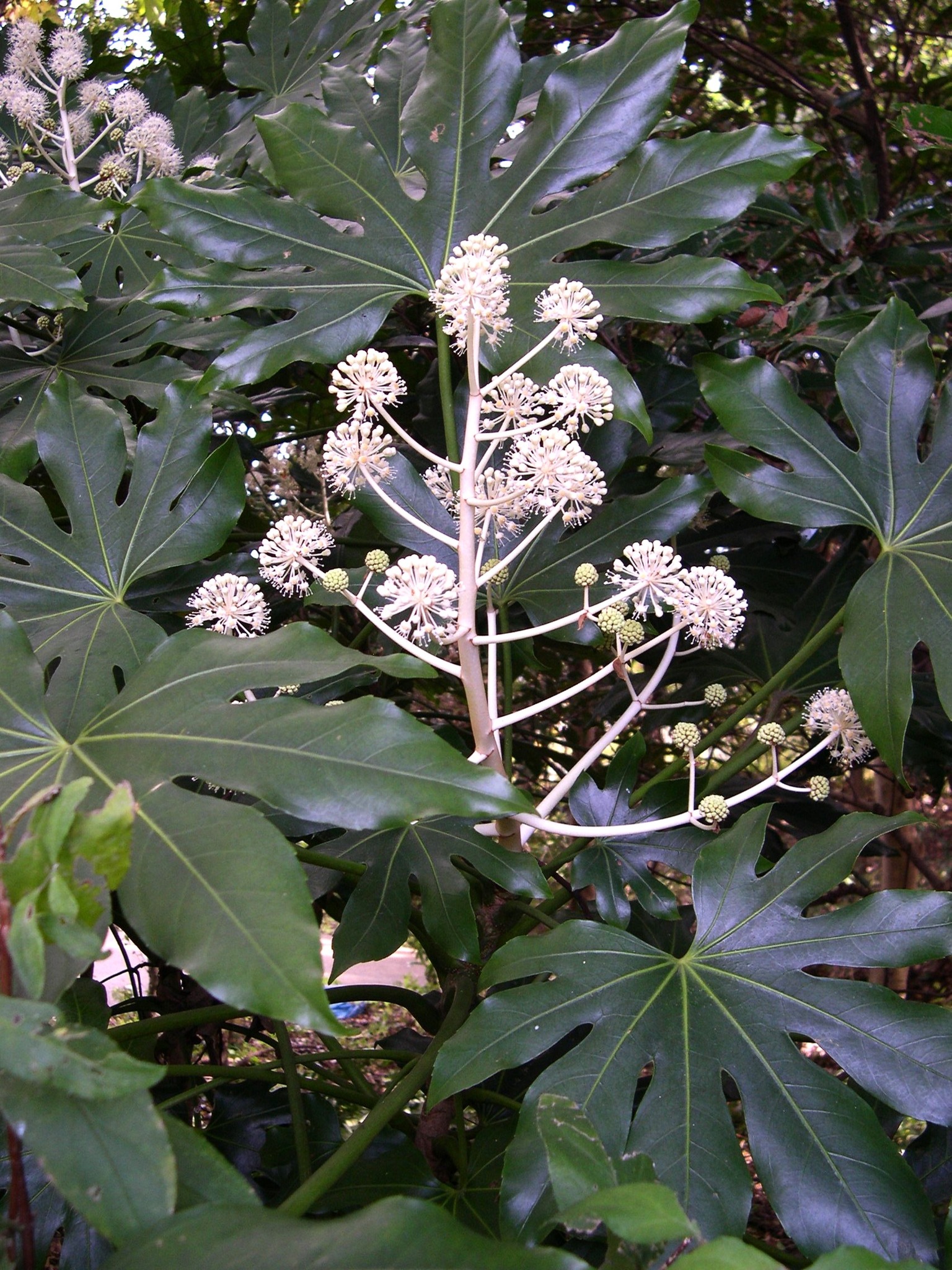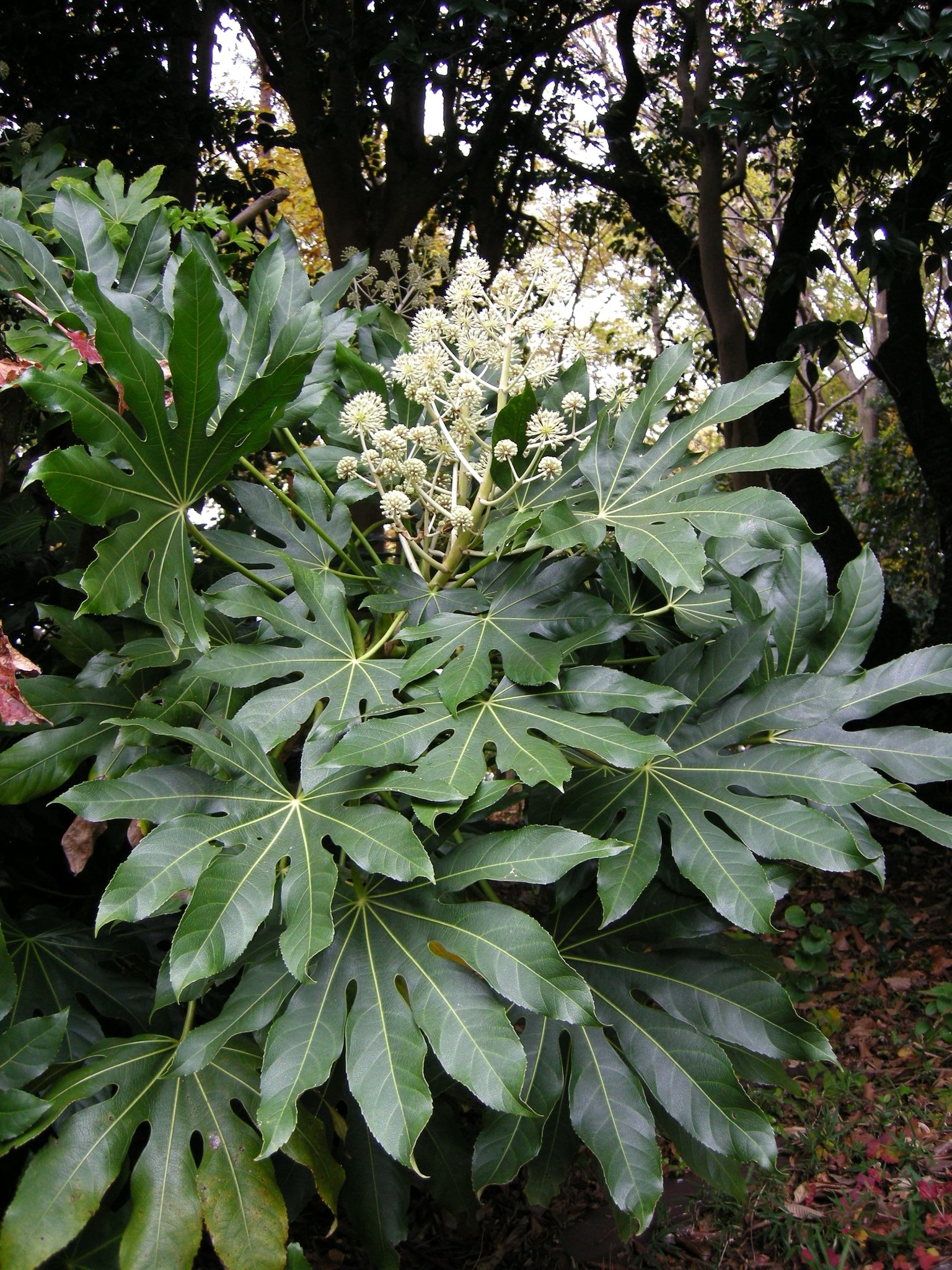 ヤツデの名前は、葉が主に八つに深く切れ込んで、手のように見えるからと思われていますが、実際には、九裂、七裂、五裂など、奇数に分かれているのが大部分です。また、発芽後出る最初の本葉は分かれていません。