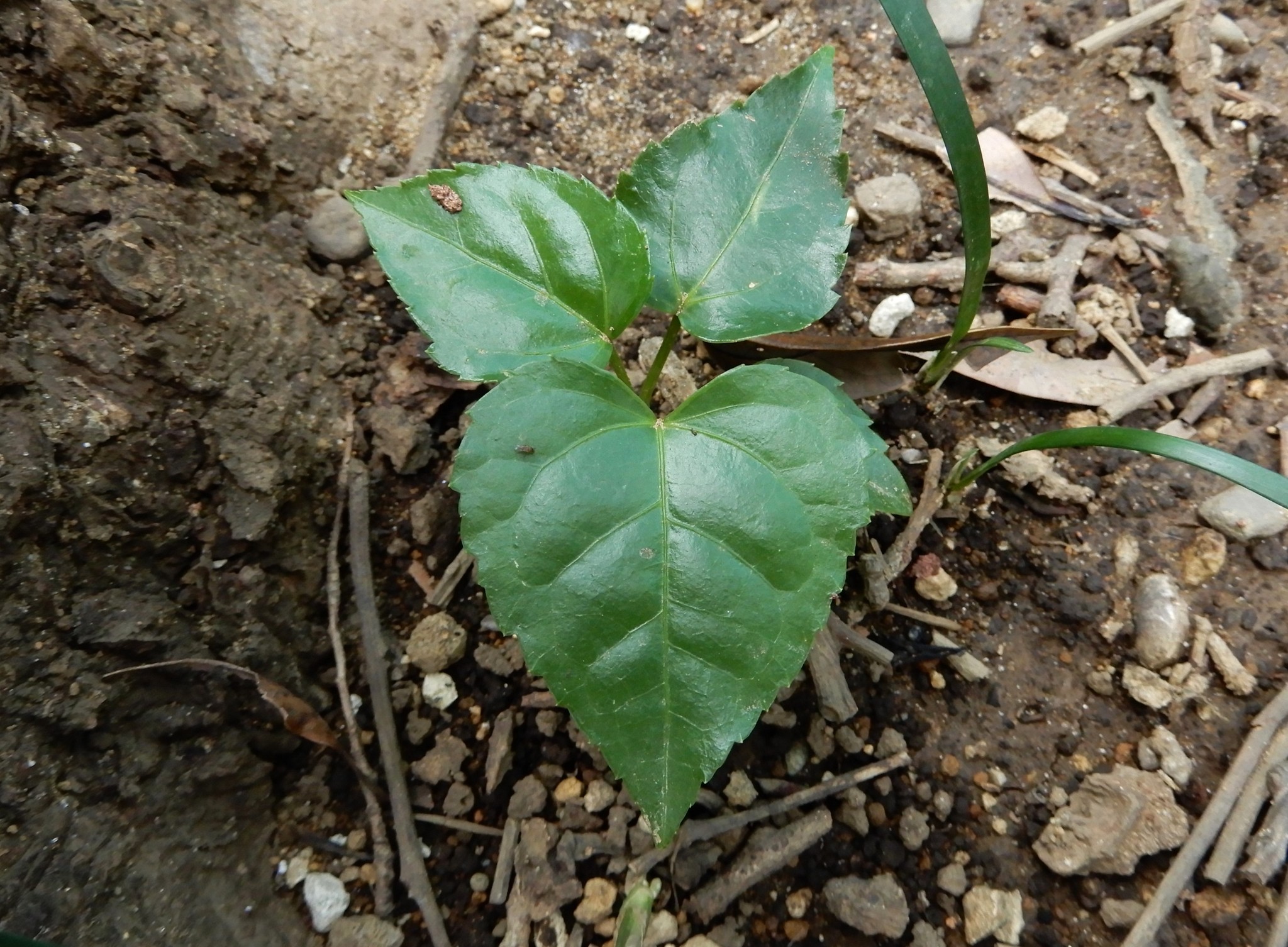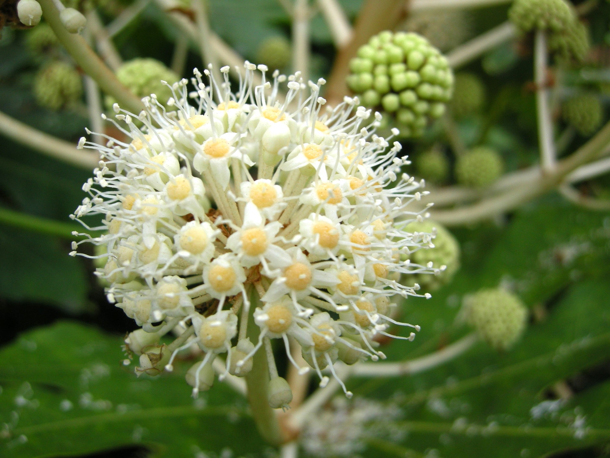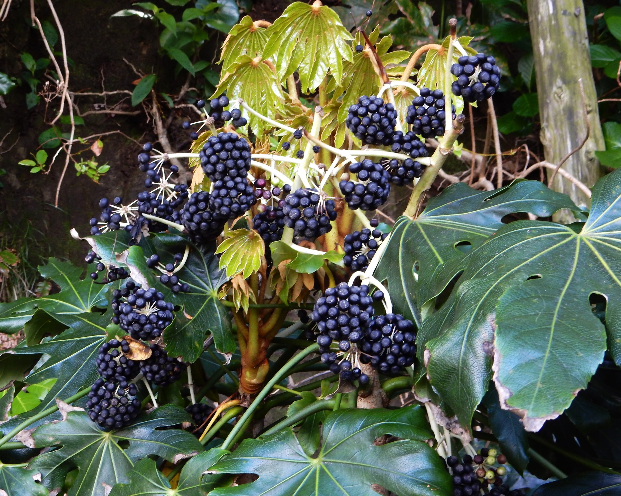 ヤツデの名前は、葉が主に八つに深く切れ込んで、手のように見えるからと思われていますが、実際には、九裂、七裂、五裂など、奇数に分かれているのが大部分です。また、発芽後出る最初の本葉は分かれていません。
