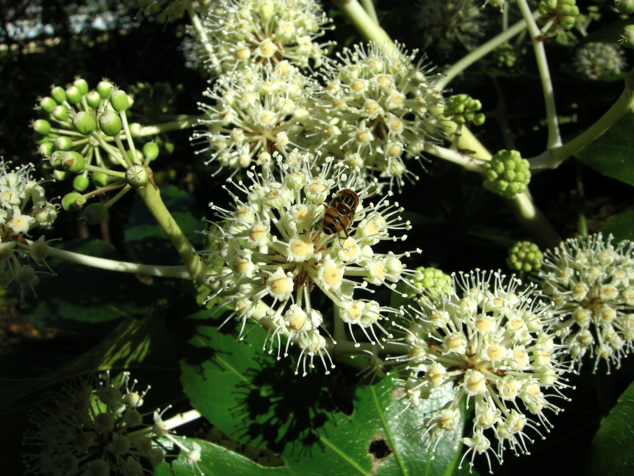 花盤と呼ばれる台になっている部分から蜜が染み出します。花の少ない季節、この花蜜を求めてアブやハエの仲間が集まります。
