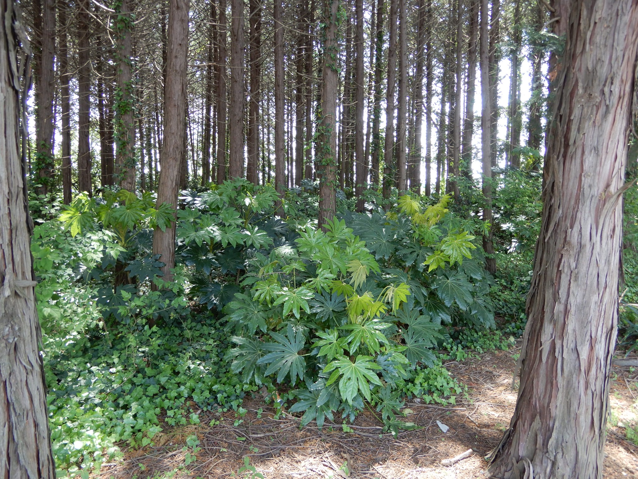 ヤツデの葉柄は株の下に行くほど長くなります。葉の大きさも下の方が大きくなります。また、茎につく葉の角度も140度前後と規則性があります。十分な日照が期待できない環境で生きていくうえで、全ての葉で効率よく光を受けられるようになっていった姿と言われています。