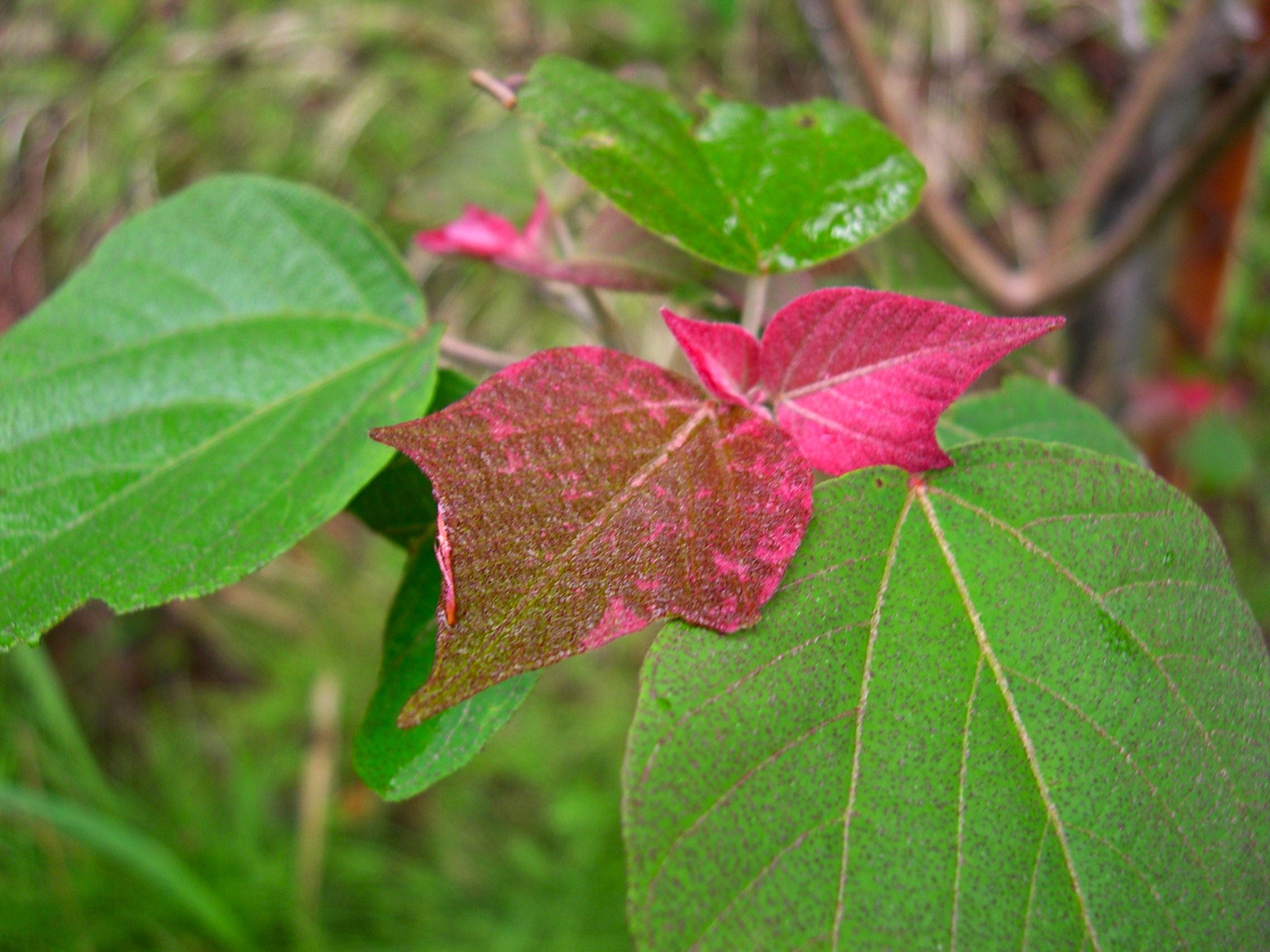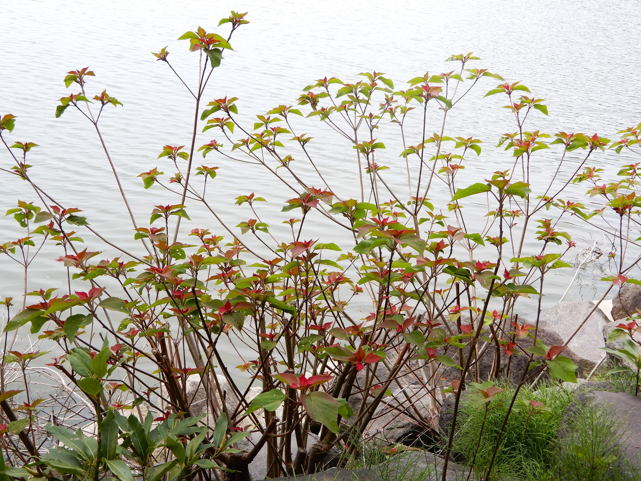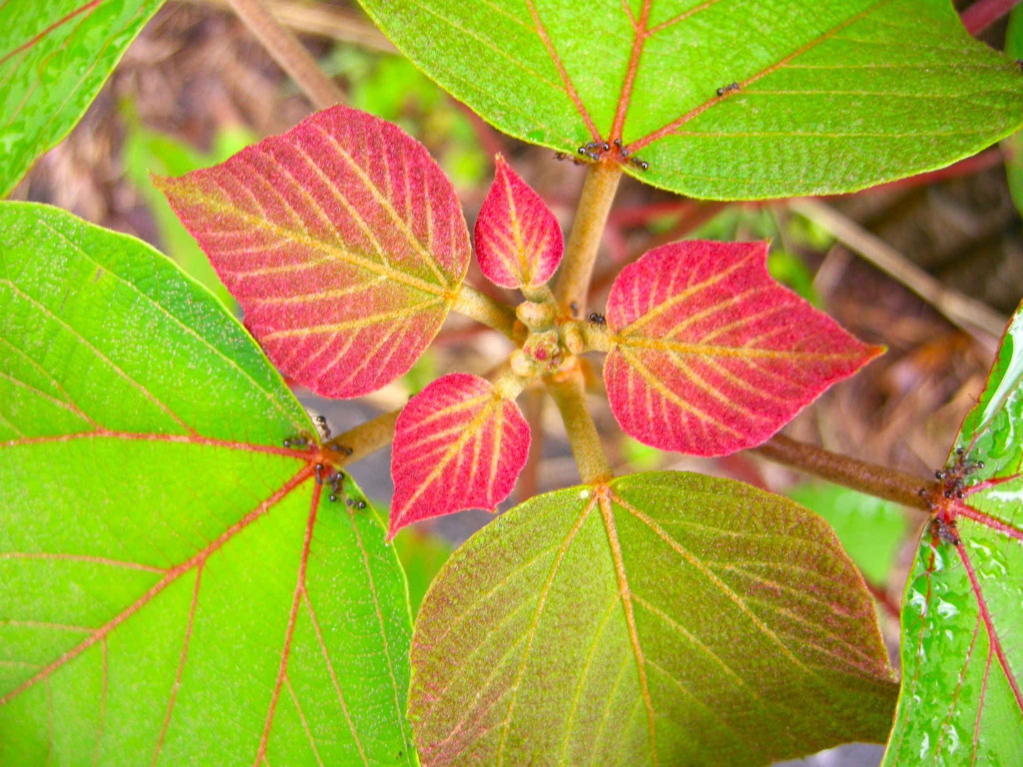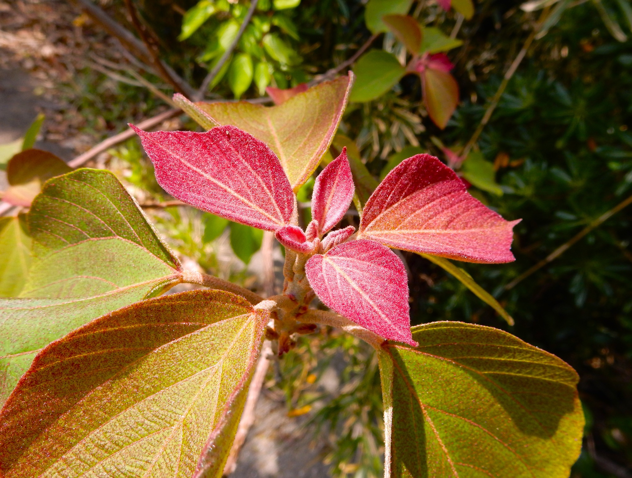 新芽が紅色なので、注目を集めます。この赤色は葉の表面がアントシアンという赤い色素を含む毛で被われているためです。