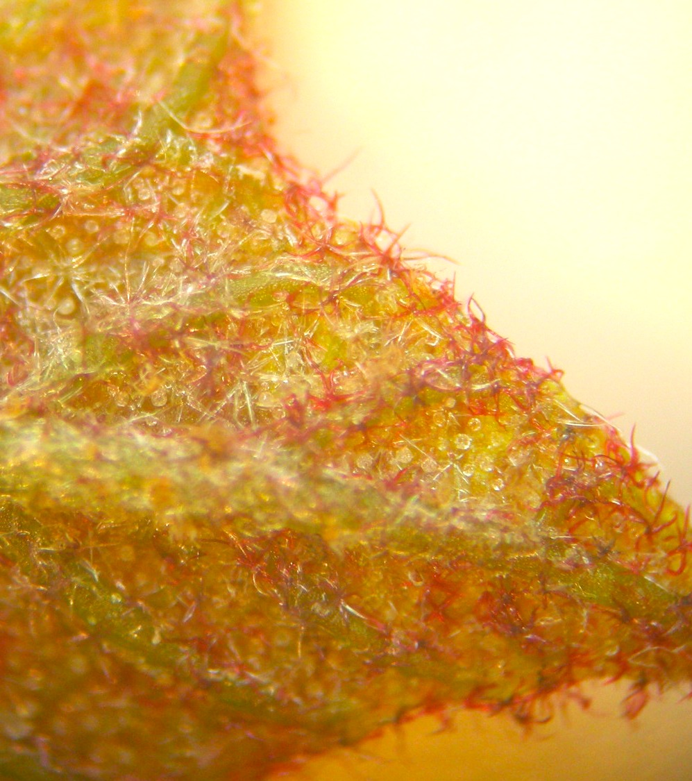 葉の表面をこすってみると、葉を被っている毛は剥がれて、緑色の葉が出てきます。