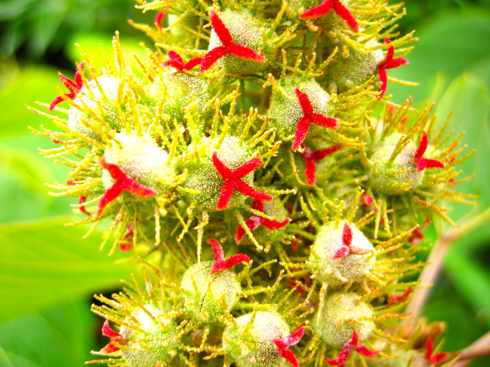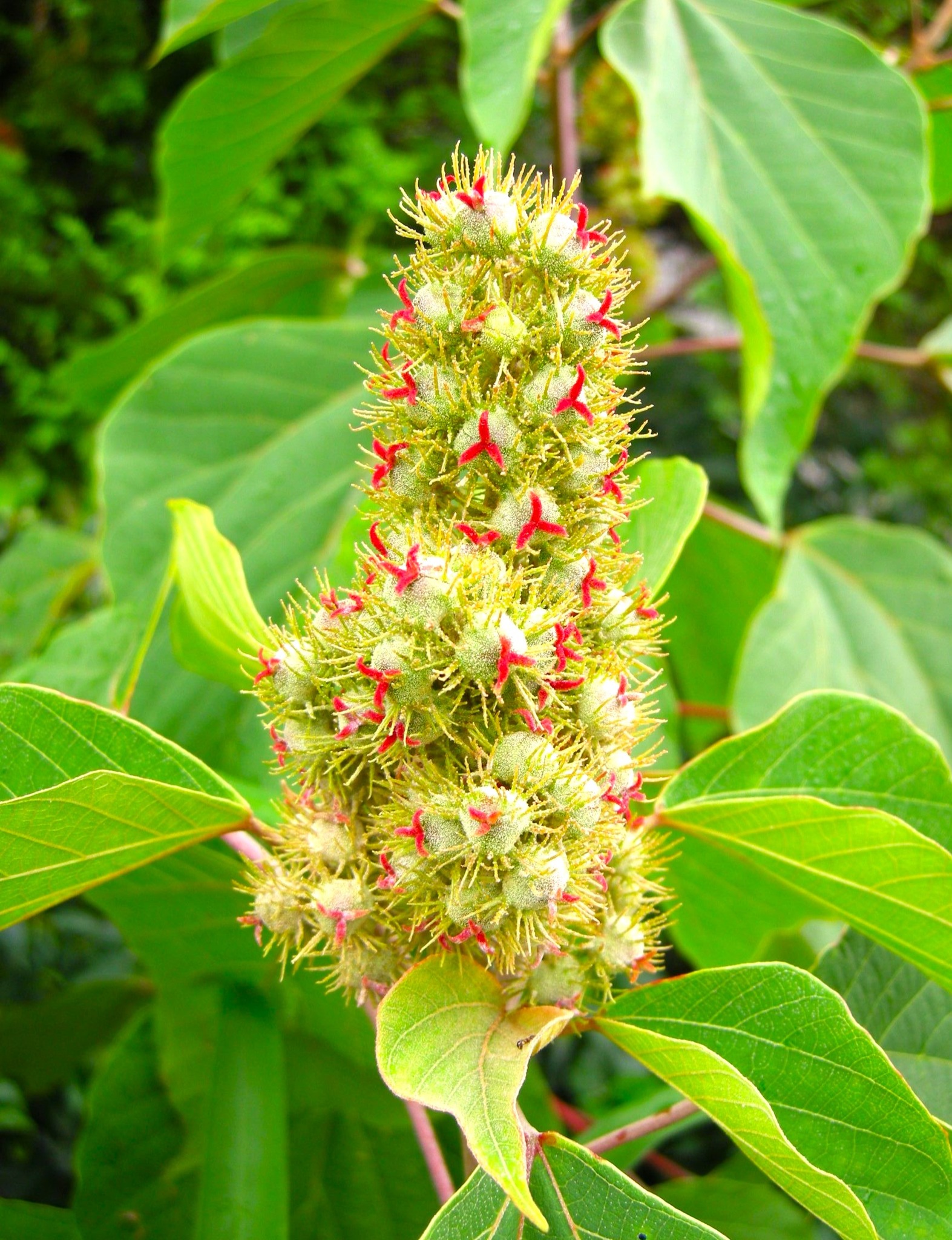 雄しべだけが多数ある雄花と、赤い柱頭(雌しべの頭の部分)が目立つ雌花は、同じ植物とは思えないような姿です。