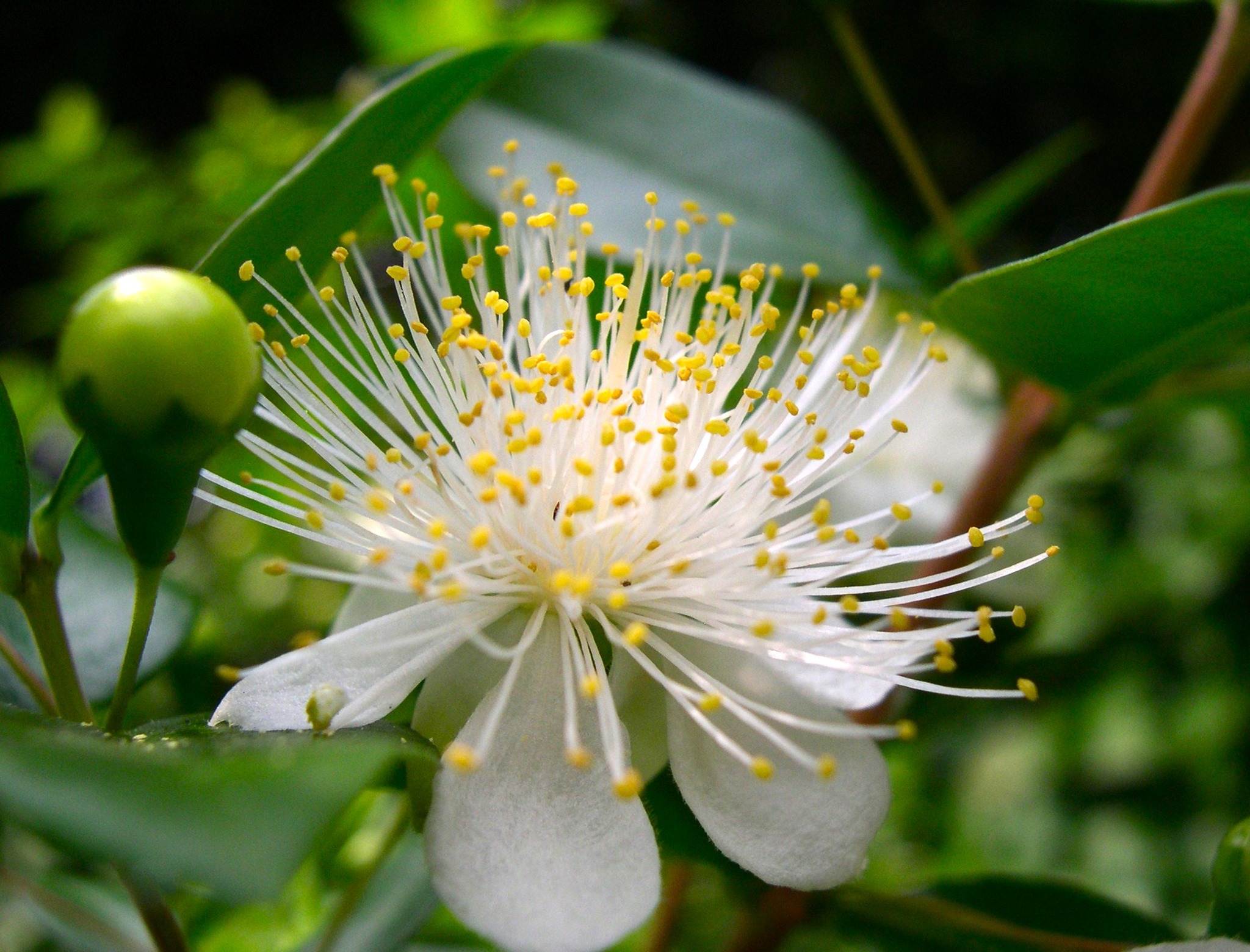 白い花びらと多数の雄しべの取り合わせが常緑の葉の中で際立ちます。