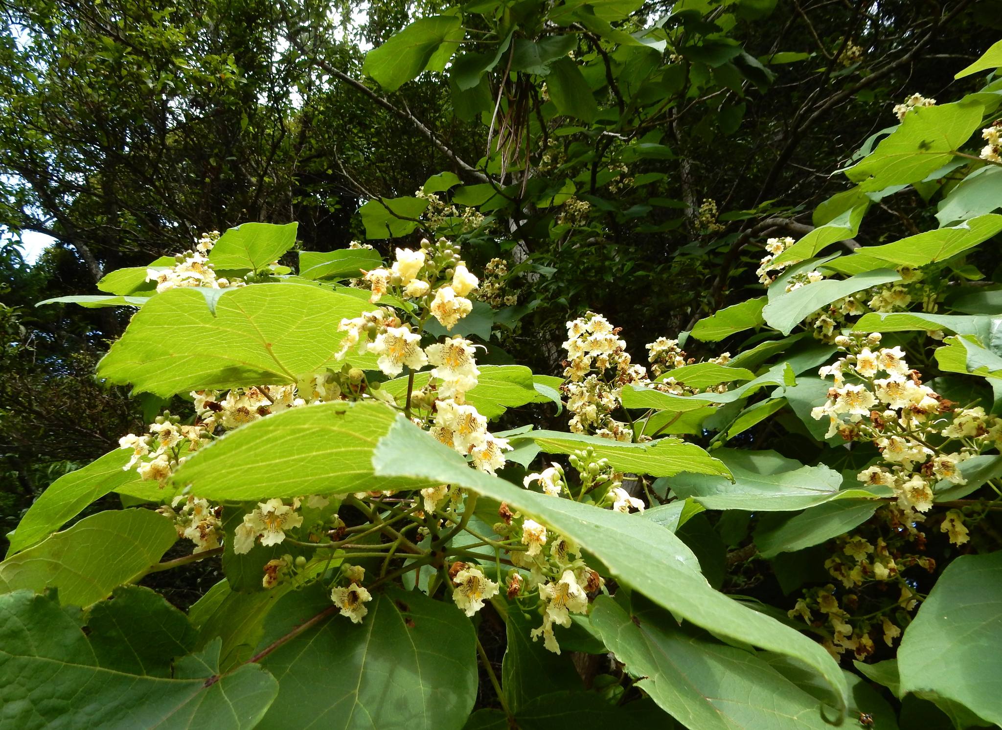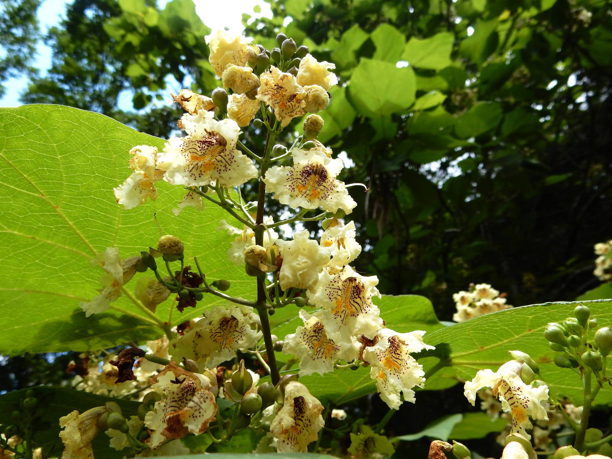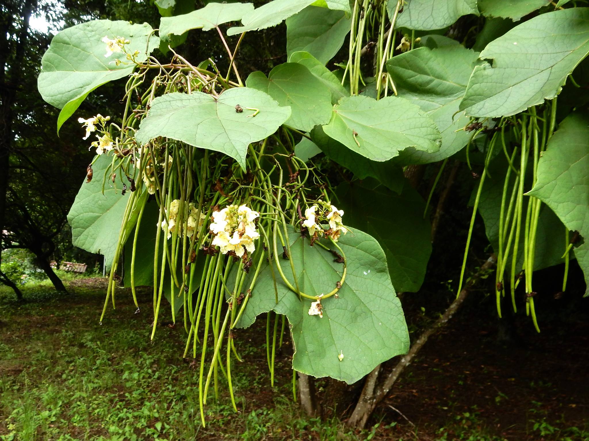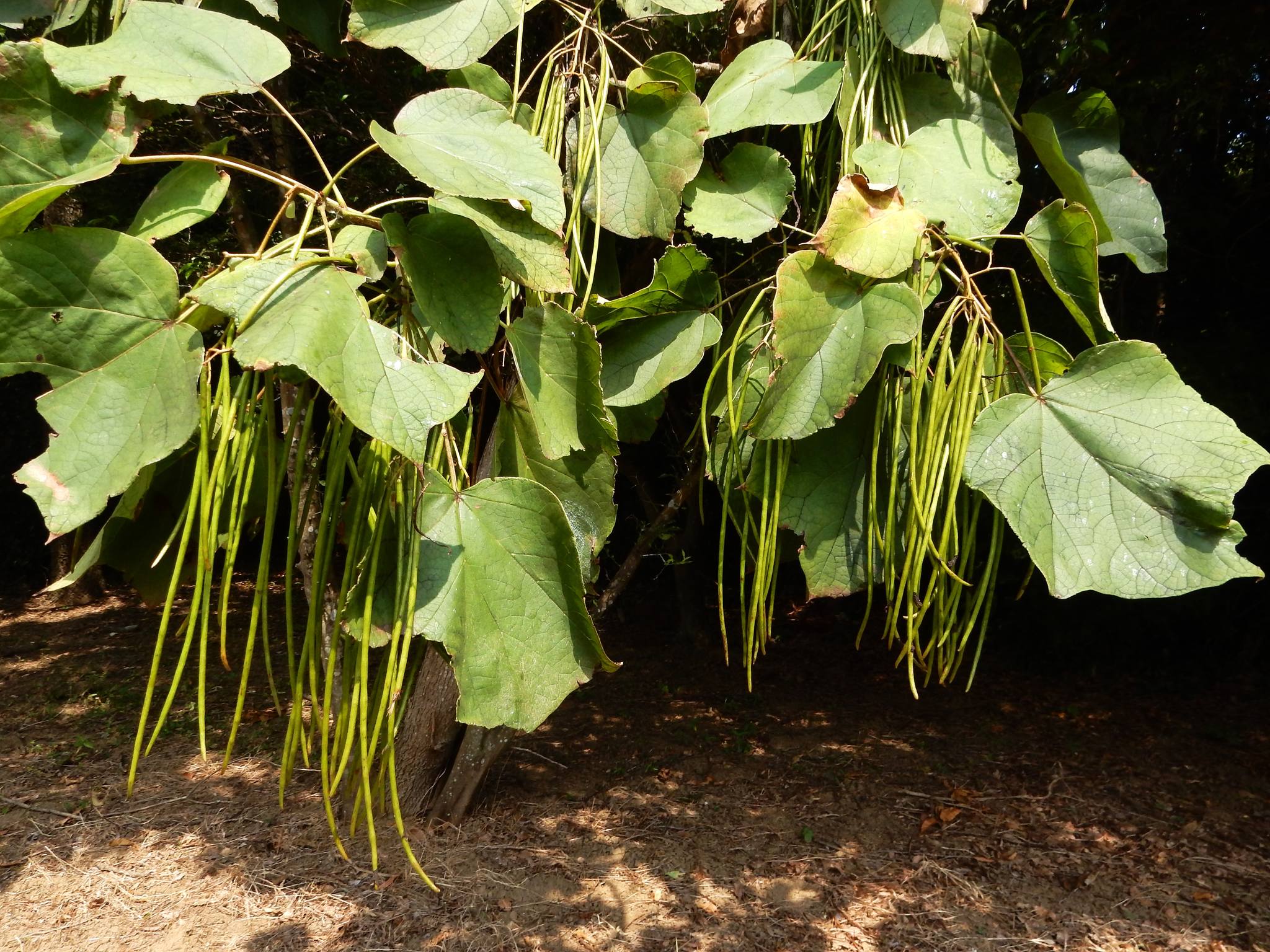 キリを思わせる大きな葉と簾のように垂れ下がる果実が印象的な木です。
