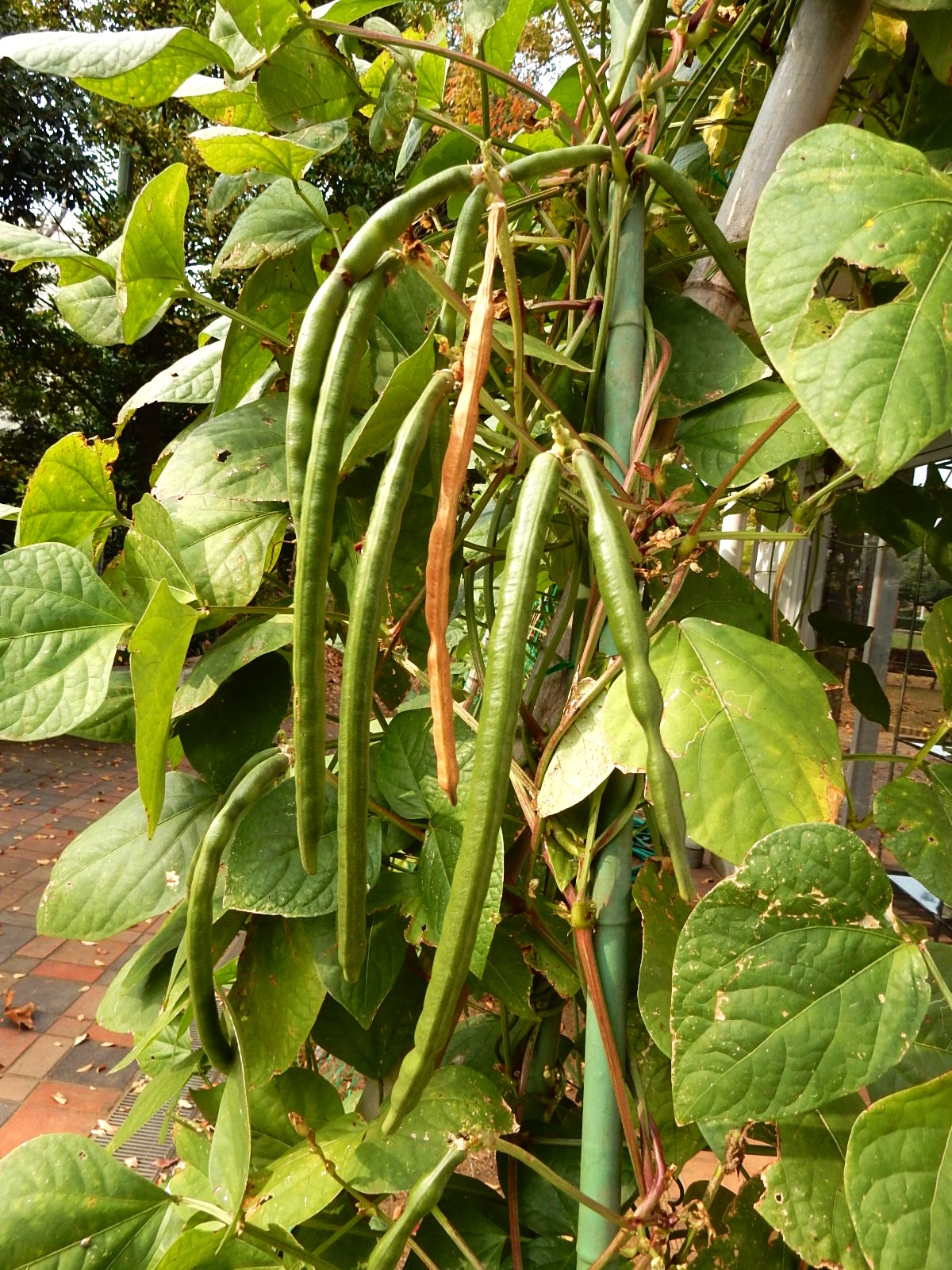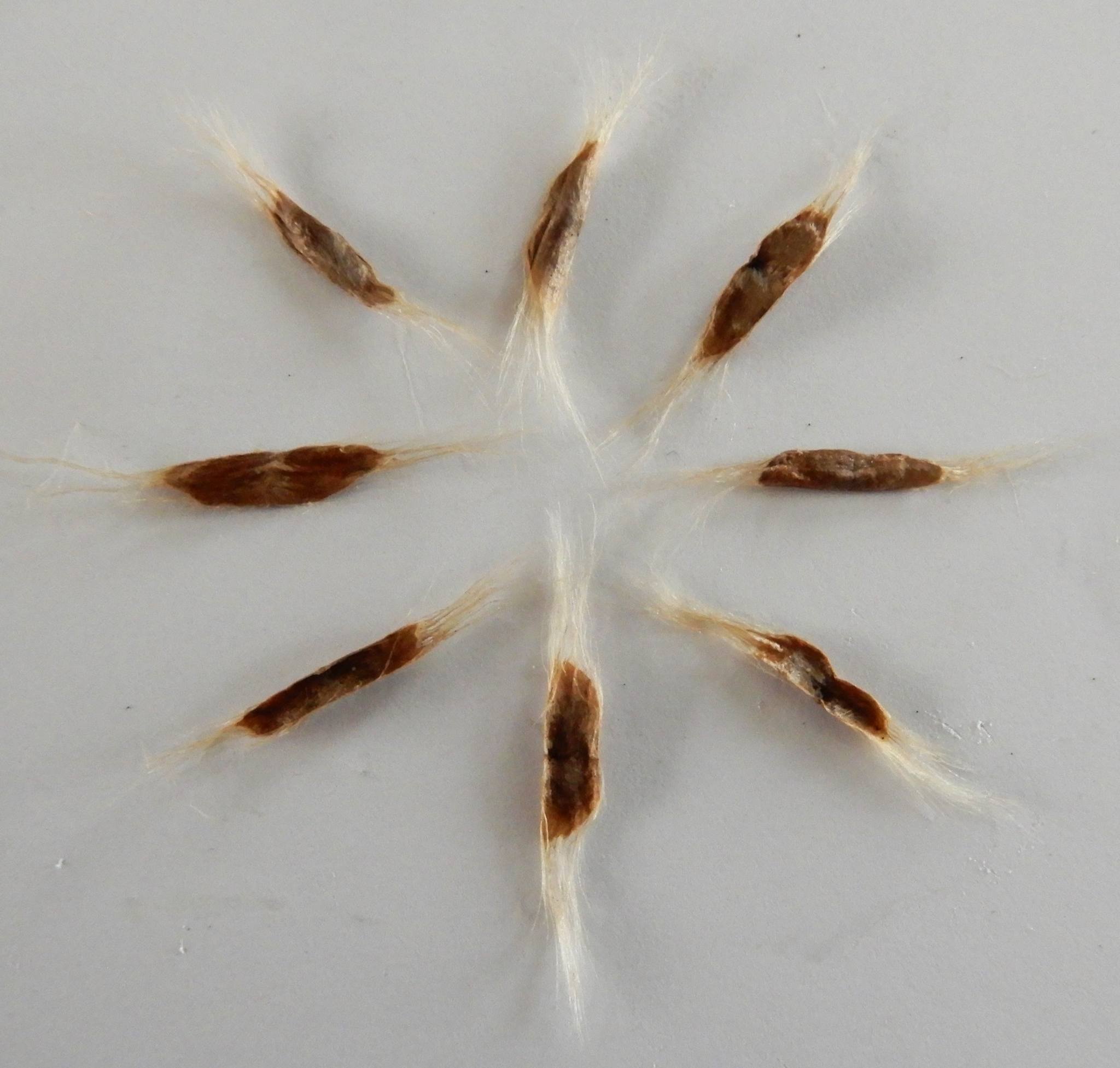 長い果実の形がササゲの豆果に似ていることからの名前ですが、ササゲのような豆はできません。中の種子(長さ8×10㎜)は、厚みがなく、両端に毛があって、風に乗って飛散します。地域によっては野生化もしています。