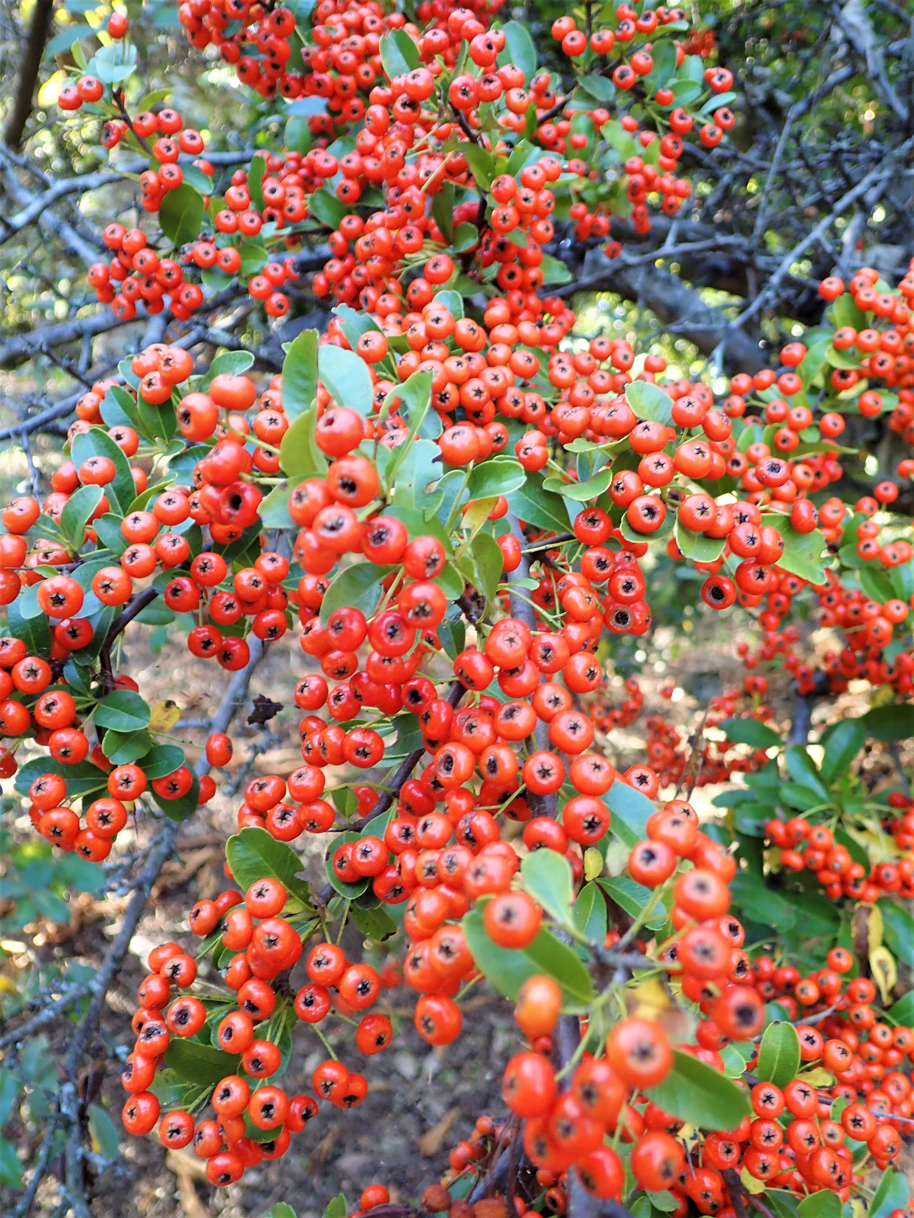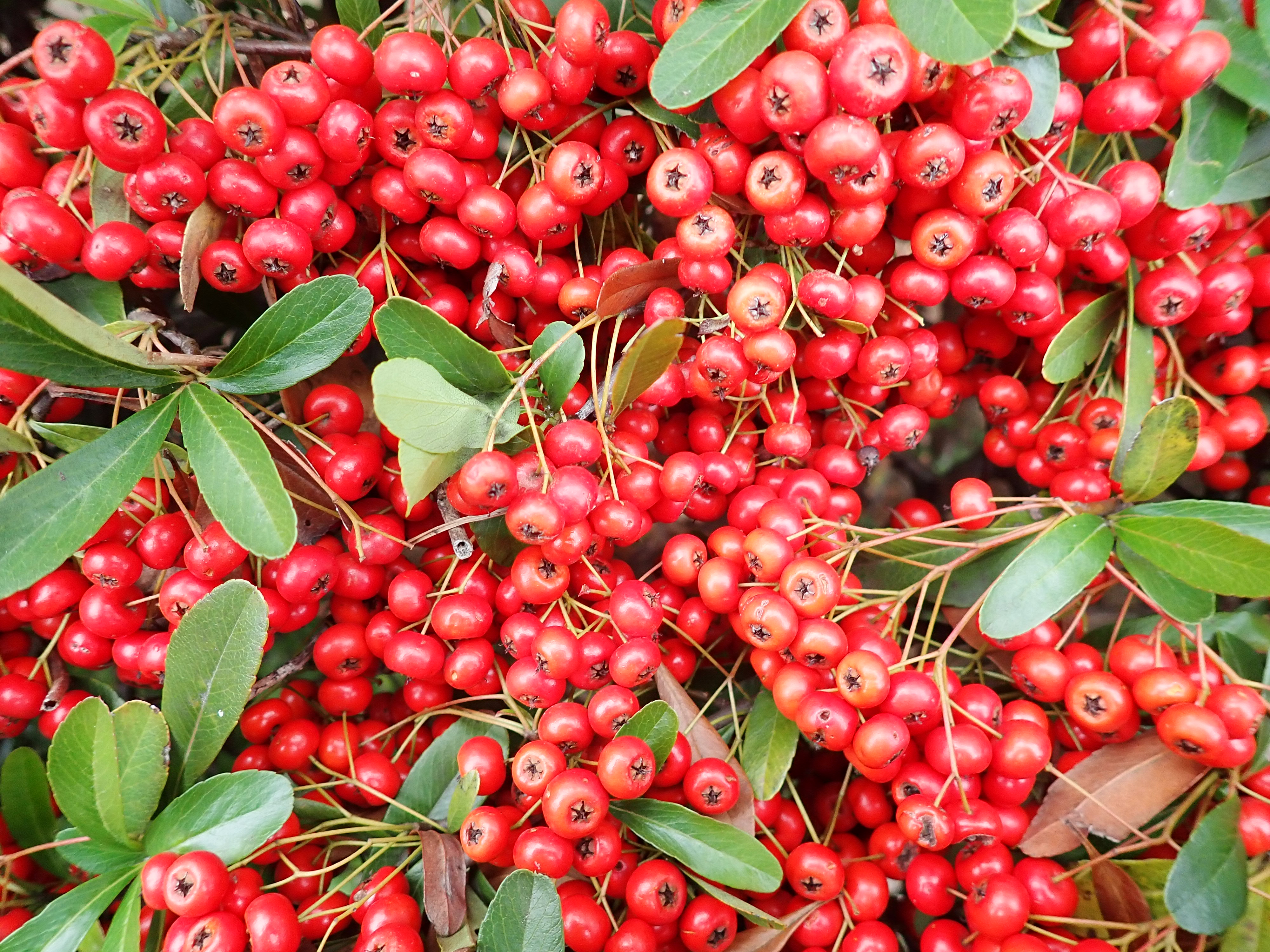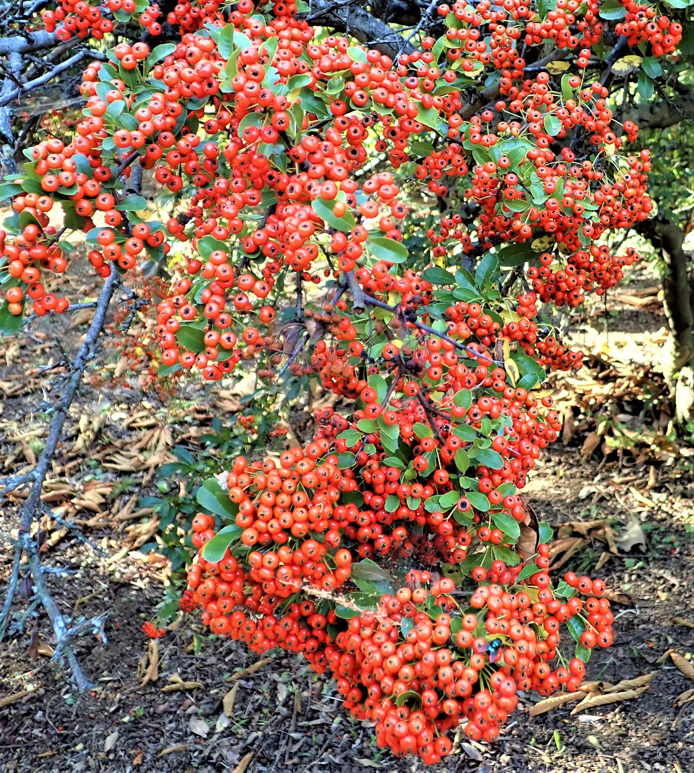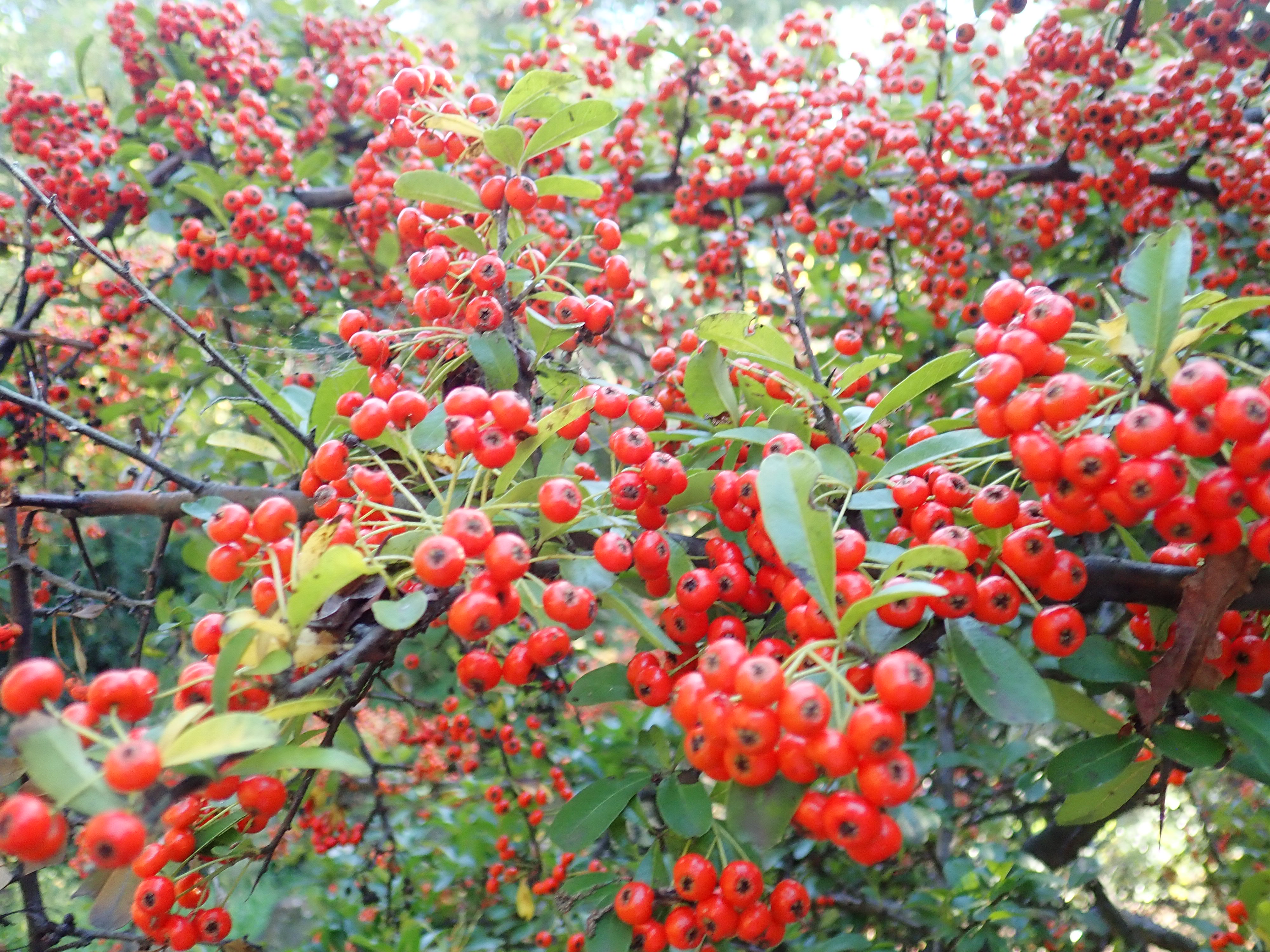 赤色の実をつけるのは南ヨーロッパ、アジア西部原産で、日本名はトキワサンザシ(葉が常緑のサンザシ)、柿色の実をつけるのは中国西南部原産で、日本名はタチバナモドキ(タチバナに似て非なるもの)と言います。
