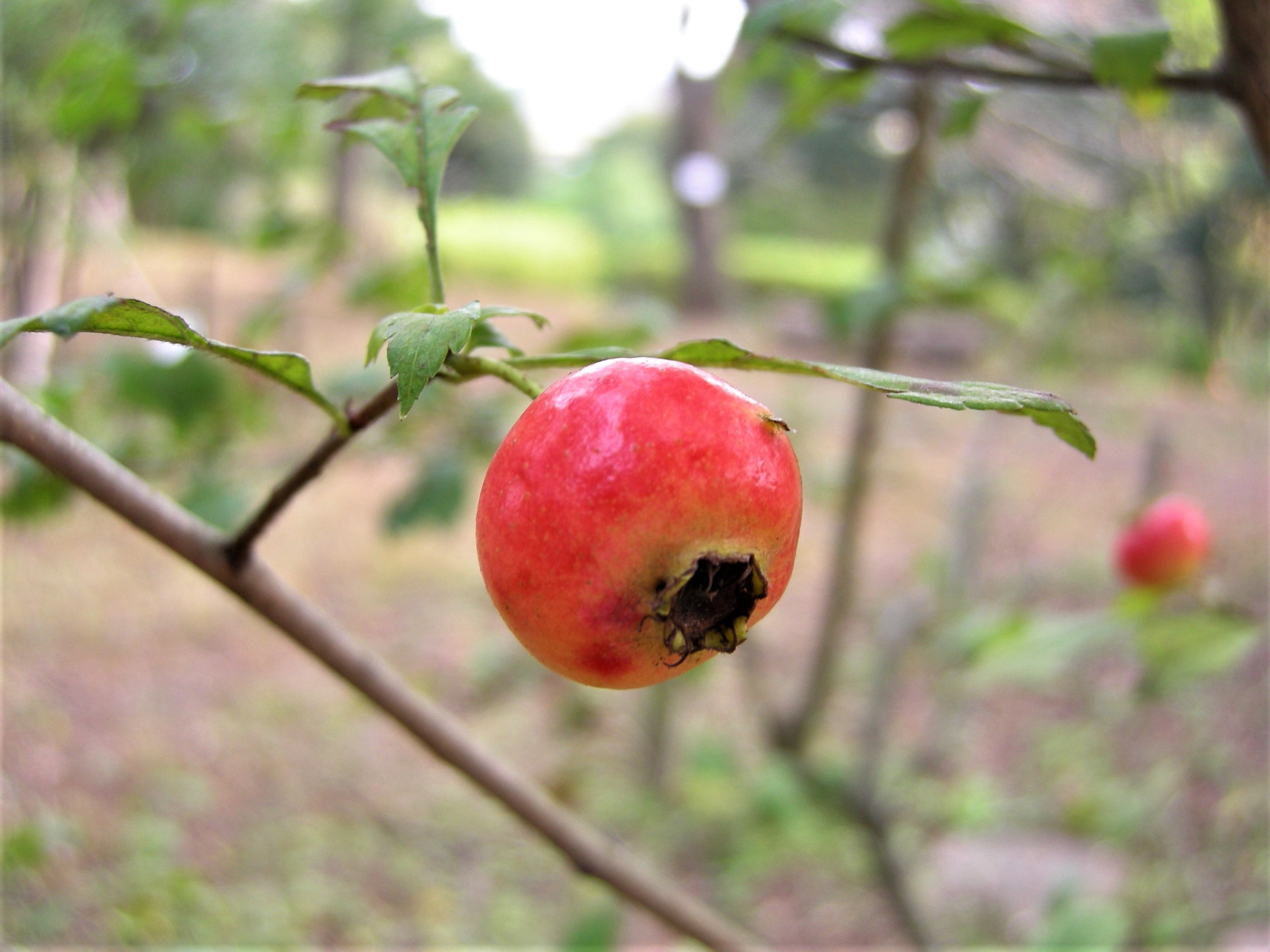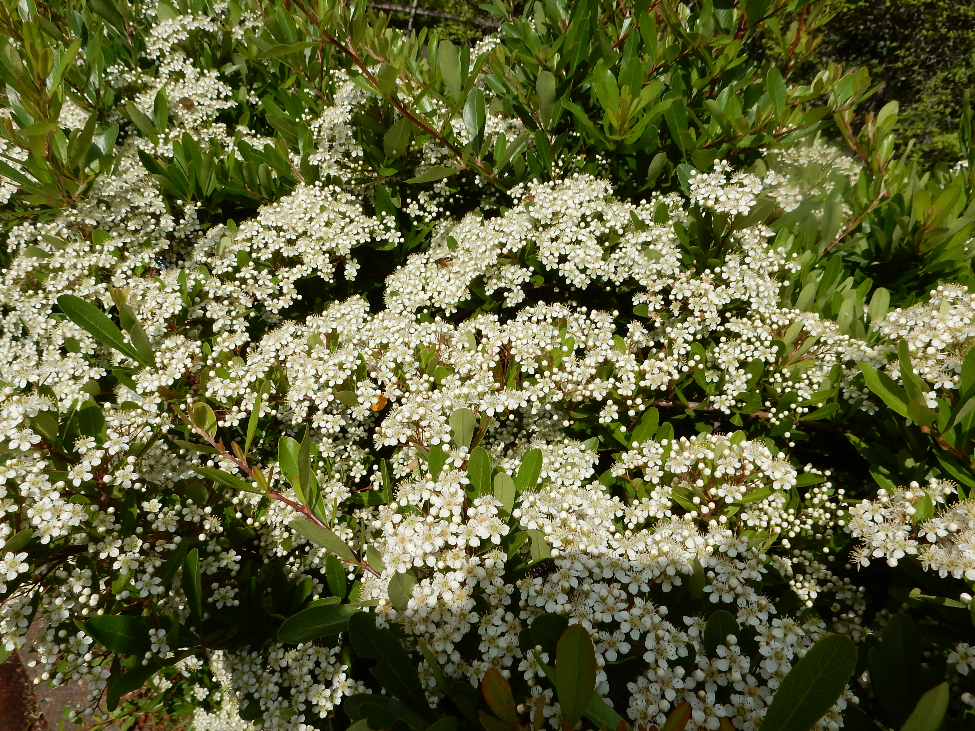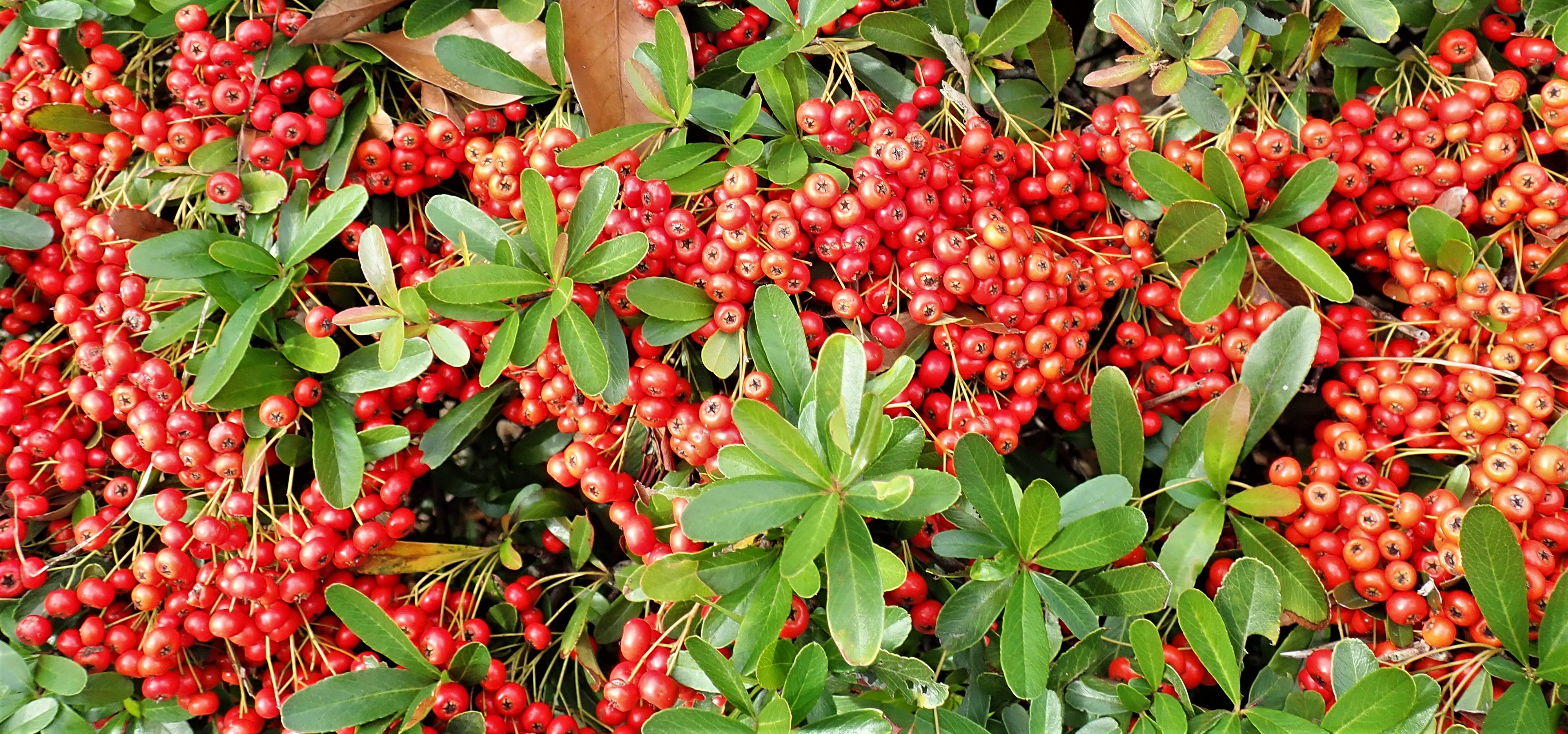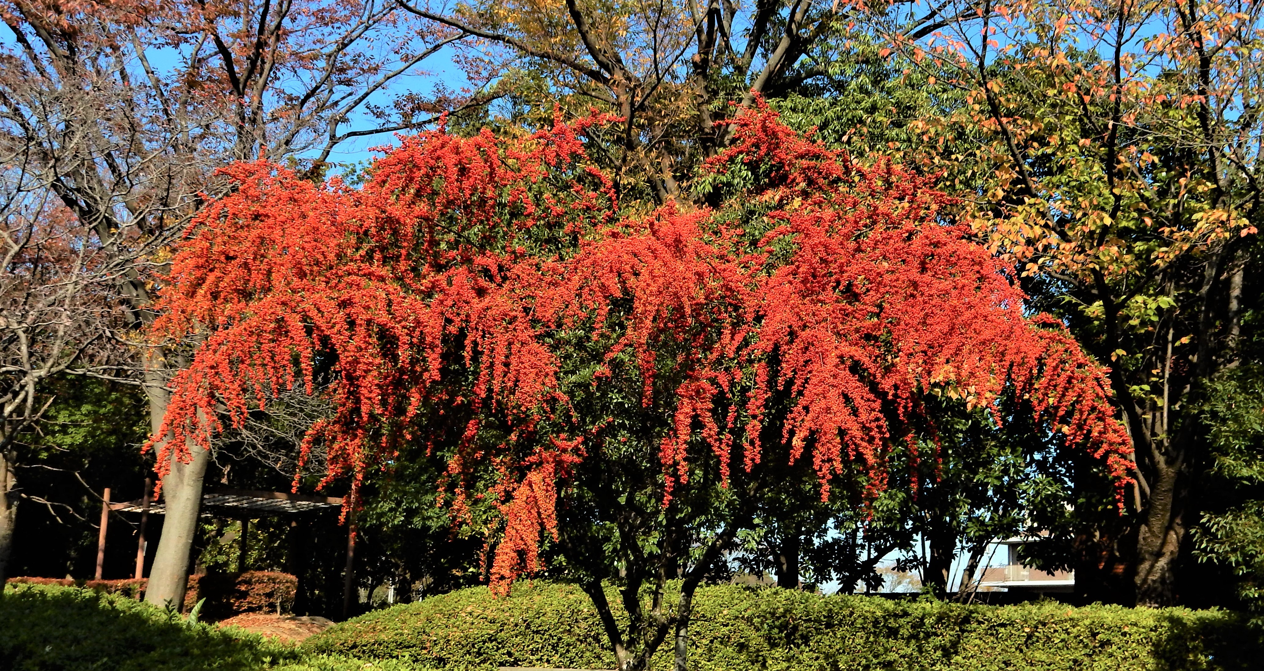 赤色の実をつけるのは南ヨーロッパ、アジア西部原産で、日本名はトキワサンザシ(葉が常緑のサンザシ)、柿色の実をつけるのは中国西南部原産で、日本名はタチバナモドキ(タチバナに似て非なるもの)と言います。