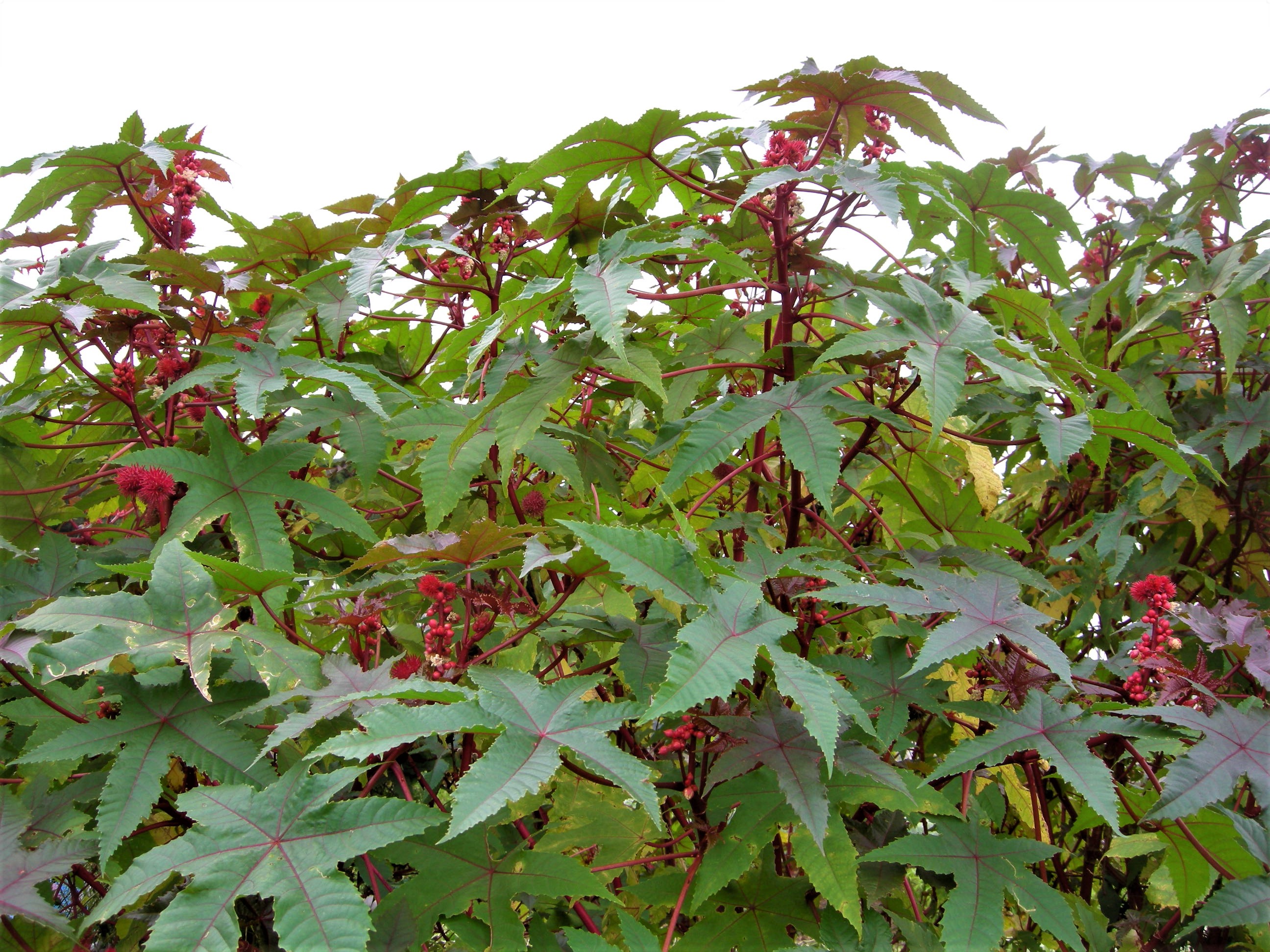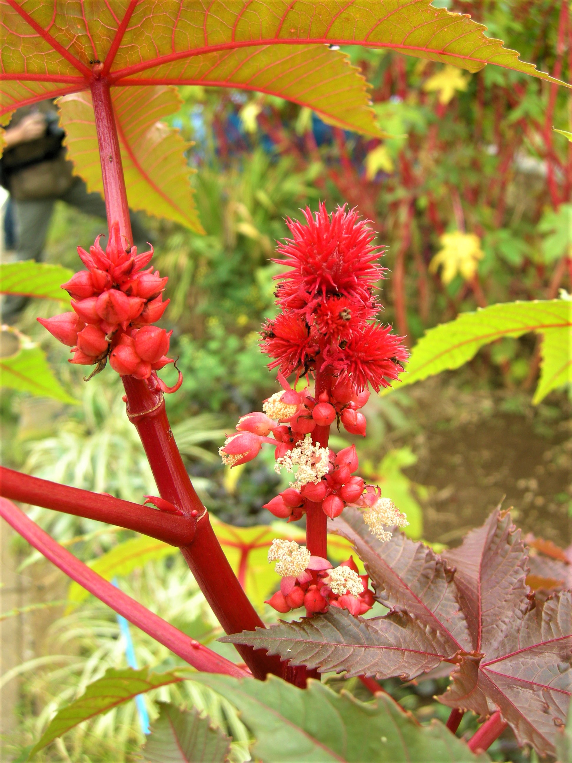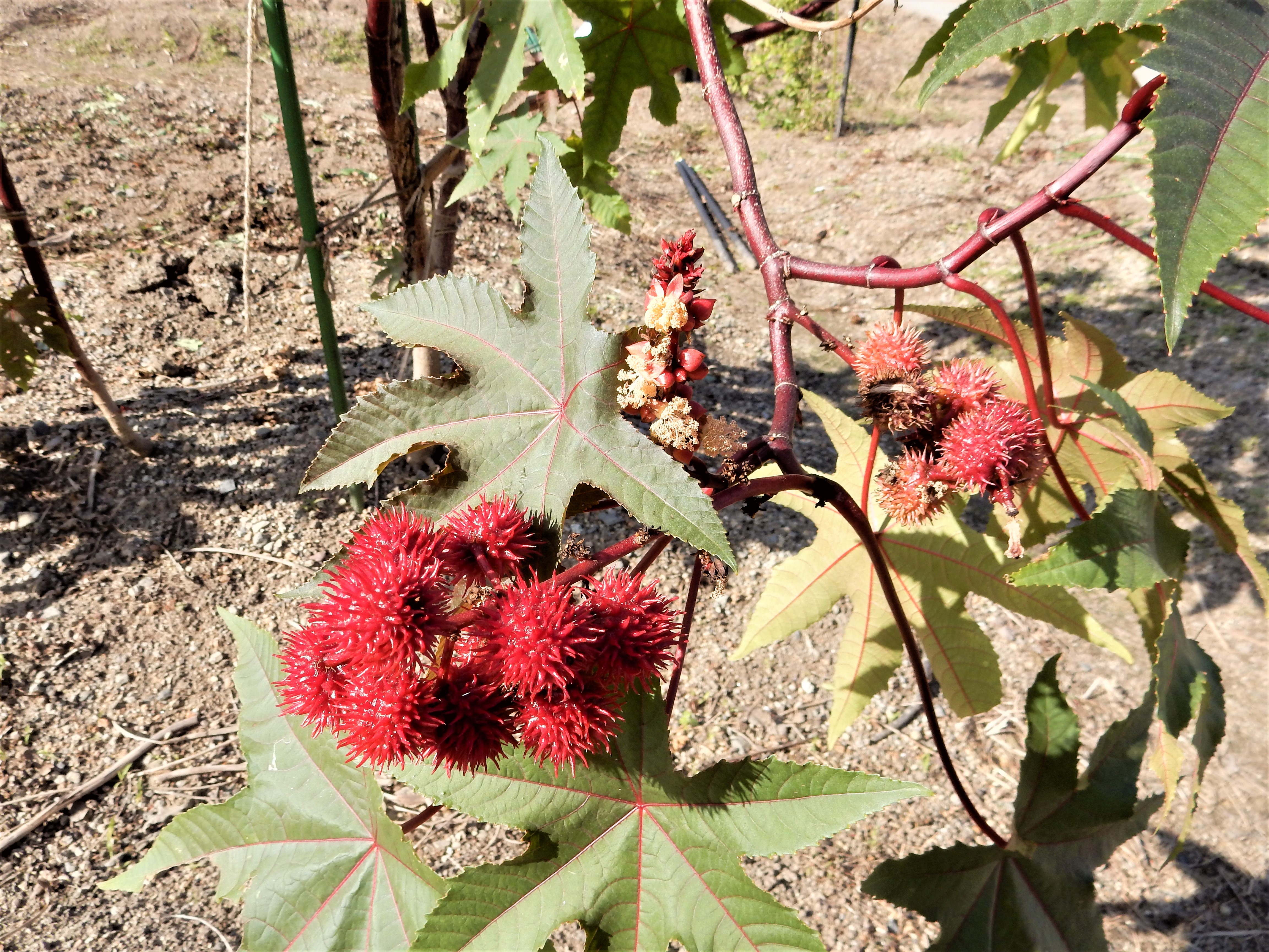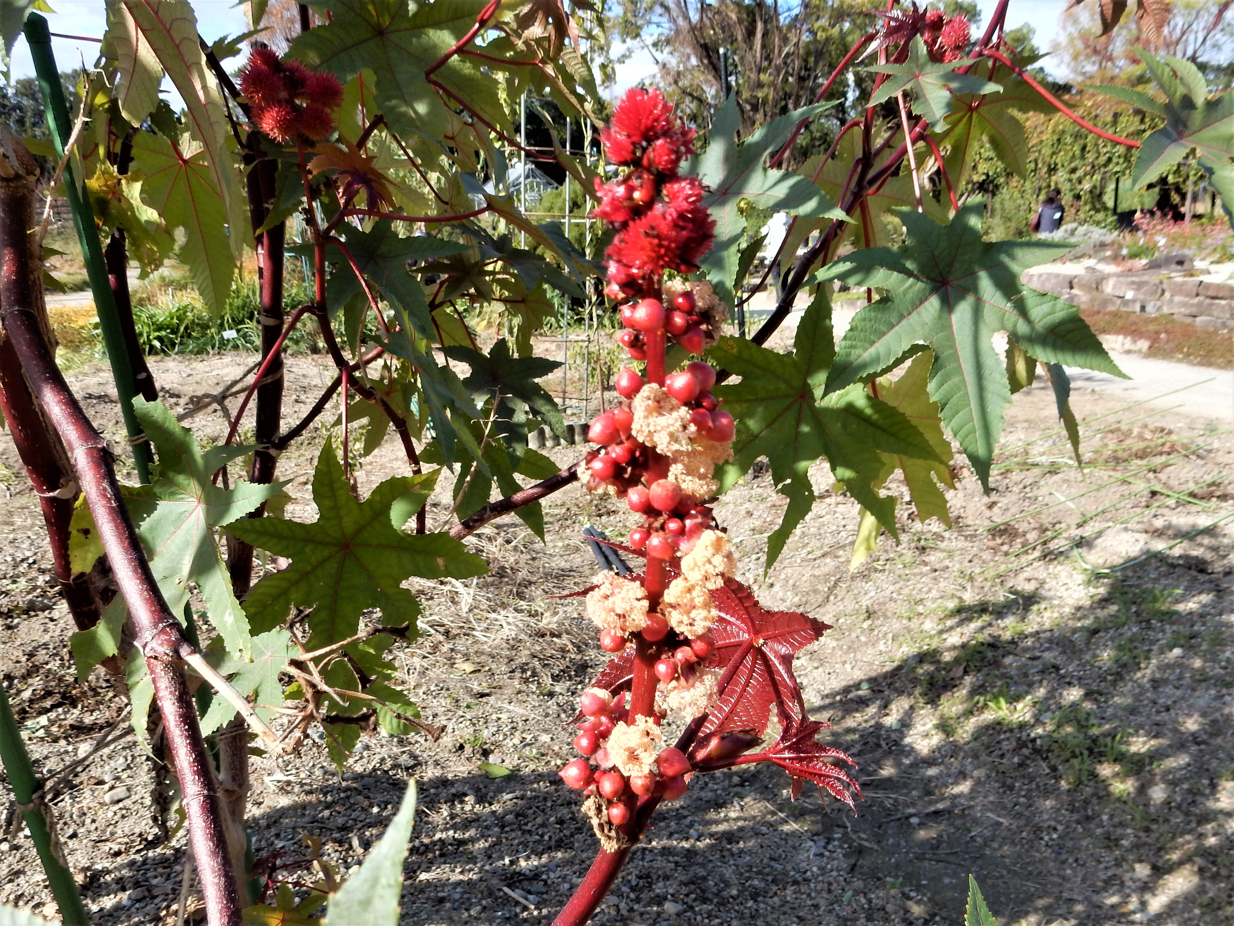 1㎝もある大きな種子を圧搾した油は、低温でも固まりにくいことから、工業用の潤滑油として利用された歴史があります。ひまし油(蓖麻子油)と聞くと、思い出される方もあるかもしれません。工業用には花色が緑色の品種が使われていたようですが、現在目にするトウゴマは若芽、花、果実が紅い「ベニヒマ」と呼ばれる品種が多く、緑色の品種を見る機会は稀です。