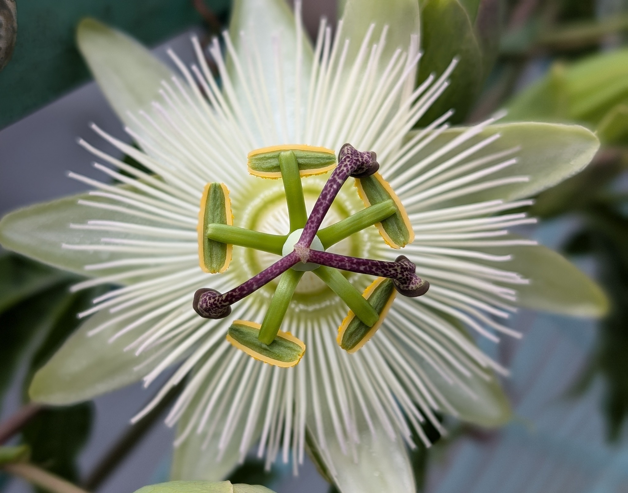 花の中央にある三裂した雌しべの先端を時計の長針、短針、秒針と見なしたと言われています。花弁と萼を取りまくように多数の糸状のものがあります。副花冠と呼ばれる飾りのようなもので、虫を呼んでいるのかもしれません。