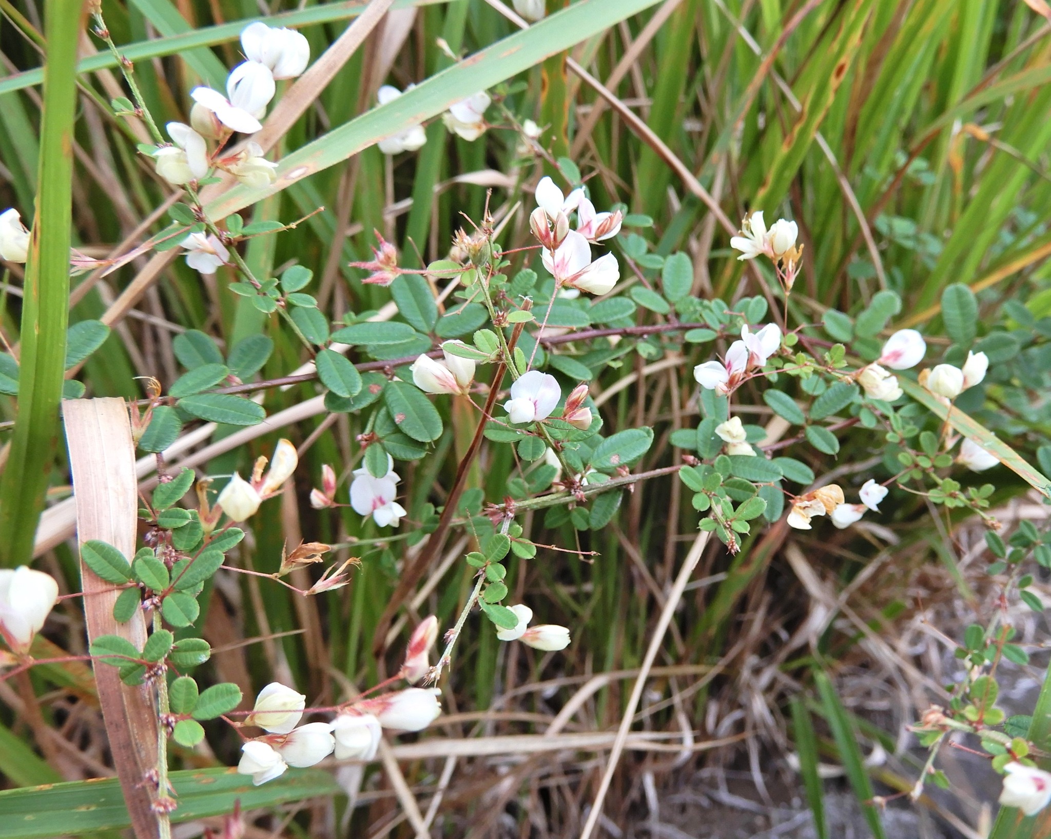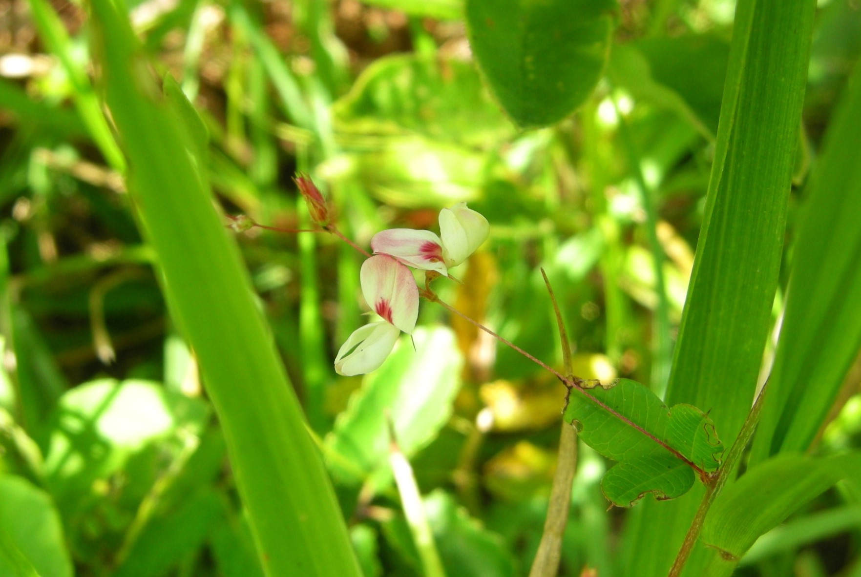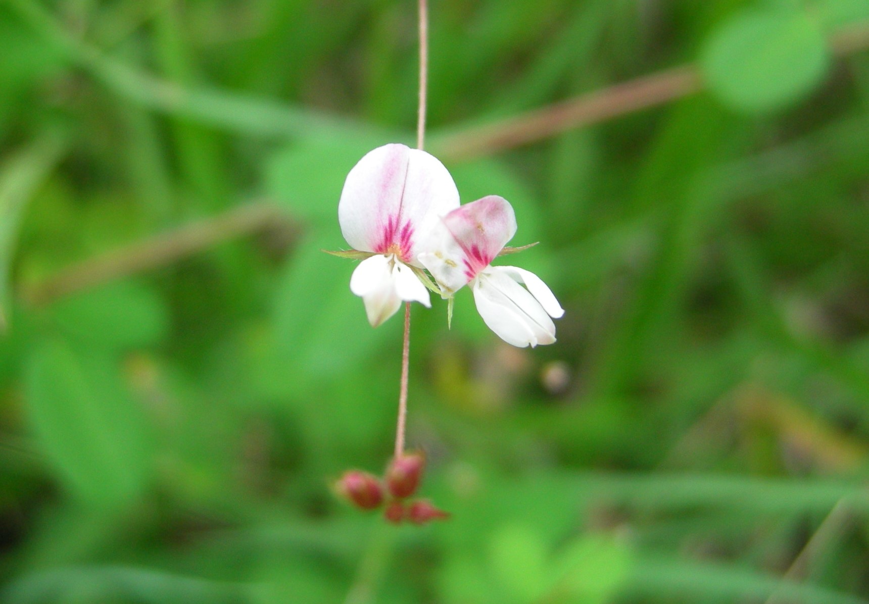 葉の脇から伸びるごく細い柄の先に数個の白色のマメの花を咲かせます。花は小さいのですが、旗弁(きべん)と呼ばれる一番大きい花弁の基部が淡紅紫色を帯びていて、虫を呼ぶ目印になっています。
