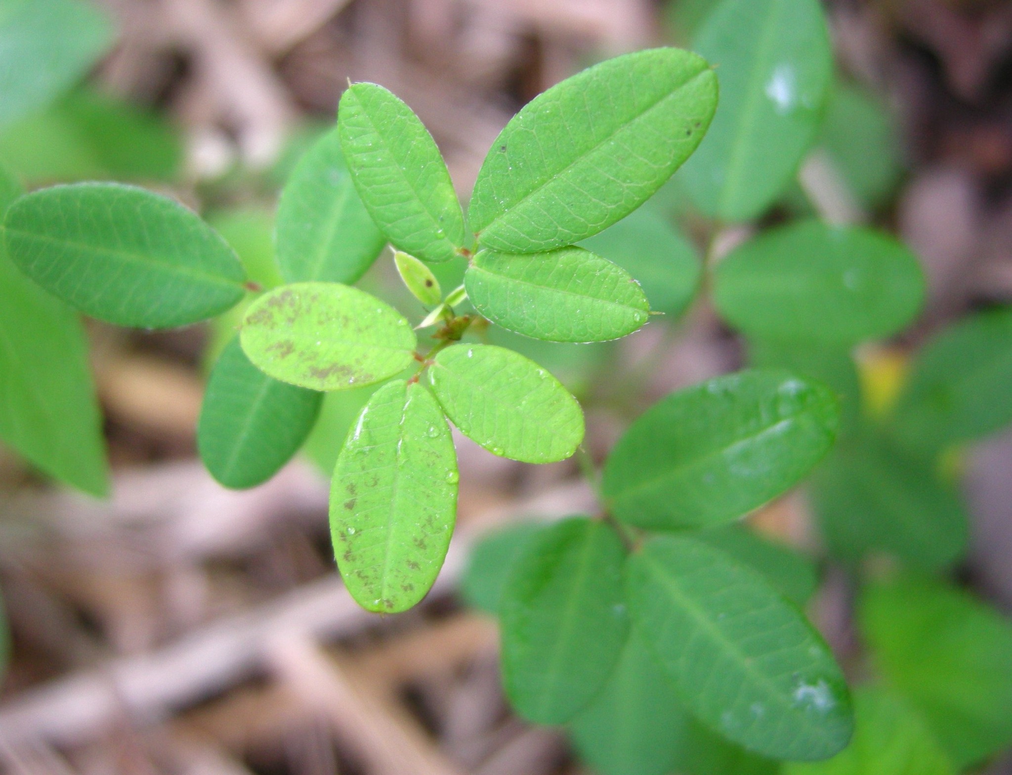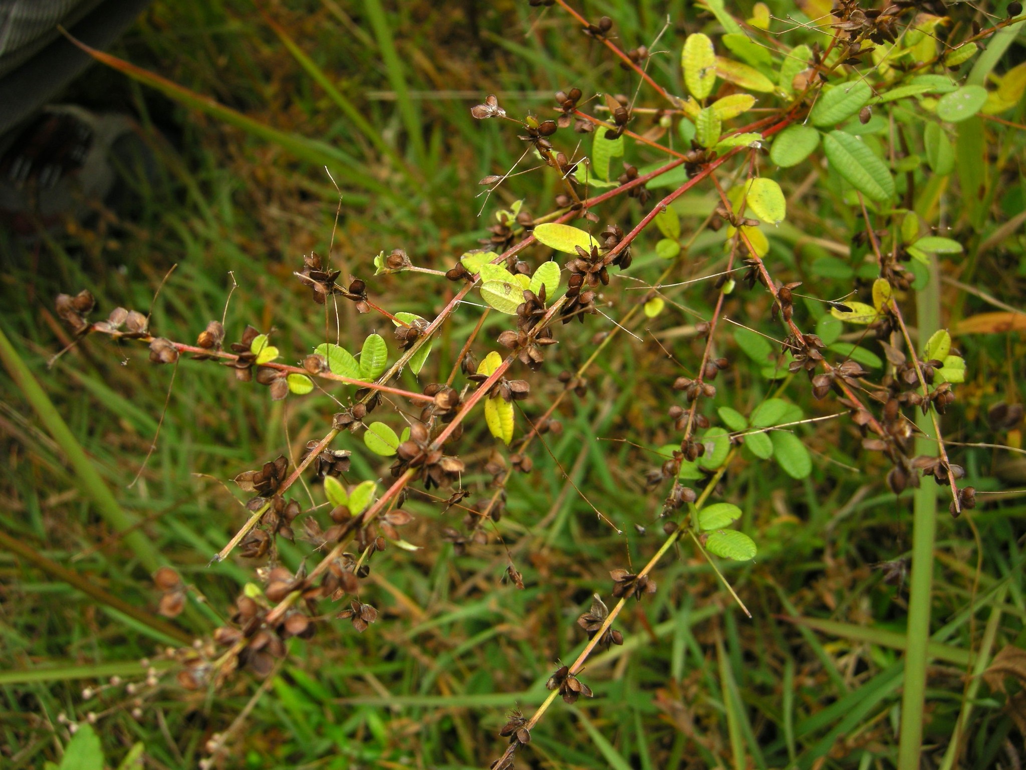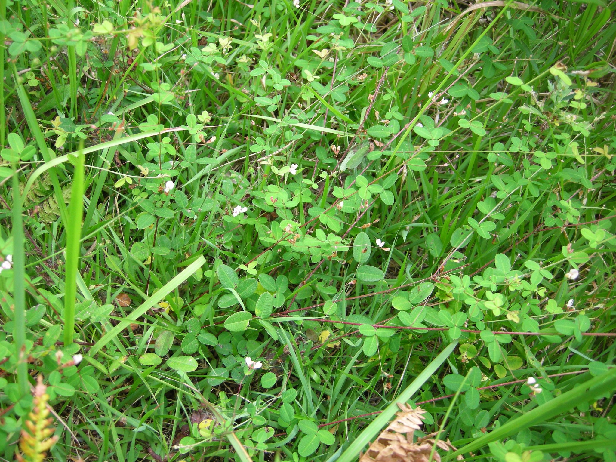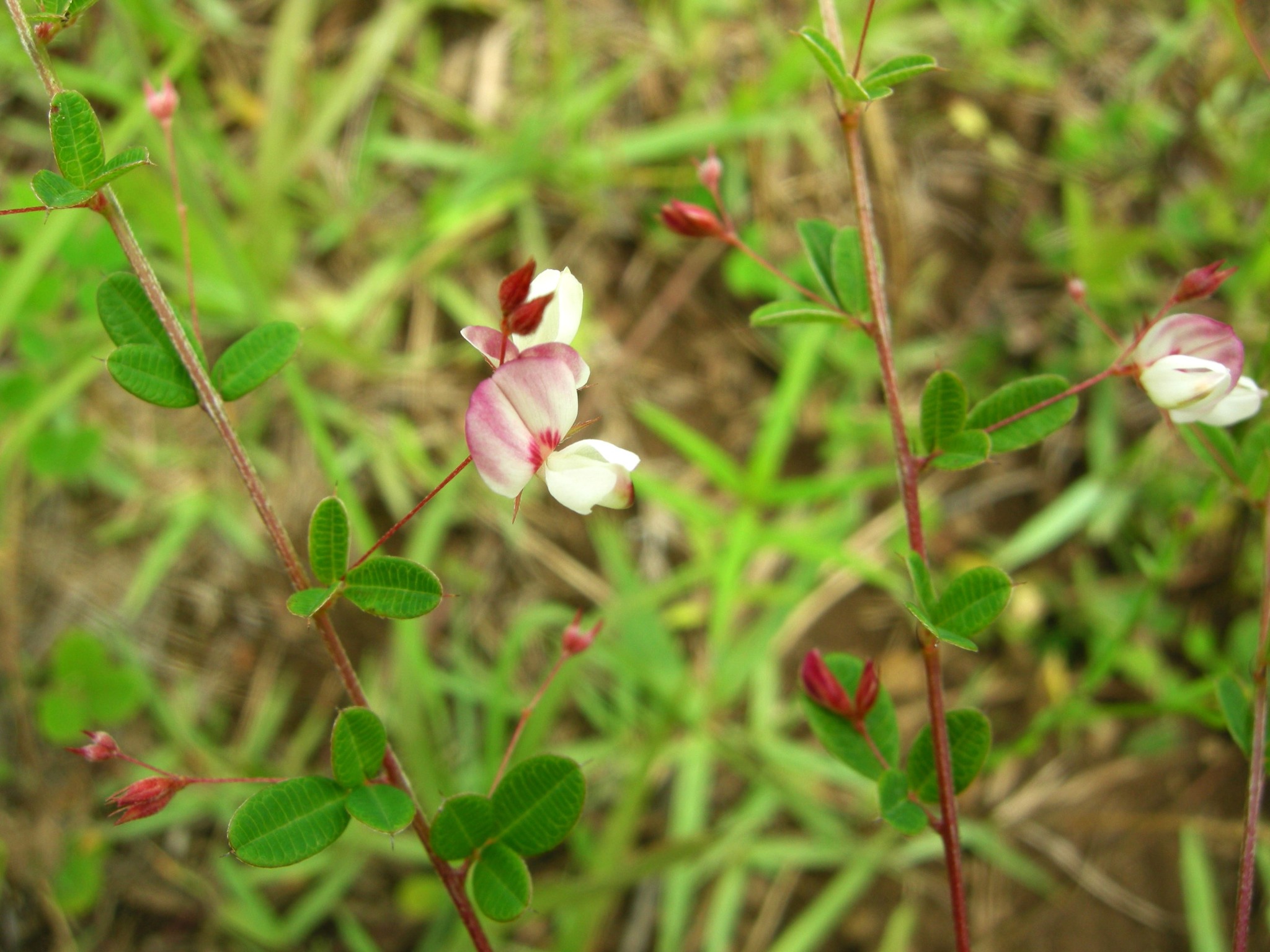 葉の脇から伸びるごく細い柄の先に数個の白色のマメの花を咲かせます。花は小さいのですが、旗弁(きべん)と呼ばれる一番大きい花弁の基部が淡紅紫色を帯びていて、虫を呼ぶ目印になっています。