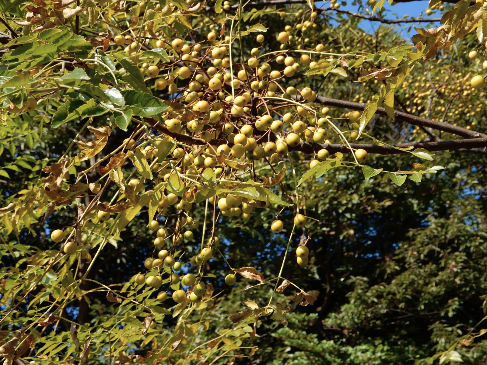 遠目に見ると、数珠がたくさんあるように見えて、「千珠」「千玉」からセンダンに転化したとか、「千団子」のように見えることからとか、名前の由来は諸説あるようです。