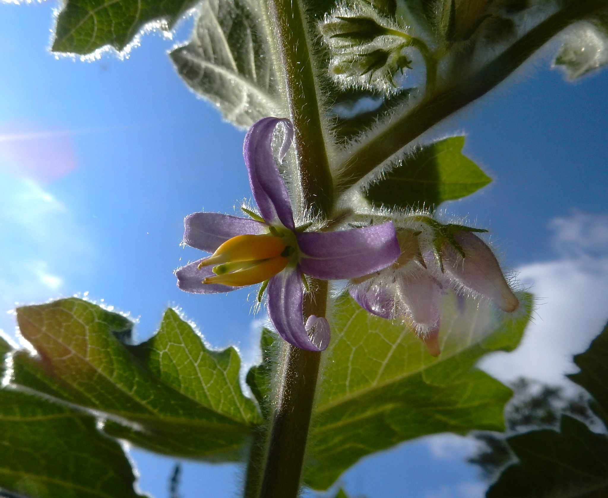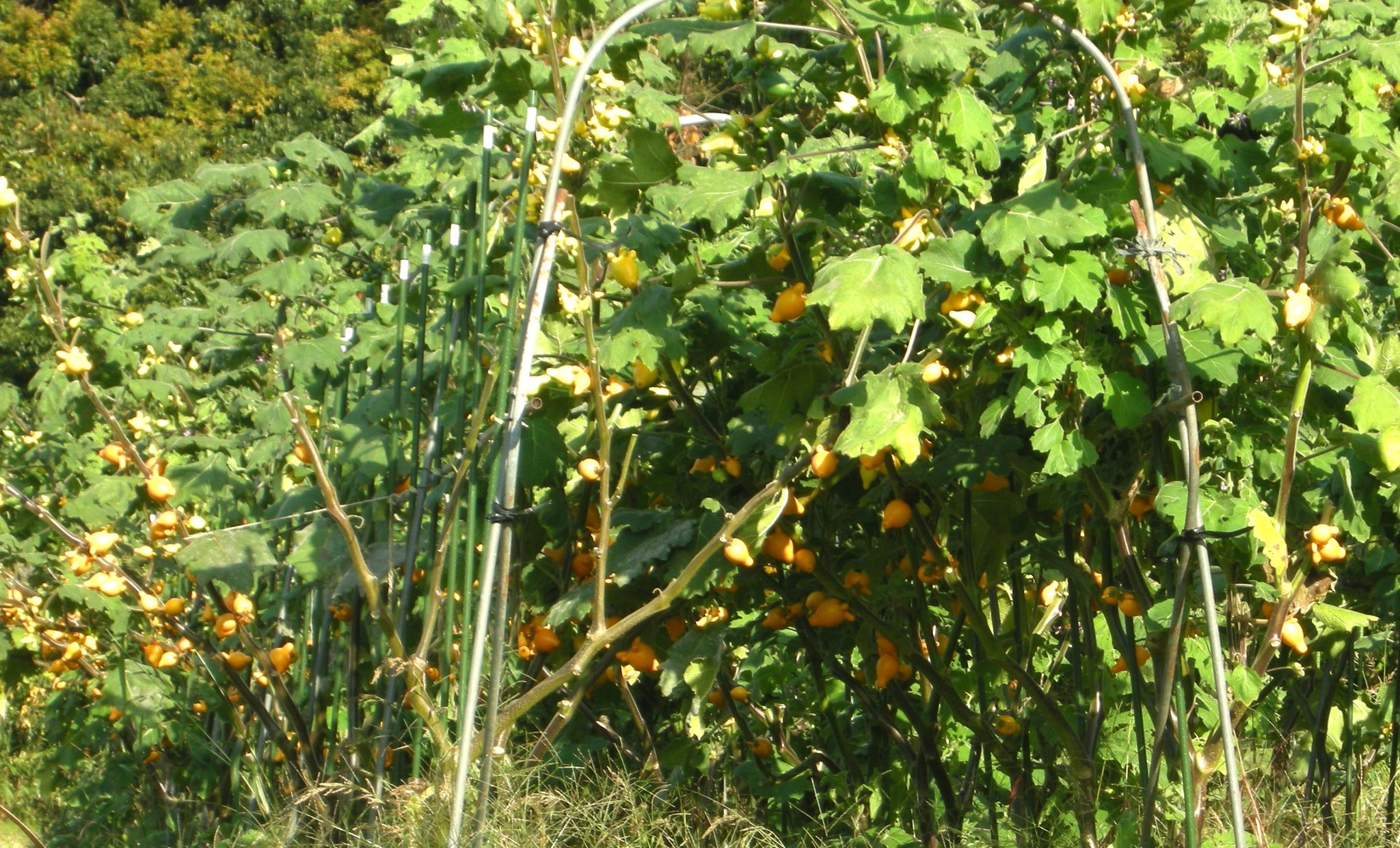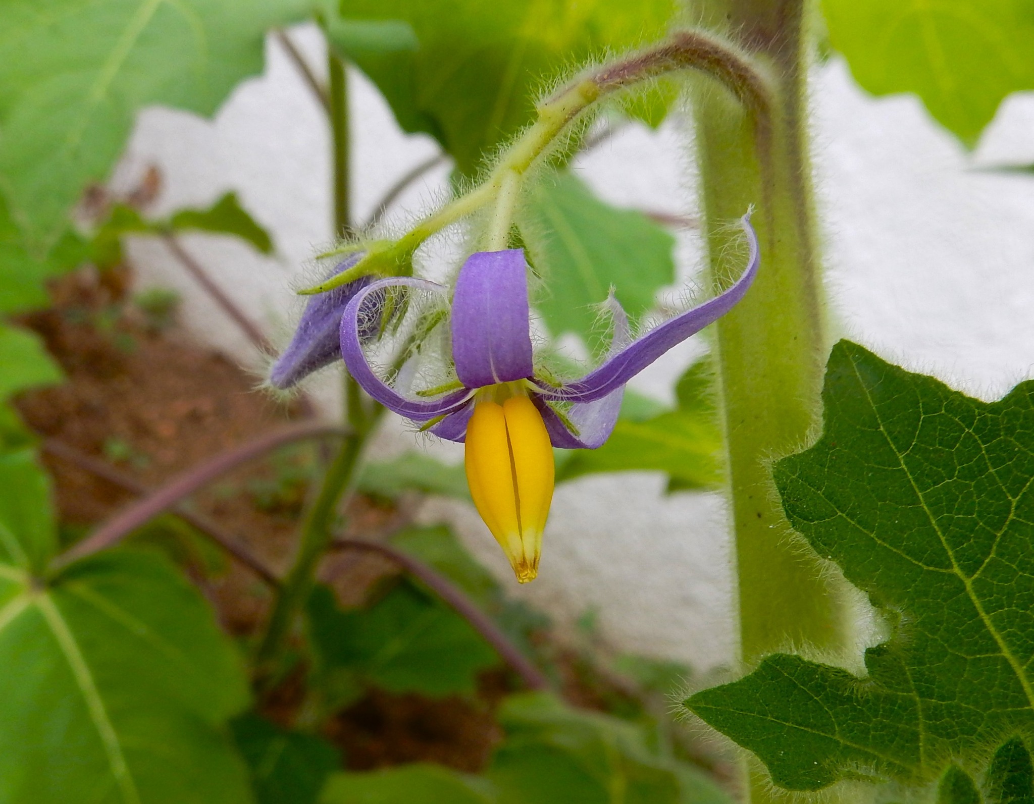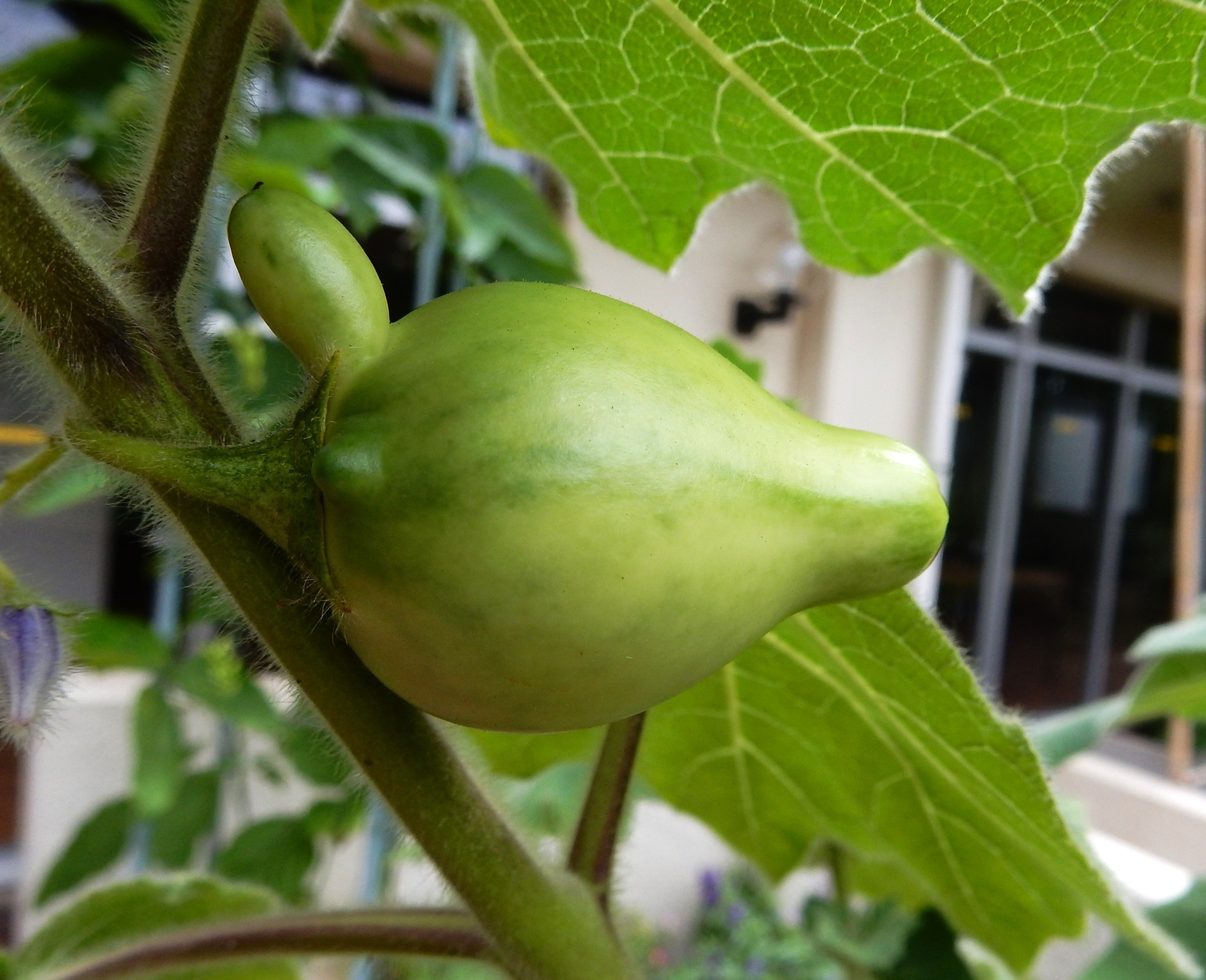 草丈2mほども伸びることもあります。茎にも葉にも刺がありますので、触る時は注意してください。暖かい原産地では、半常緑低木として毎年実をつけますが、冬の気温が低い日本では一年草として扱われています。夏にはナスの花に似た大振りな花をつけます。