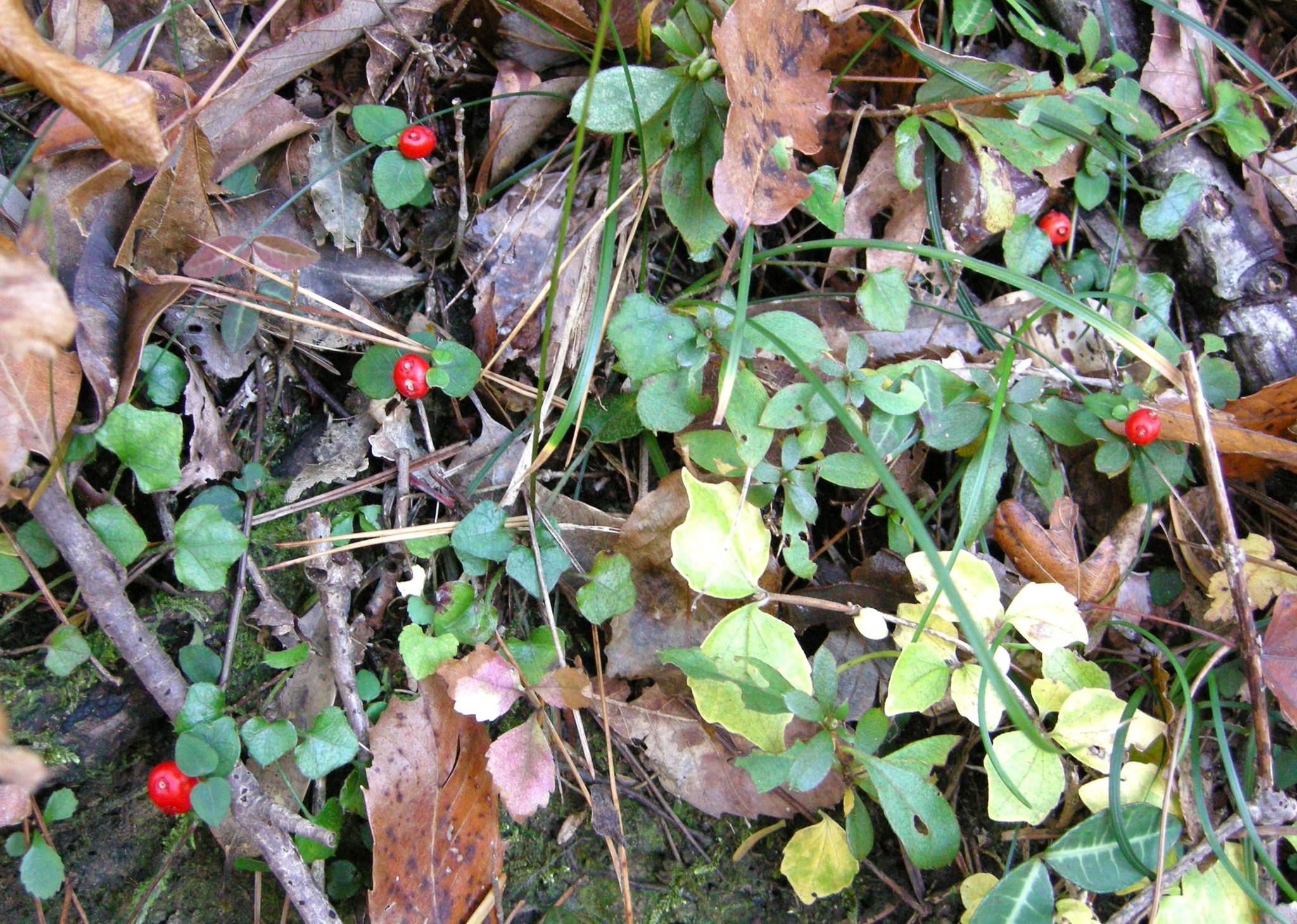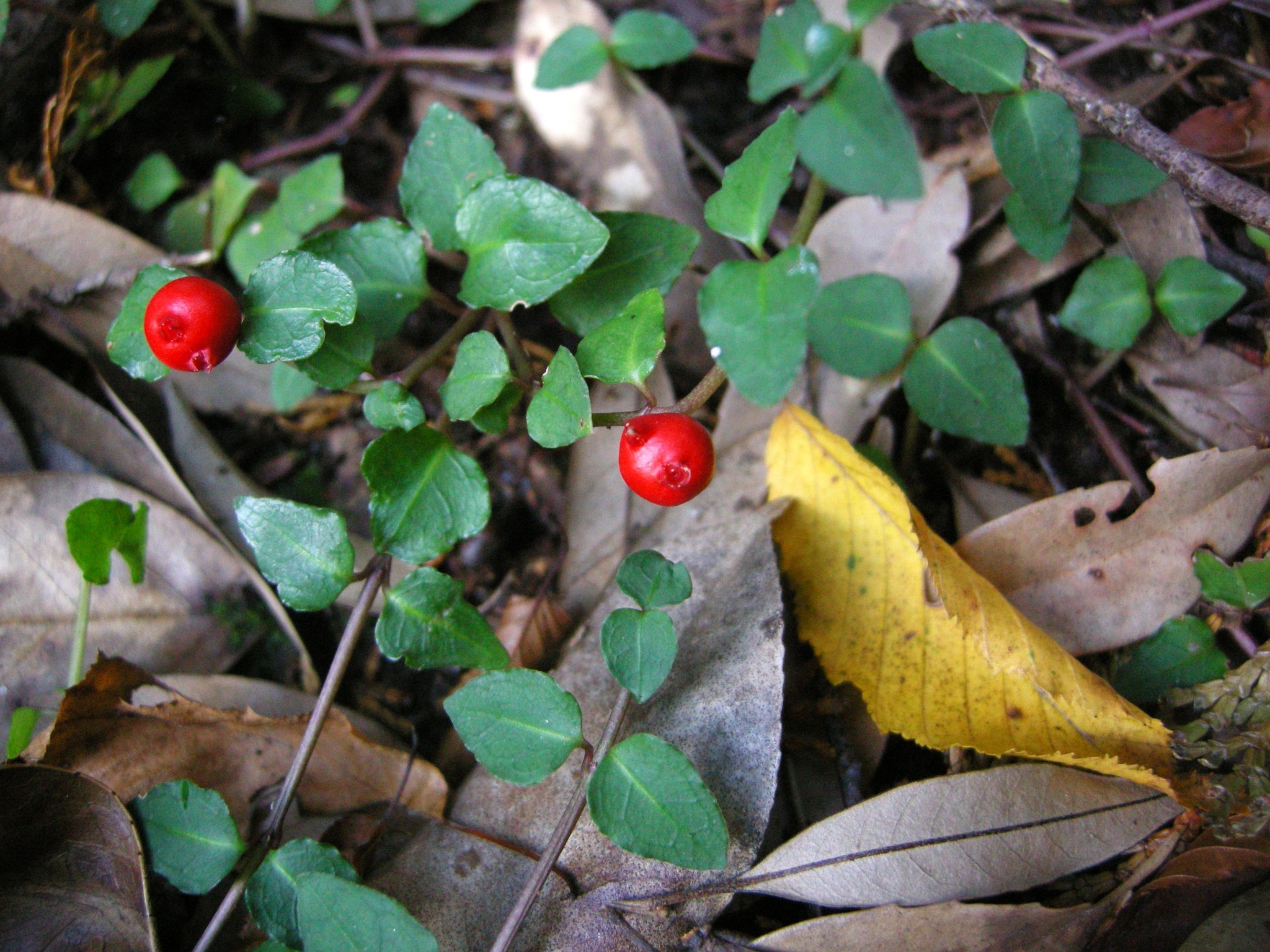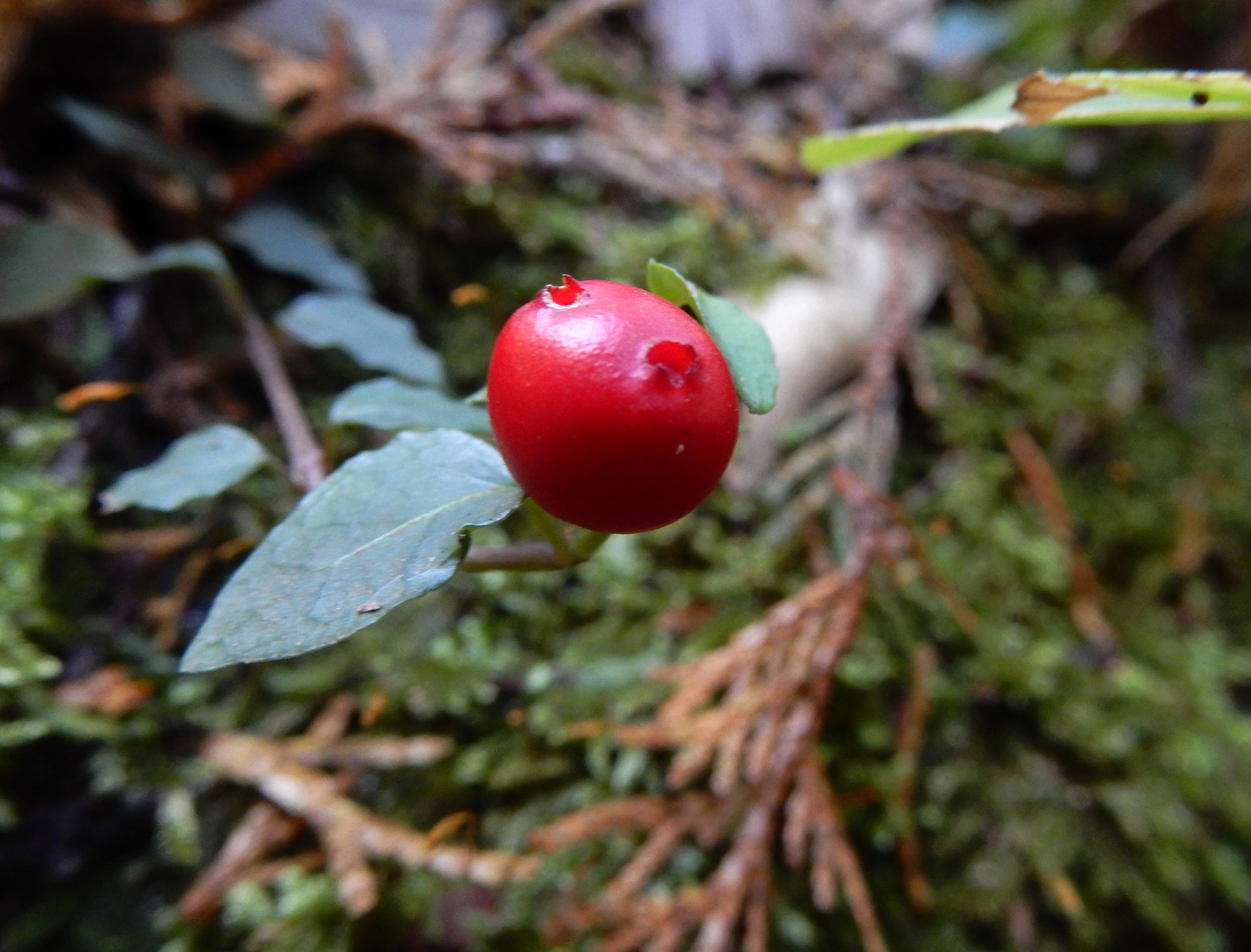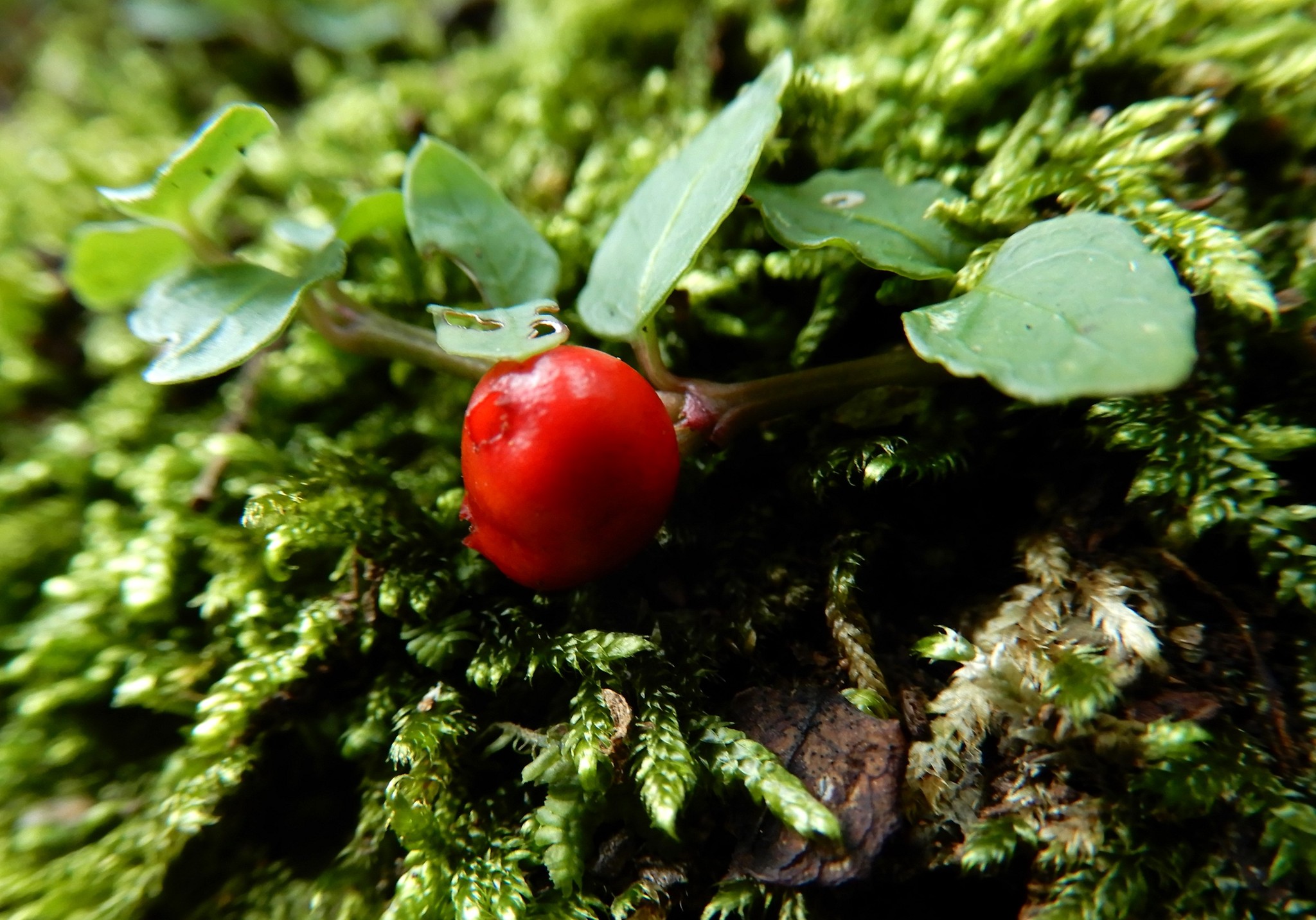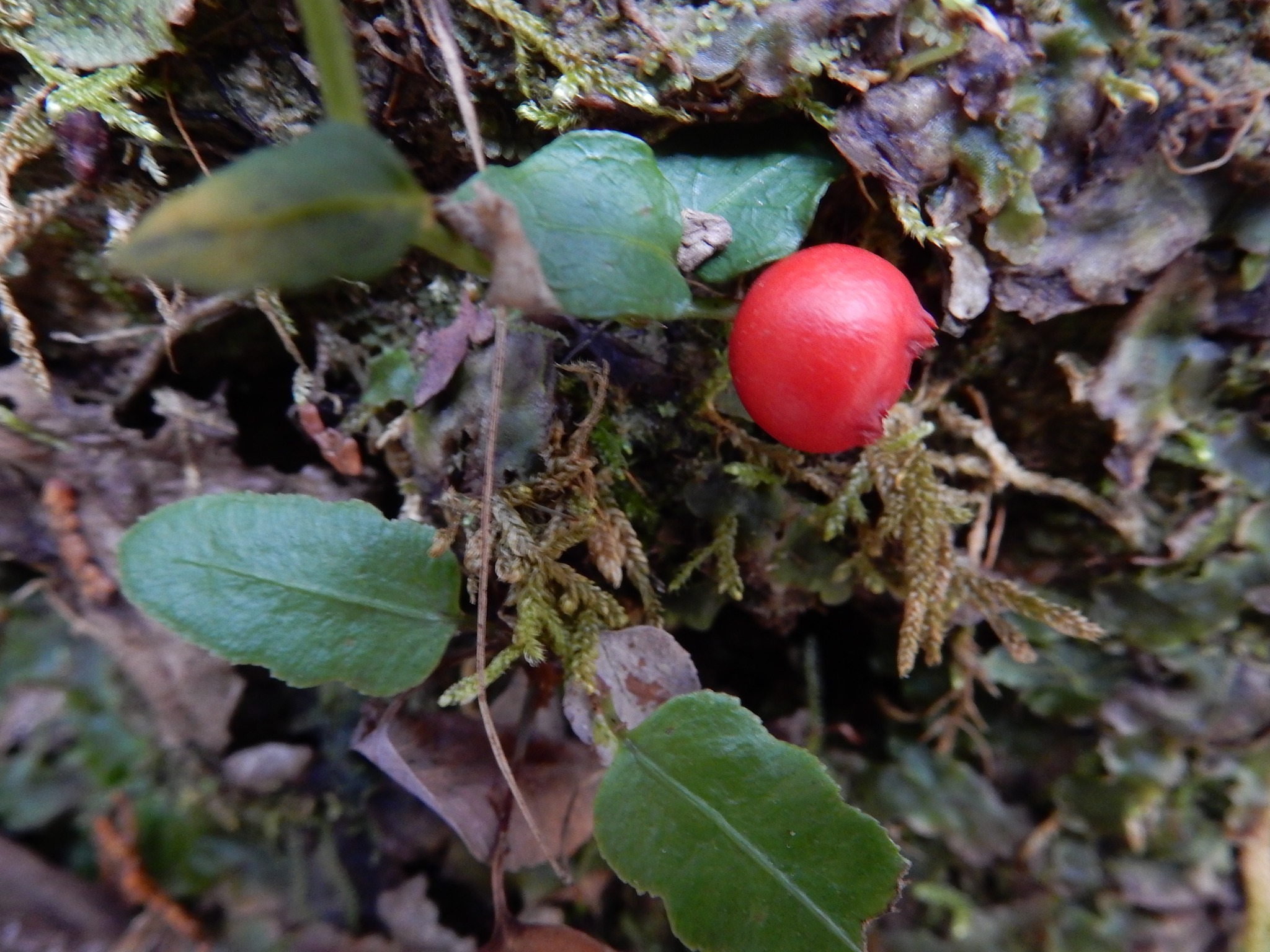 水がしみ出しているような薄暗い斜面がありましたら、探してみて下さい。噴火口の二つある赤い実が見つかるかもしれません。
