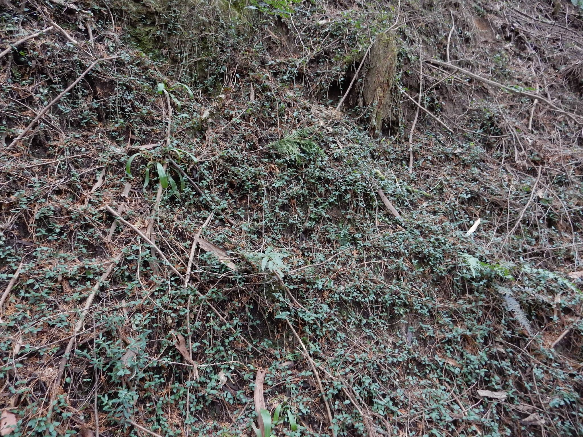 薄暗くて水がしみ出しているような斜面を被うように生えるつる性の多年草です。