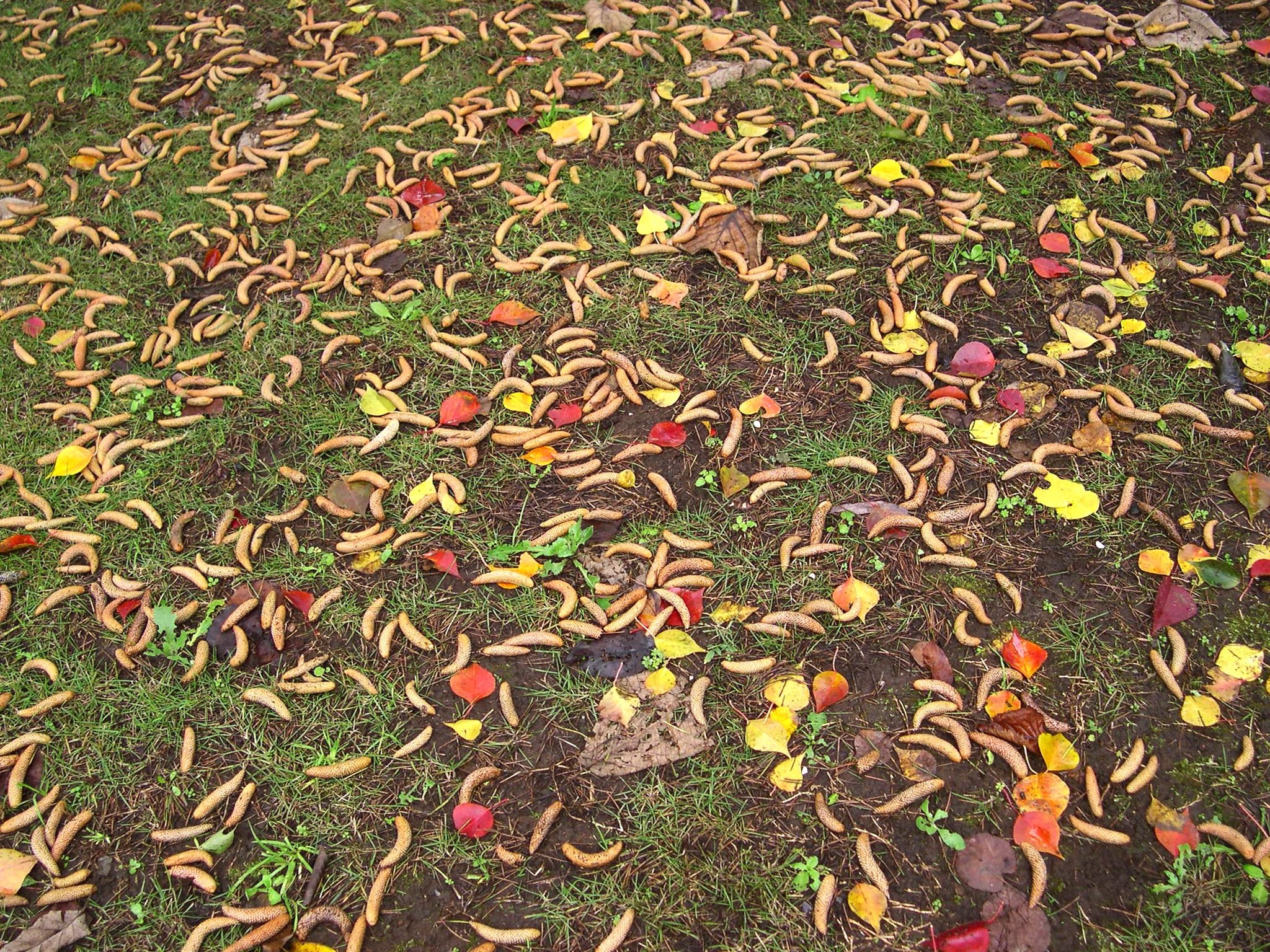 秋に咲く花は、1本の木に雌雄が別々に咲きます。雄花は花粉を散布すると落ちてしまいます。イモムシのように見えて、悲鳴が上がることもあります。雌花は高いところで咲きますので、目にすることは稀なのですが、受粉後、一年をかけて熟す球果はやや長い卵型で、枝の上に直立します。熟した球果はバラバラになって飛散し、稀に発芽します。