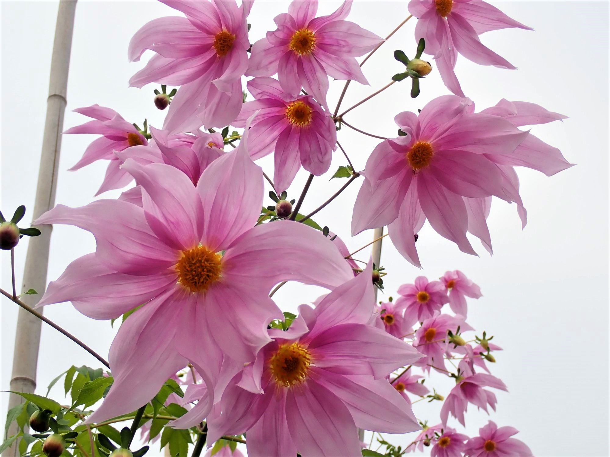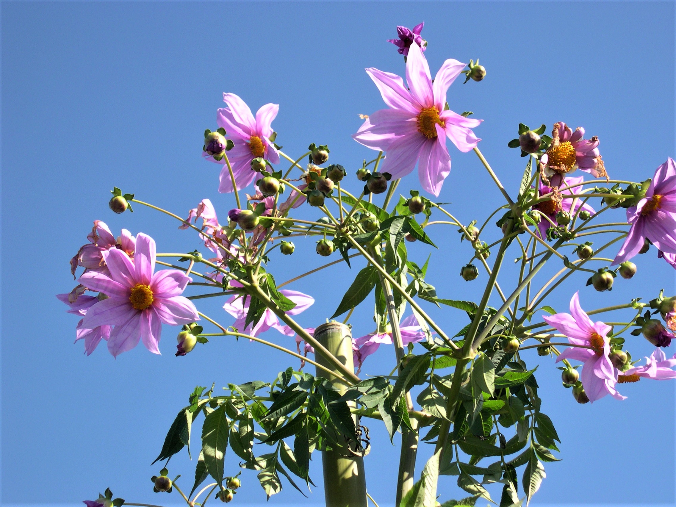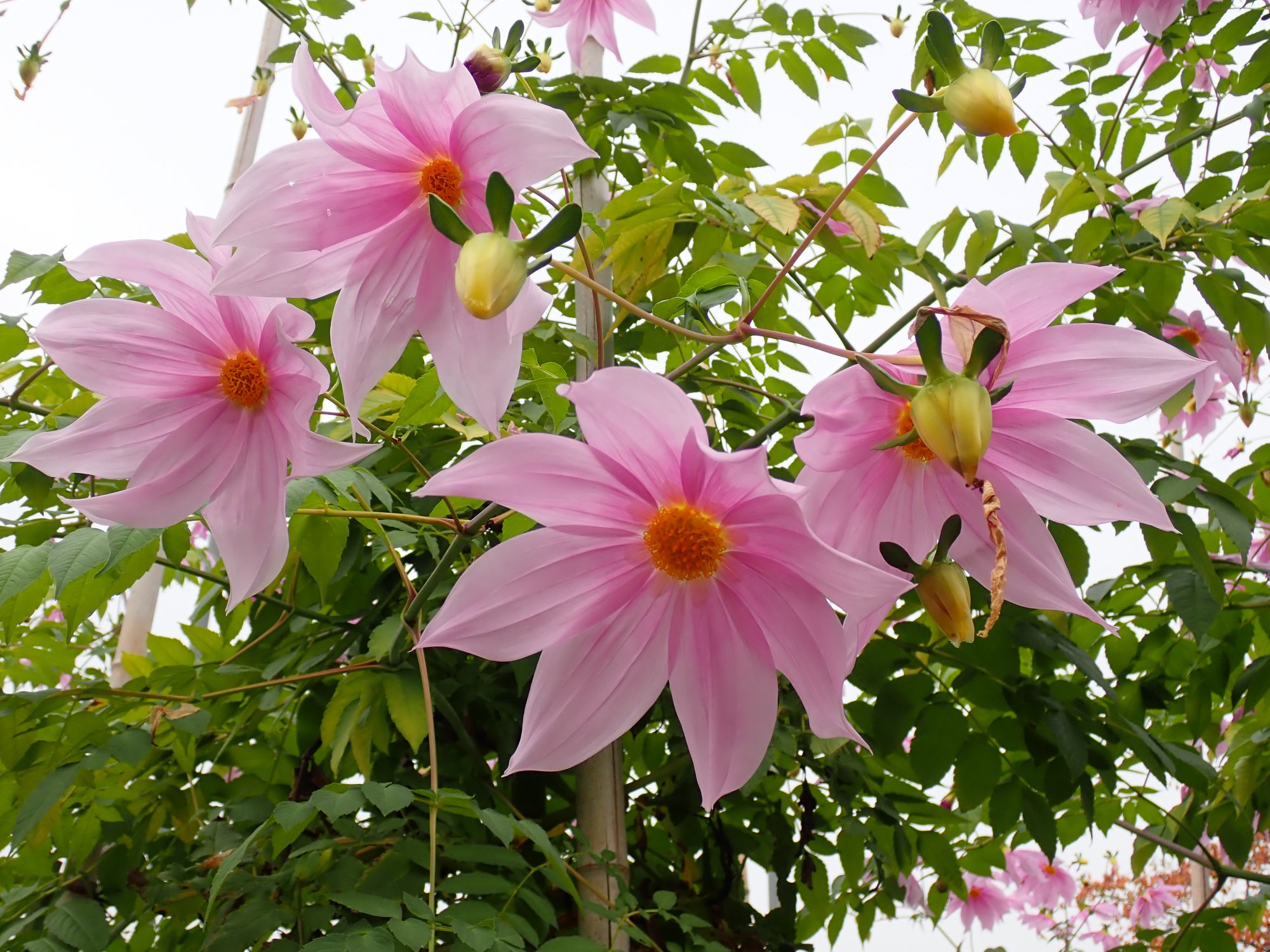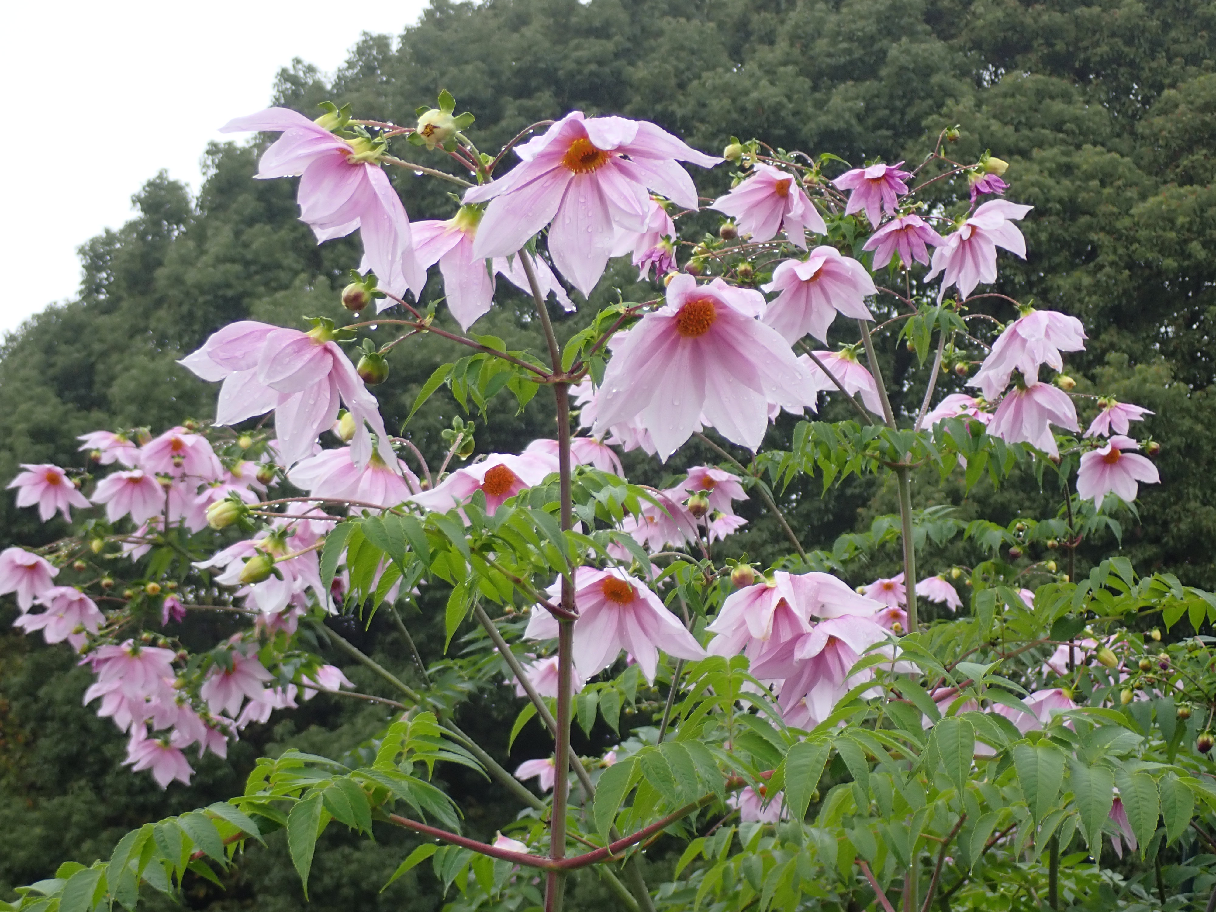 別名コダチダリア(木立ダリア)。木のように草丈の高い多年草です。学名Dahlia imperialisを訳して皇帝ダリアと呼ばれます。大きさ故でしょうか、お庭というよりも植物園や公園で多く見られます。根は浅いので、支柱で支えられている光景を多く見かけます。
