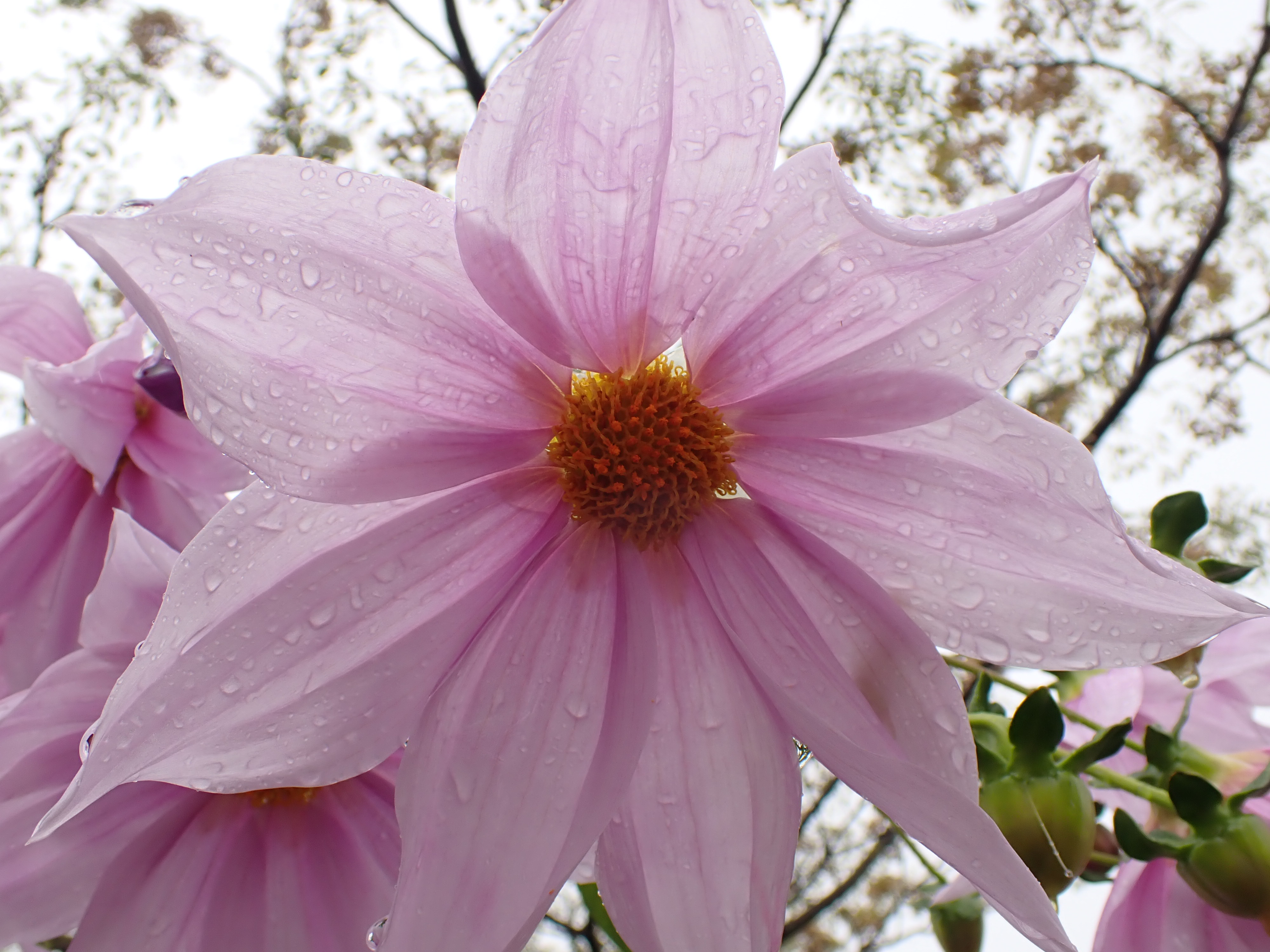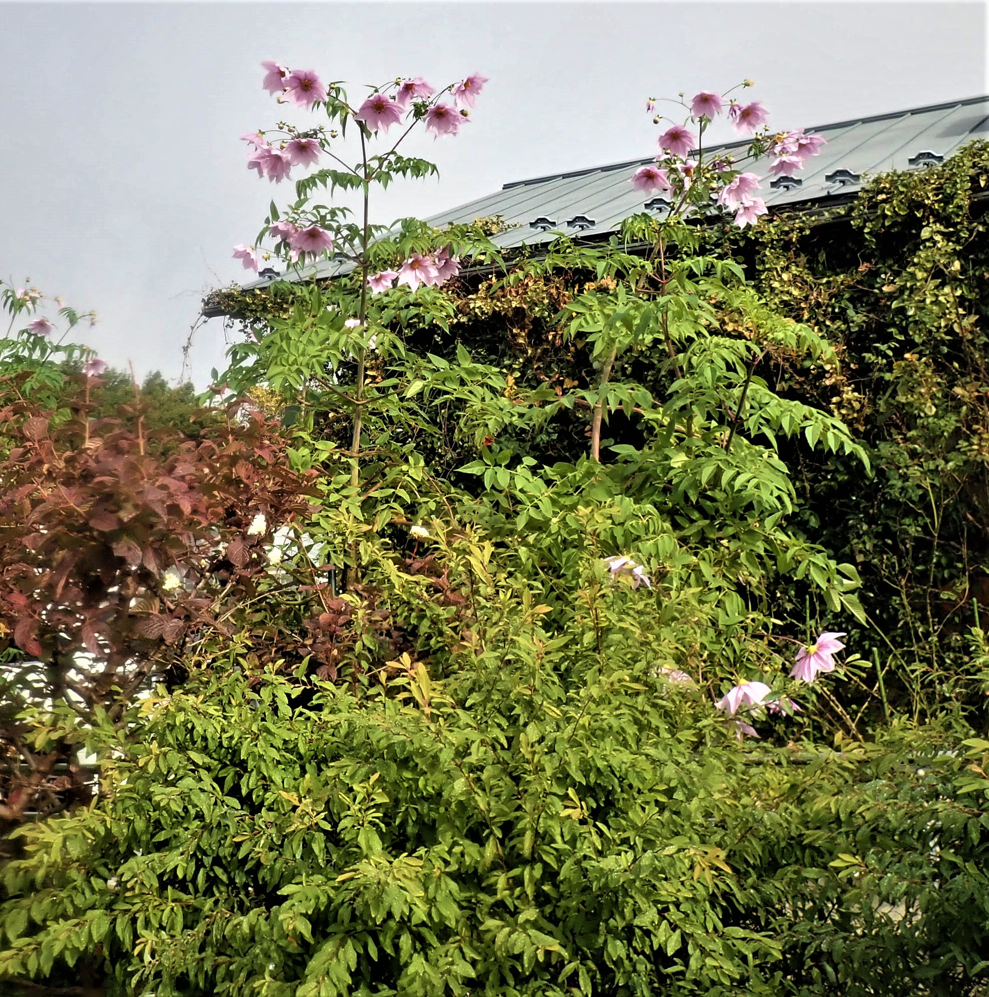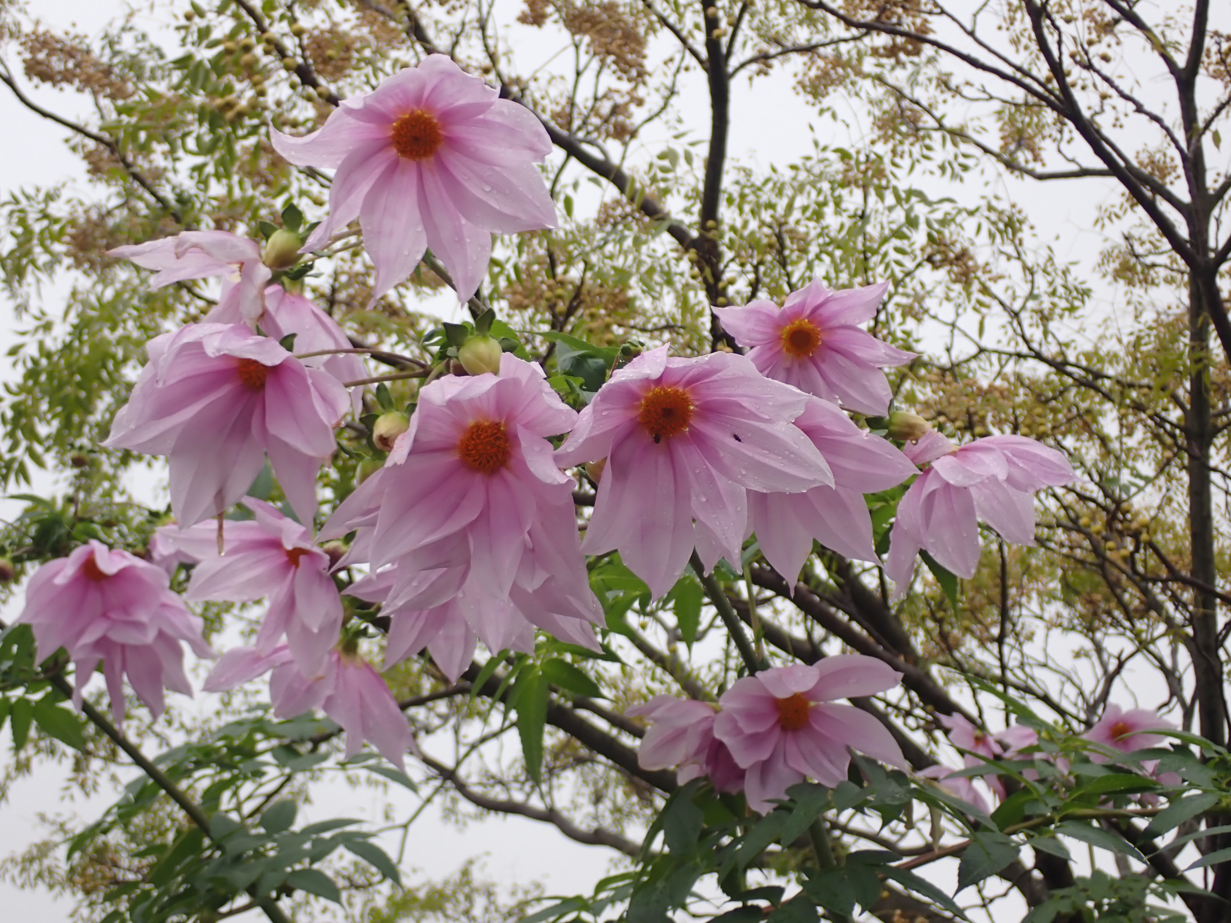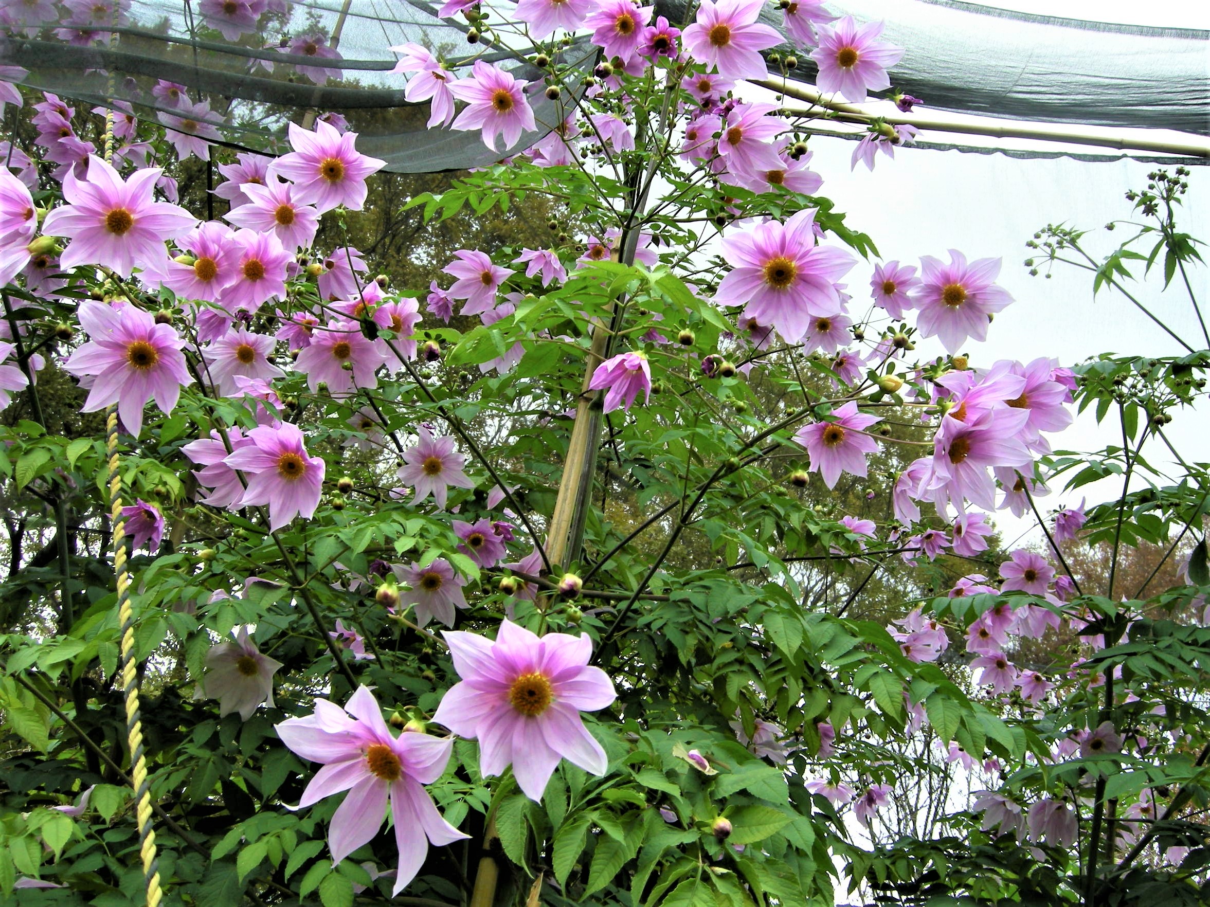 別名コダチダリア(木立ダリア)。木のように草丈の高い多年草です。学名Dahlia imperialisを訳して皇帝ダリアと呼ばれます。大きさ故でしょうか、お庭というよりも植物園や公園で多く見られます。根は浅いので、支柱で支えられている光景を多く見かけます。