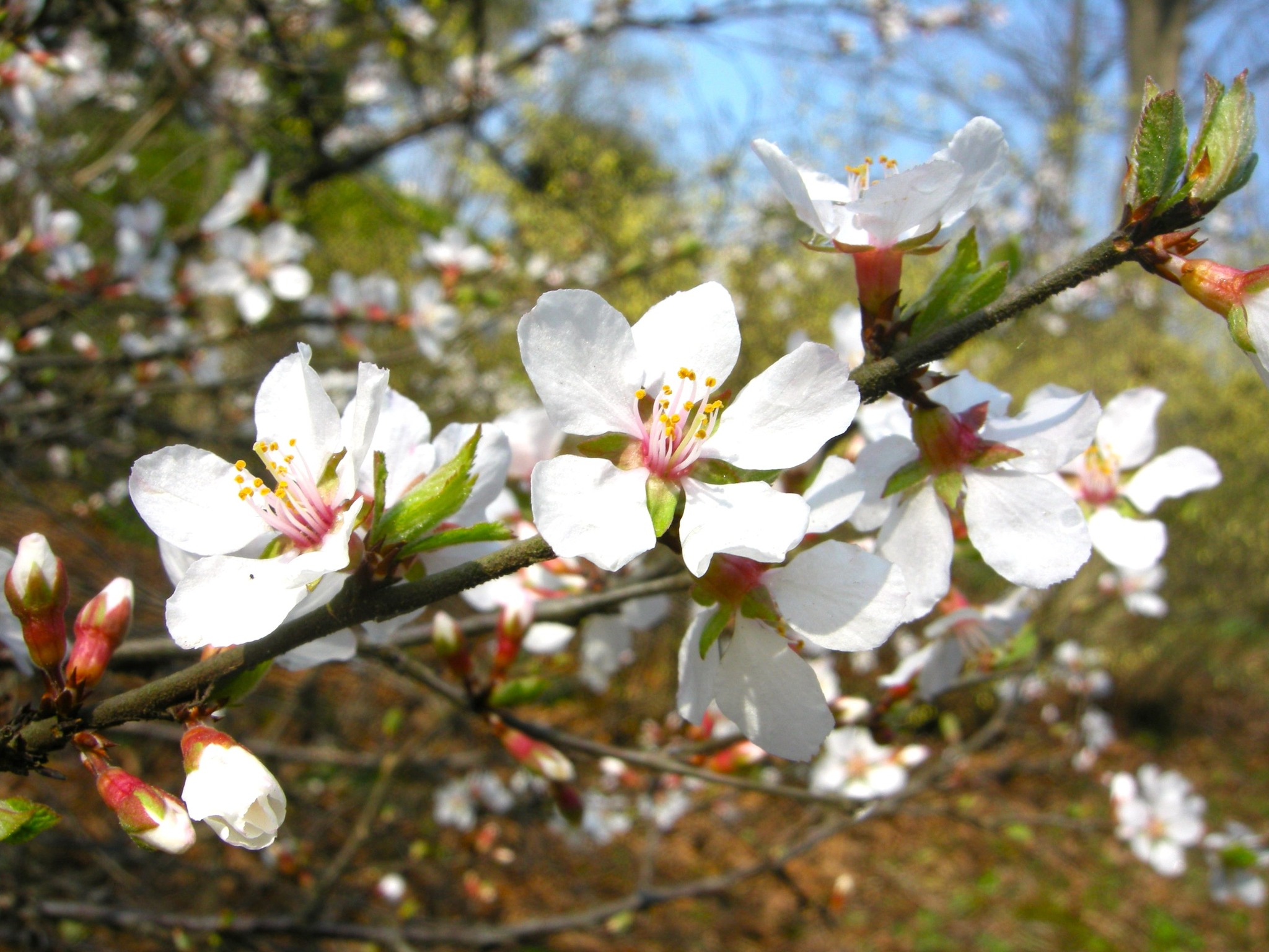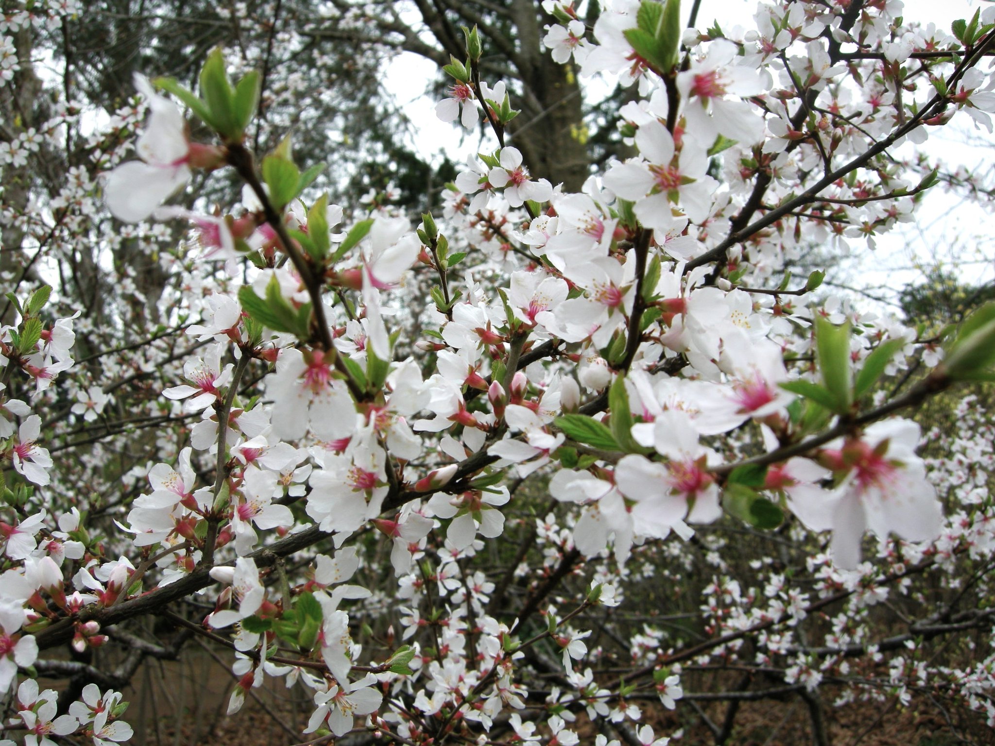 春に咲く花は白~淡紅色で、花柄が短いので、枝に花がまとわりついているように見えて豪華です。