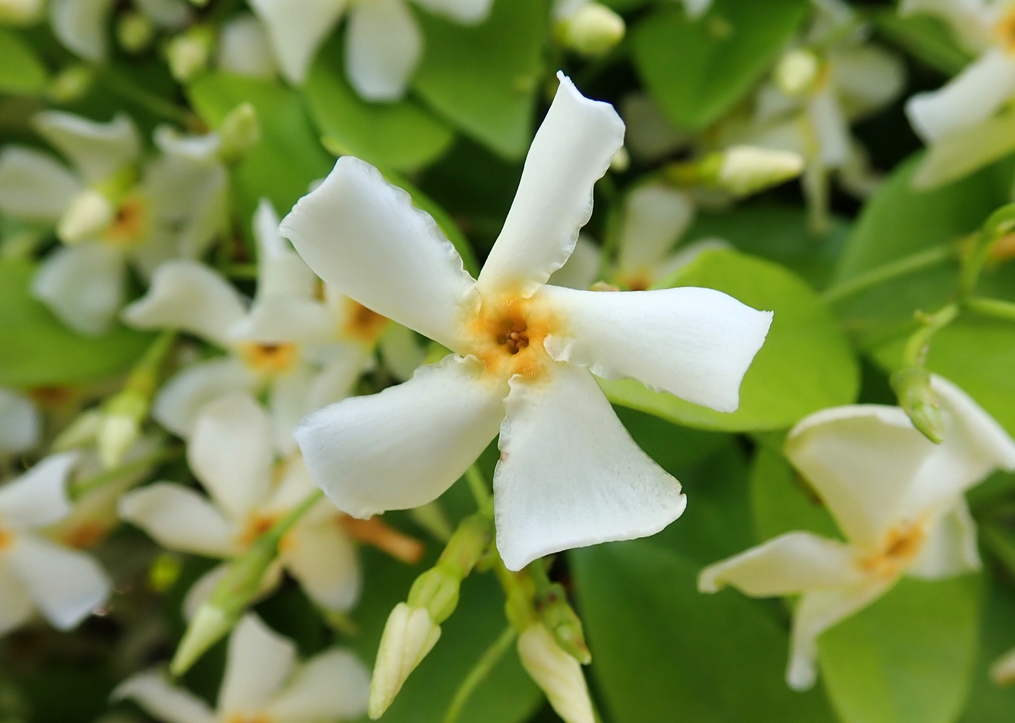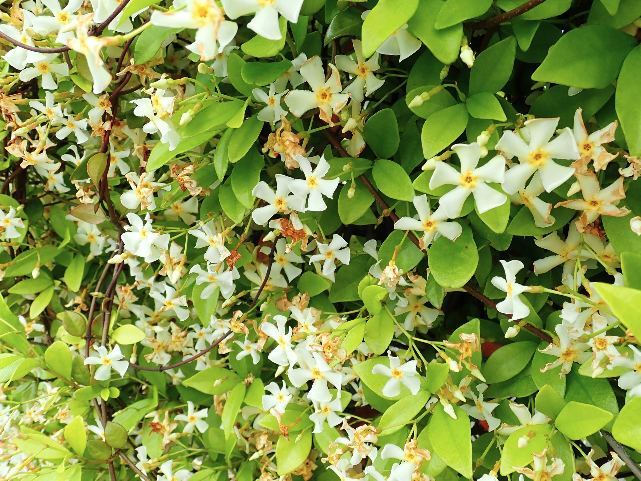 白く咲く花は、時間の経過とともに黄色味を帯びます。