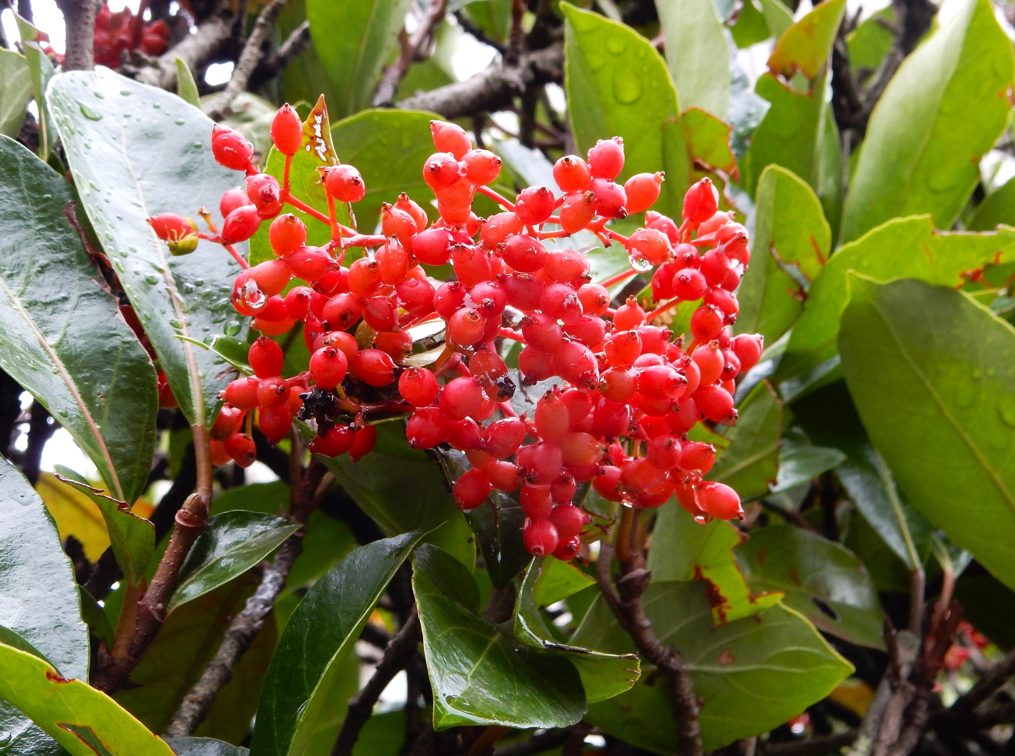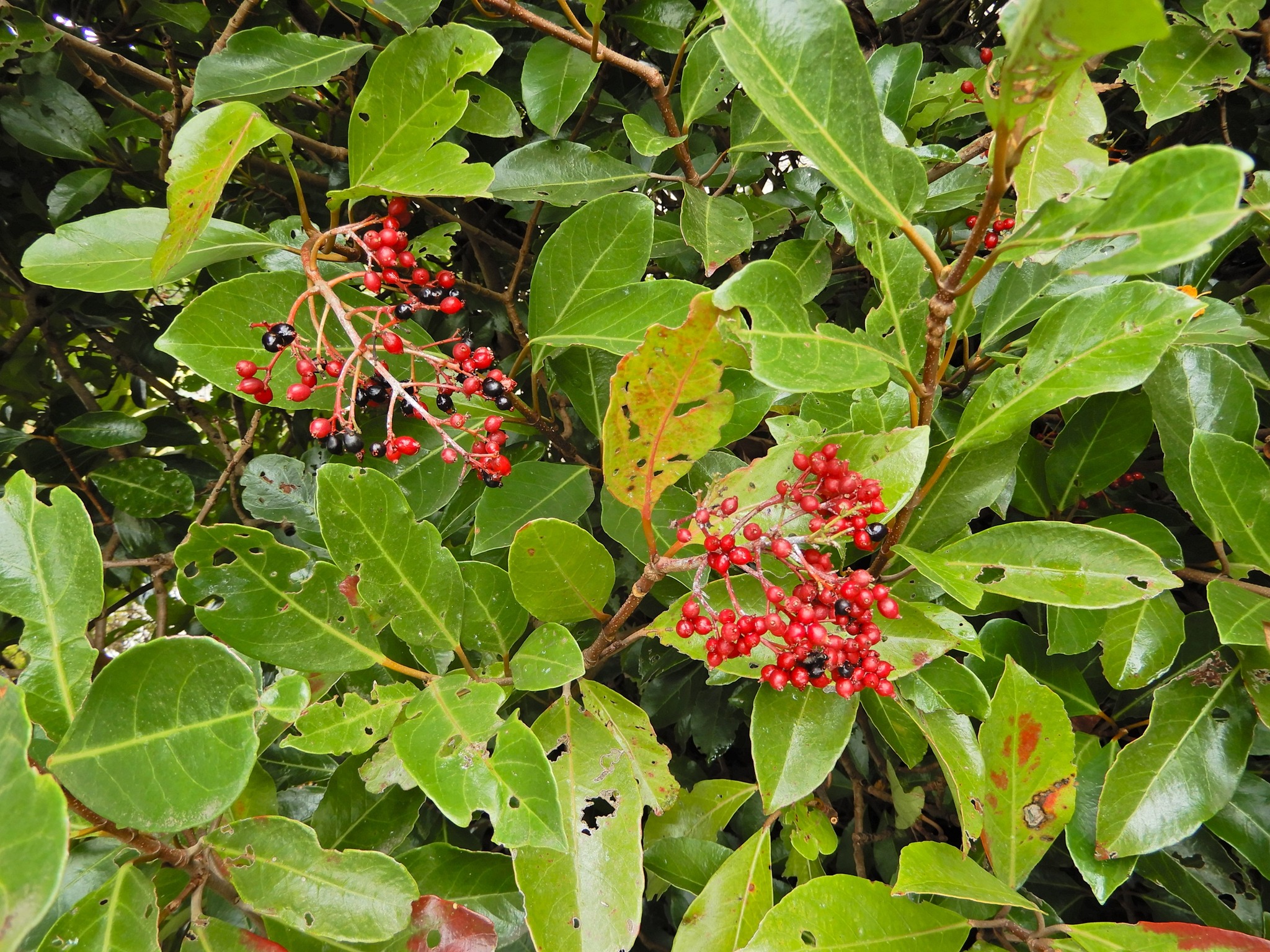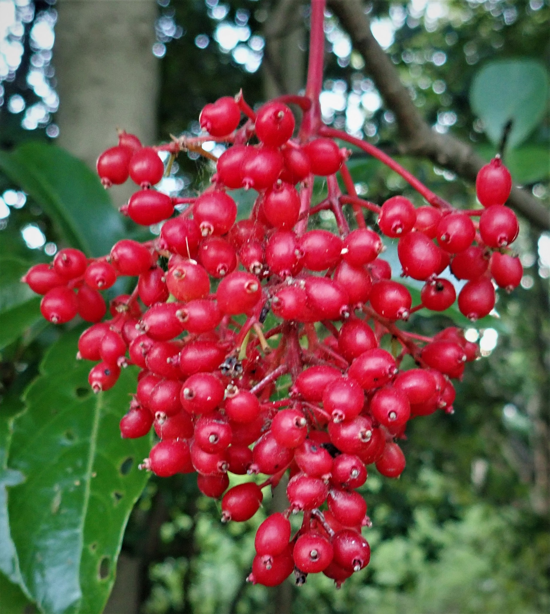 黒く完熟する果実はムクドリ、ヒヨドリ、メジロなどの野鳥の好物で、思いがけない場所から発芽していることがあります。